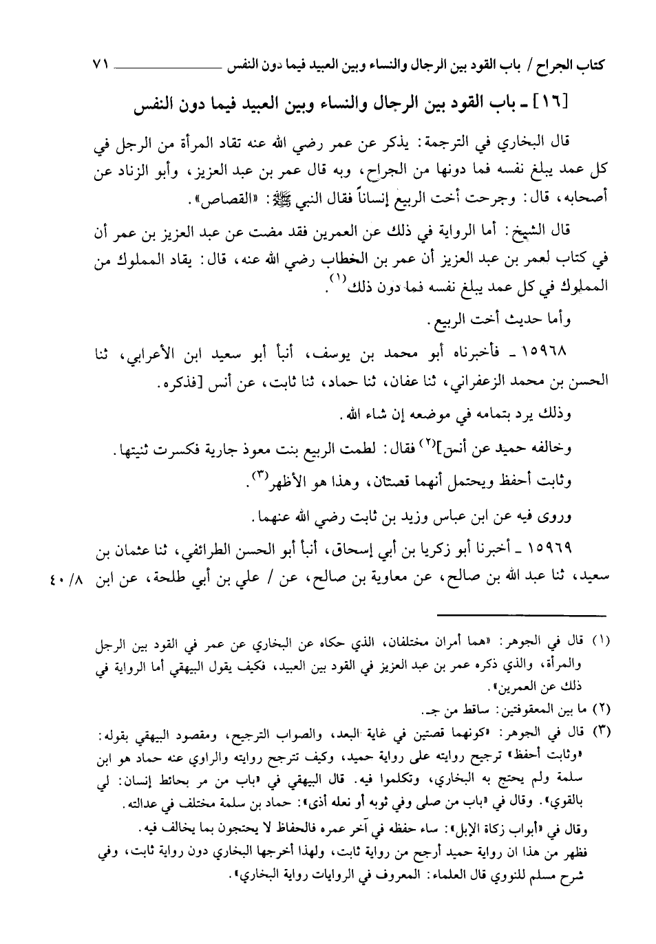 قَالَ الْبُخَارِيُّ فِي التَّرْجَمَةِ: يُذْكَرُ عَنْ عُمَرَ رَضِيَ اللهُ عَنْهُ: تُقَادُ الْمَرْأَةُ مِنَ الرَّجُلِ فِي كُلِّ عَمْدٍ يَبْلُغُ نَفْسَهُ فَمَا دُونَهَا مِنَ الْجِرَاحِ، وَبِهِ قَالَ عُمَرُ بْنُ عَبْدِ الْعَزِيزِ، وَأَبُو الزِّنَادِ عَنْ أَصْحَابِهِ، قَالَ: وَجَرَحَتْ أُخْتُ الرُّبَيِّعِ إِنْسَانًا، فَقَالَ النَّبِيُّ صَلَّى اللهُ عَلَيْهِ وَسَلَّمَ: الْقِصَاصُ قَالَ الشَّيْخُ: أَمَّا الرِّوَايَةُ فِي ذَلِكَ عَنِ الْعُمَرَيْنِ فَقَدْ مَضَتْ عَنْ عَبْدِ الْعَزِيزِ بْنِ عُمَرَ، أَنَّ فِي كِتَابٍ لِعُمَرَ بْنِ عَبْدِ الْعَزِيزِ، أَنَّ عُمَرَ بْنَ الْخَطَّابِ رَضِيَ اللهُ عَنْهُ قَالَ: يُقَادُ الْمَمْلُوكُ مِنَ الْمَمْلُوكِ فِي كُلِّ عَمْدٍ يَبْلُغُ نَفْسَهُ فَمَا دُونَ ذَلِكَ