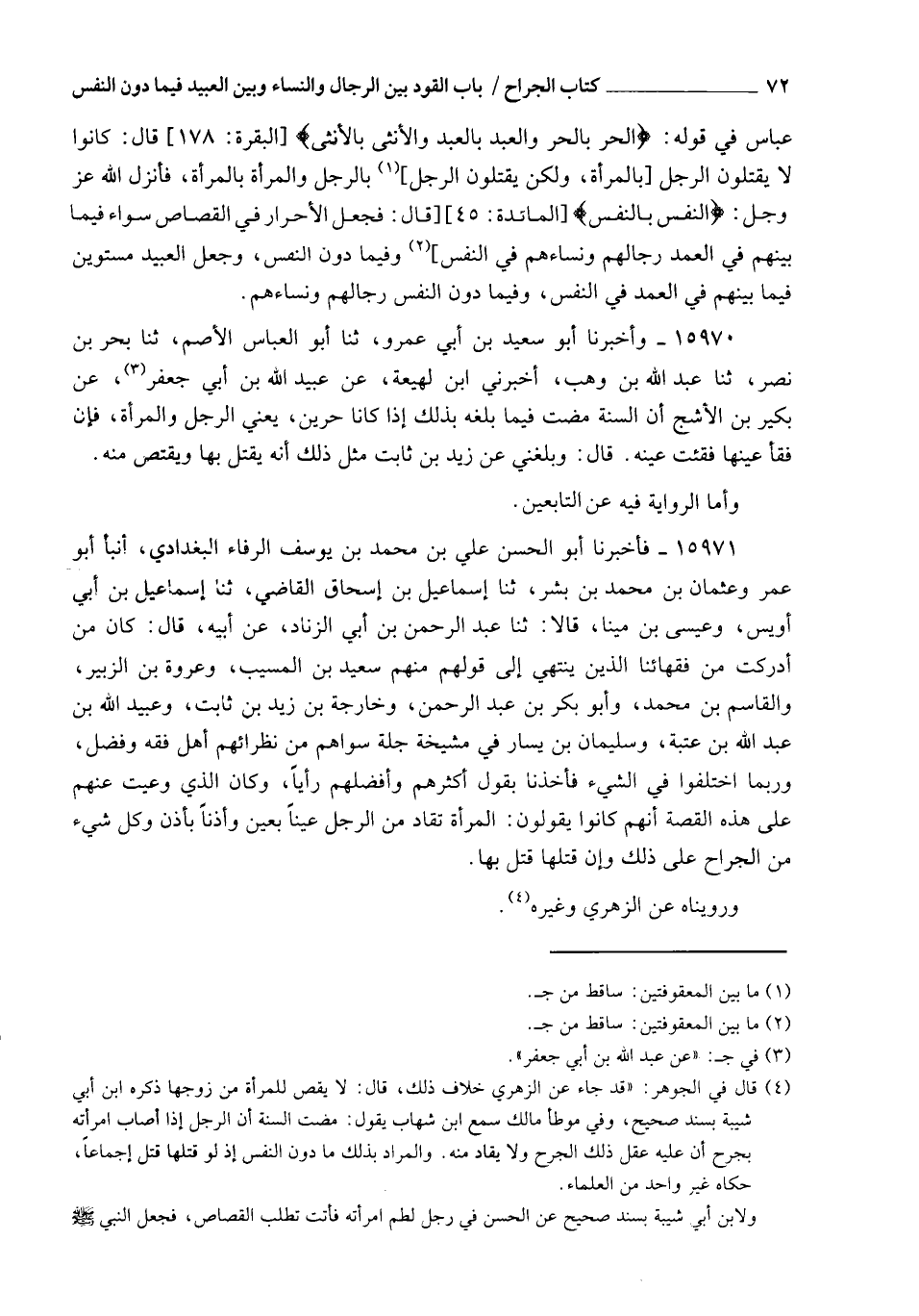 15971 - فَأَخْبَرَنَا أَبُو الْحَسَنِ عَلِيُّ بْنُ مُحَمَّدِ بْنِ يُوسُفَ الرَّفَّاءُ الْبَغْدَادِيُّ، أنبأ أَبُو عَمْرٍو عُثْمَانُ بْنُ مُحَمَّدِ بْنِ بِشْرٍ، ثنا إِسْمَاعِيلُ بْنُ إِسْحَاقَ الْقَاضِي، ثنا إِسْمَاعِيلُ بْنُ أَبِي أُوَيْسٍ، وَعِيسَى بْنُ مِينَا، قَالَا: ثنا عَبْدُ الرَّحْمَنِ بْنُ أَبِي الزِّنَادِ، عَنْ أَبِيهِ، قَالَ: " كَانَ مَنْ أَدْرَكْتُ مِنْ فُقَهَائِنَا الَّذِينَ يُنْتَهَى إِلَى قَوْلِهِمْ مِنْهُمْ سَعِيدُ بْنُ الْمُسَيِّبِ، وَعُرْوَةُ بْنُ الزُّبَيْرِ، وَالْقَاسِمُ بْنُ مُحَمَّدٍ، وَأَبُو بَكْرِ بْنُ عَبْدِ الرَّحْمَنِ، وَخَارِجَةُ بْنُ زَيْدِ بْنِ ثَابِتٍ، وَعُبَيْدُ اللهِ بْنُ عَبْدِ اللهِ بْنِ عُتْبَةَ وَسُلَيْمَانُ بْنُ يَسَارٍ، فِي مَشْيَخَةٍ جُلَّةُ سِوَاهُمْ مِنْ نُظَرَائِهِمْ أَهْلُ فِقْهٍ وَفَضْلٍ، وَرُبَّمَا اخْتَلَفُوا فِي الشَّيْءِ فَأَخَذْنَا بِقَوْلِ أَكْثَرِهِمْ وَأَفْضَلِهِمْ رَأْيًا وَكَانَ الَّذِي وَعَيْتُ عَنْهُمْ عَلَى هَذِهِ الْقِصَّةِ، أَنَّهُمْ كَانُوا يَقُولُونَ: §الْمَرْأَةُ تُقَادُ مِنَ الرَّجُلِ عَيْنًا بِعَيْنٍ، وَأُذُنًا بِأُذُنٍ، وَكُلُّ شَيْءٍ مِنَ الْجِرَاحِ عَلَى ذَلِكَ، وَإِنْ قَتَلَهَا قُتِلَ بِهَا " وَرُوِّينَاهُ عَنِ الزُّهْرِيِّ وَغَيْرِهِ
