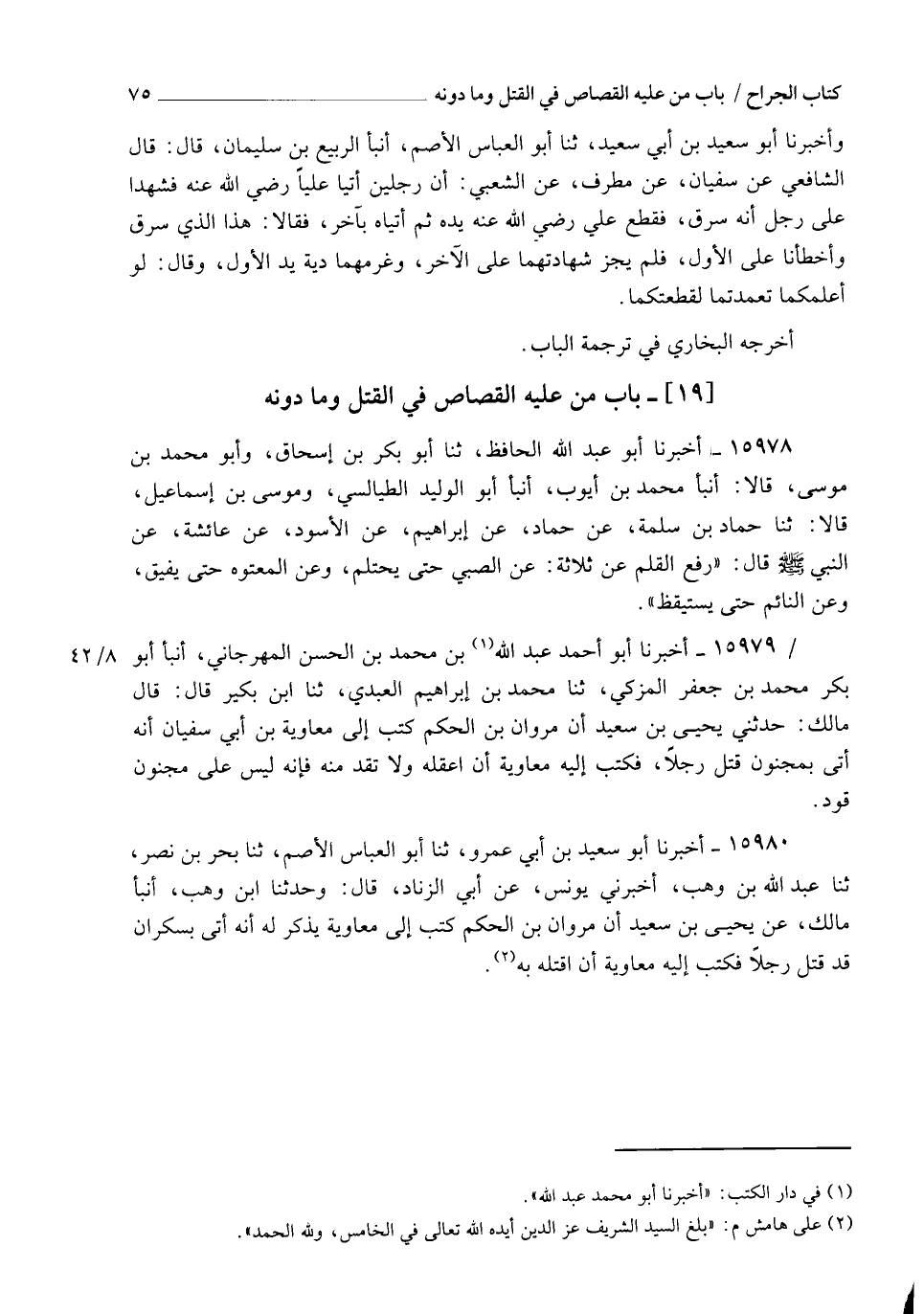 15979 - أَخْبَرَنَا أَبُو أَحْمَدَ عَبْدُ اللهِ بْنُ مُحَمَّدِ بْنِ الْحَسَنِ الْمِهْرَجَانِيُّ، أنبأ أَبُو بَكْرٍ مُحَمَّدُ بْنُ جَعْفَرٍ الْمُزَكِّي، ثنا مُحَمَّدُ بْنُ إِبْرَاهِيمَ الْعَبْدِيُّ، ثنا ابْنُ بُكَيْرٍ، قَالَ: قَالَ مَالِكٌ، حَدَّثَنِي يَحْيَى بْنُ سَعِيدٍ، أَنَّ مَرْوَانَ بْنَ الْحَكَمِ، كَتَبَ إِلَى مُعَاوِيَةَ بْنِ أَبِي سُفْيَانَ أَنَّهُ §أُتِيَ بِمَجْنُونٍ قَتَلَ رَجُلًا، فَكَتَبَ إِلَيْهِ مُعَاوِيَةُ أَنِ اعْقِلْهُ وَلَا تُقِدْ مِنْهُ، فَإِنَّهُ لَيْسَ عَلَى مَجْنُونٍ قَوَدٌ
