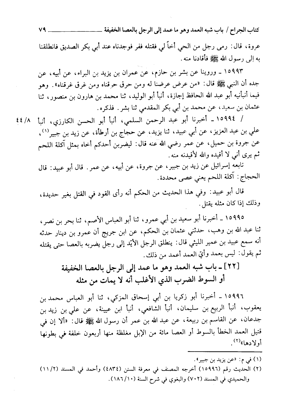 15994 - أَخْبَرَنَا أَبُو عَبْدِ الرَّحْمَنِ السُّلَمِيُّ، أنبأ أَبُو الْحَسَنِ الْكَارِزِيُّ، أنبأ عَلِيُّ بْنُ عَبْدِ الْعَزِيزِ، عَنْ أَبِي عُبَيْدٍ، ثنا يَزِيدُ، عَنْ حَجَّاجِ بْنِ أَرْطَاةَ، عَنْ زَيْدِ بْنِ جُبَيْرٍ، عَنْ جَرْوَةَ بْنِ حَمِيلٍ، عَنْ عُمَرَ، رَضِيَ اللهُ عَنْهُ، قَالَ: §لَيَضْرِبَنَّ أَحَدُكُمْ أَخَاهُ بِمِثْلِ آكِلَةِ اللَّحْمِ، ثُمَّ يَرَى أَنِّي لَا أُقِيدُهُ وَاللهِ لَأُقِيدَنَّهُ مِنْهُ تَابَعَهُ إِسْرَائِيلُ عَنْ زَيْدِ بْنِ جُبَيْرٍ، عَنْ جَرْوَةَ، عَنْ أَبِيهِ، عَنْ عُمَرَ قَالَ أَبُو عُبَيْدٍ: قال يزيد قَالَ الْحَجَّاجُ: آكِلَةُ اللَّحْمِ يَعْنِي عَصًا مُحَدَّدَةً قَالَ أَبُو عُبَيْدٍ: وَفِي هَذَا الْحَدِيثِ مِنَ الْحُكْمِ أَنَّهُ رَأَى الْقَوَدَ فِي الْقَتْلِ بِغَيْرِ حَدِيدَةٍ، وَذَلِكَ إِذَا كَانَ مِثْلُهُ يَقْتُلُ