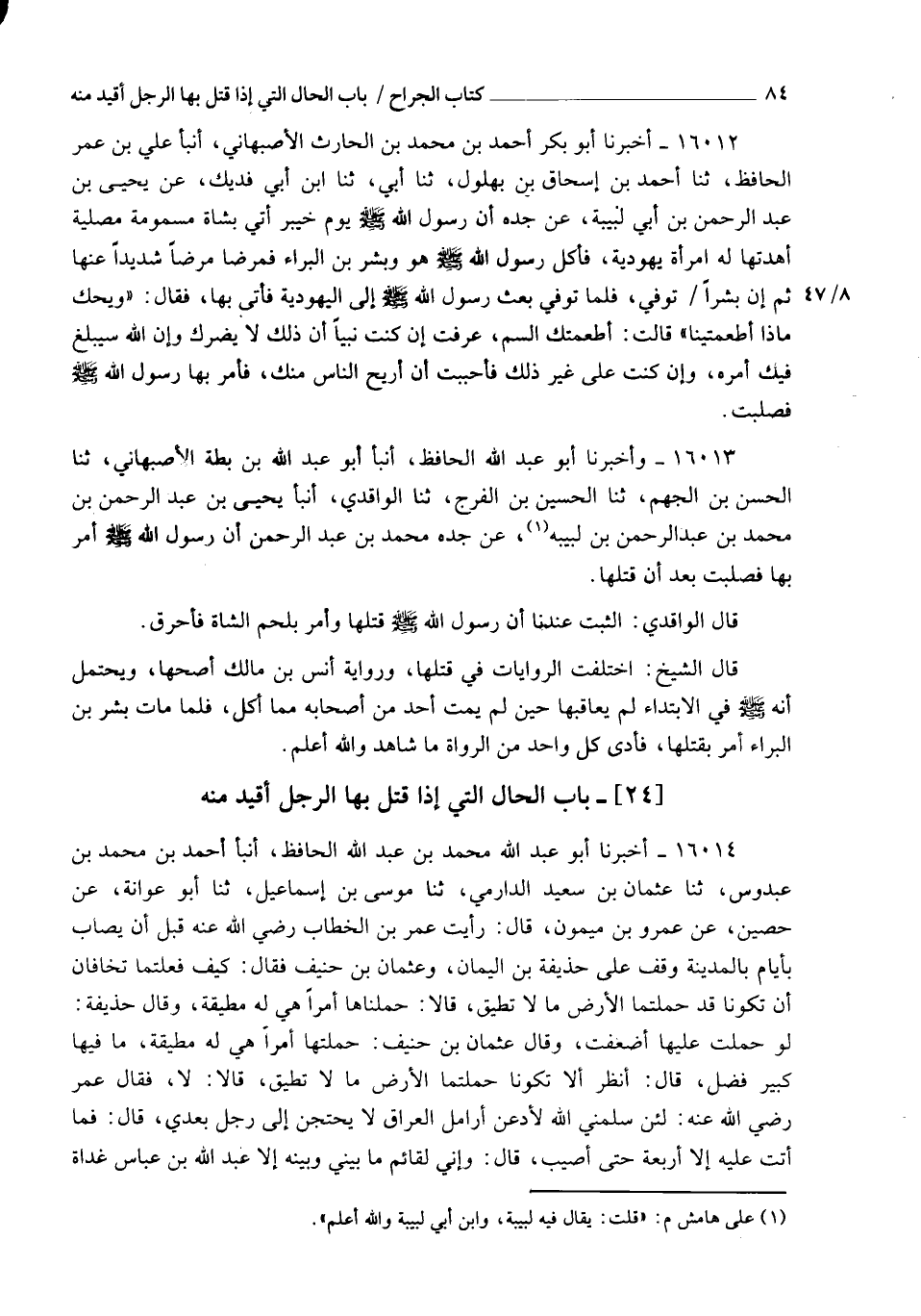 16013 - وَأَخْبَرَنَا أَبُو عَبْدِ اللهِ الْحَافِظُ، أنبأ أَبُو عَبْدِ اللهِ بْنُ بَطَّةَ الْأَصْبَهَانِيُّ، ثنا الْحَسَنُ بْنُ الْجَهْمِ، ثنا الْحُسَيْنُ بْنُ الْفَرَجِ، ثنا الْوَاقِدِيُّ، أنبأ يَحْيَى بْنُ عَبْدِ الرَّحْمَنِ بْنِ مُحَمَّدِ بْنِ عَبْدِ الرَّحْمَنِ بْنِ لَبِيبَةَ، عَنْ جَدِّهِ مُحَمَّدِ بْنِ عَبْدِ الرَّحْمَنِ، أَنَّ رَسُولَ اللهِ صَلَّى اللهُ عَلَيْهِ وَسَلَّمَ أَمَرَ بِهَا فَصُلِبَتْ بَعْدَ أَنْ قَتَلَهَا قَالَ الْوَاقِدِيُّ: الثَّبْتُ عِنْدَنَا أَنَّ رَسُولَ اللهِ صَلَّى اللهُ عَلَيْهِ وَسَلَّمَ قَتَلَهَا وَأَمَرَ بِلَحْمِ الشَّاةِ فَأُحْرِقَ قَالَ الشَّيْخُ: اخْتَلَفَتِ الرِّوَايَاتُ فِي قَتْلِهَا، وَرِوَايَةُ أَنَسِ بْنِ مَالِكٍ أَصَحُّهَا، وَيُحْتَمَلُ أَنَّهُ صَلَّى اللهُ عَلَيْهِ وَسَلَّمَ فِي الِابْتِدَاءِ لَمْ يُعَاقِبْهَا حِينَ لَمْ يمُتْ أَحَدٌ مِنْ أَصْحَابِهِ مِمَّا أَكَلَ، فَلَمَّا مَاتَ بِشْرُ بْنُ الْبَرَاءِ أَمَرَ بِقَتْلِهَا، فَأَدَّى كُلُّ وَاحِدٍ مِنَ الرُّوَاةِ مَا شَاهَدَ، وَاللهُ أَعْلَمُ