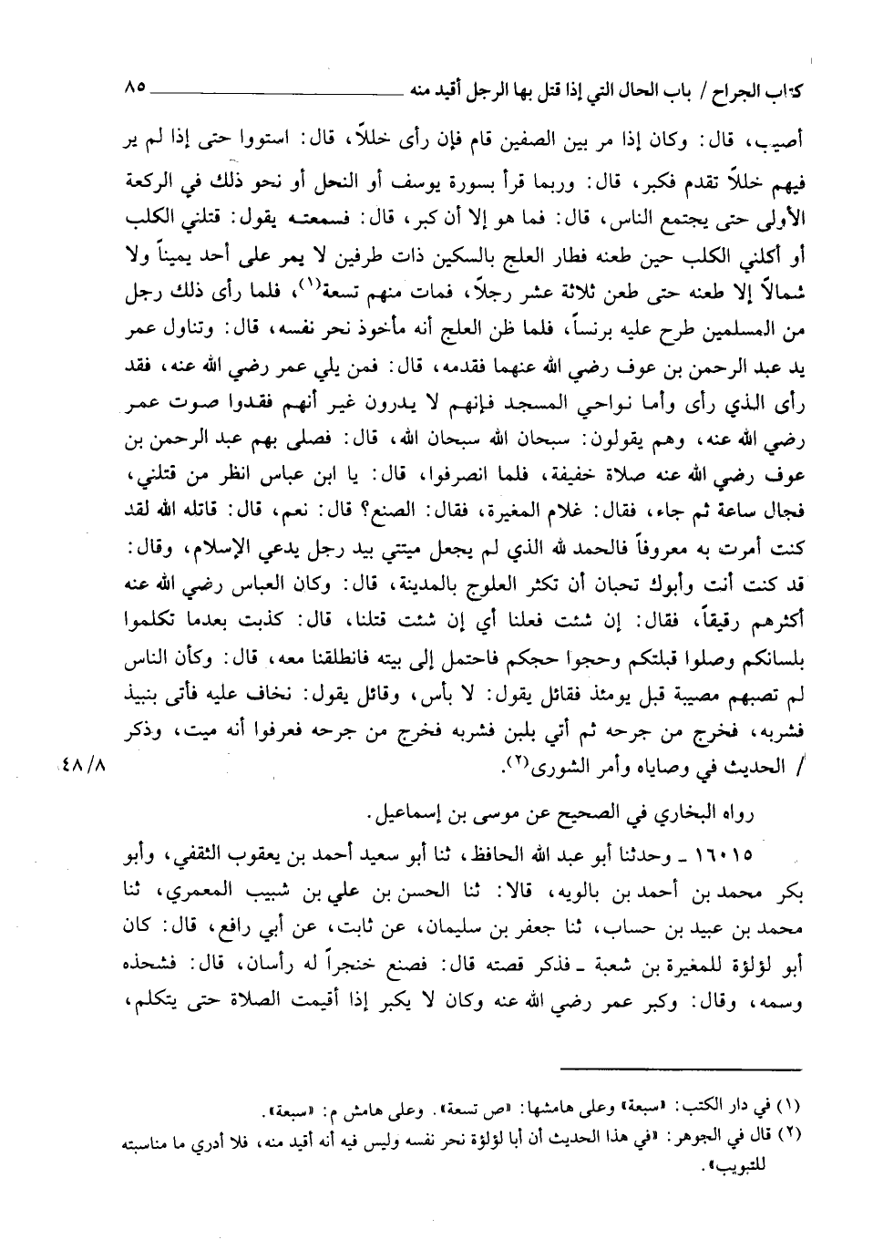 16015 - وَحَدَّثَنَا أَبُو عَبْدِ اللهِ الْحَافِظُ، ثنا أَبُو سَعِيدٍ أَحْمَدُ بْنُ يَعْقُوبَ الثَّقَفِيُّ، وَأَبُو بَكْرٍ مُحَمَّدُ بْنُ أَحْمَدَ بْنِ بَالَوَيْهِ، قَالَا: ثنا الْحَسَنُ بْنُ عَلِيِّ بْنِ شَبِيبٍ الْمَعْمَرِيُّ، ثنا مُحَمَّدُ بْنُ عُبَيْدِ بْنِ حِسَابٍ، ثنا جَعْفَرُ بْنُ سُلَيْمَانَ، عَنْ ثَابِتٍ، عَنْ أَبِي رَافِعٍ، قَالَ: كَانَ أَبُو لُؤْلُؤَةَ لِلْمُغِيرَةِ بْنِ شُعْبَةَ، فَذَكَرَ قِصَّتَهُ، قَالَ: فَصَنَعَ خِنْجَرًا لَهُ رَأْسَانِ قَالَ: فَشَحَذَهُ وَسَمَّهُ وَقَالَ: وَكَبَّرَ عُمَرُ رَضِيَ اللهُ عَنْهُ، وَكَانَ لَا يُكَبِّرُ إِذَا أُقِيمَتِ الصَّلَاةُ حَتَّى يَتَكَلَّمَ -[86]- وَيَقُولَ: §أَقِيمُوا صُفُوفَكُمْ فَجَاءَ فَقَامَ فِي الصَّفِّ بِحِذَائِهِ ممَّا يَلِي عُمَرَ رَضِيَ اللهُ عَنْهُ فِي صَلَاةِ الْغَدَاةِ، فَلَمَّا كَبَّرَ وَجَأَهُ عَلَى كَتِفِهِ، وَعَلَى مَكَانٍ آخَرَ، وَفِي خَاصِرَتِهِ، فَسَقَطَ عُمَرُ رَضِيَ اللهُ عَنْهُ، وَوَجَأَ ثَلَاثَةَ عَشَرَ رَجُلًا مَعَهُ، فَأَفْرَقَ مِنْهُمْ سَبْعَةً وَمَاتَ سِتَّةٌ، وَاحْتُمِلَ عُمَرُ رَضِيَ اللهُ عَنْهُ فَذُهِبَ بِهِ، وَذَكَرَ الْحَدِيثَ، قَالَ: فَدَعَا بِشَرَابٍ لَيَنْظُرَ مَا مَدَى جُرْحِهِ، فَأُتِيَ بِنَبِيذٍ فَشَرِبَهُ فَخَرَجَ، فَلَمْ يدْرِ أَدَمٌ هُوَ أَوْ نَبِيذٌ، فَدَعَا بِلَبَنٍ فَأُتِيَ بِهِ فَشَرِبَهُ فَخَرَجَ مِنْ جُرْحِهِ قَالُوا: لَا بَأْسَ عَلَيْكَ يَا أَمِيرَ الْمُؤْمِنِينَ قَالَ: إِنْ يَكُنِ الْقَتْلُ بَأْسًا فَقَدْ قُتِلْتُ