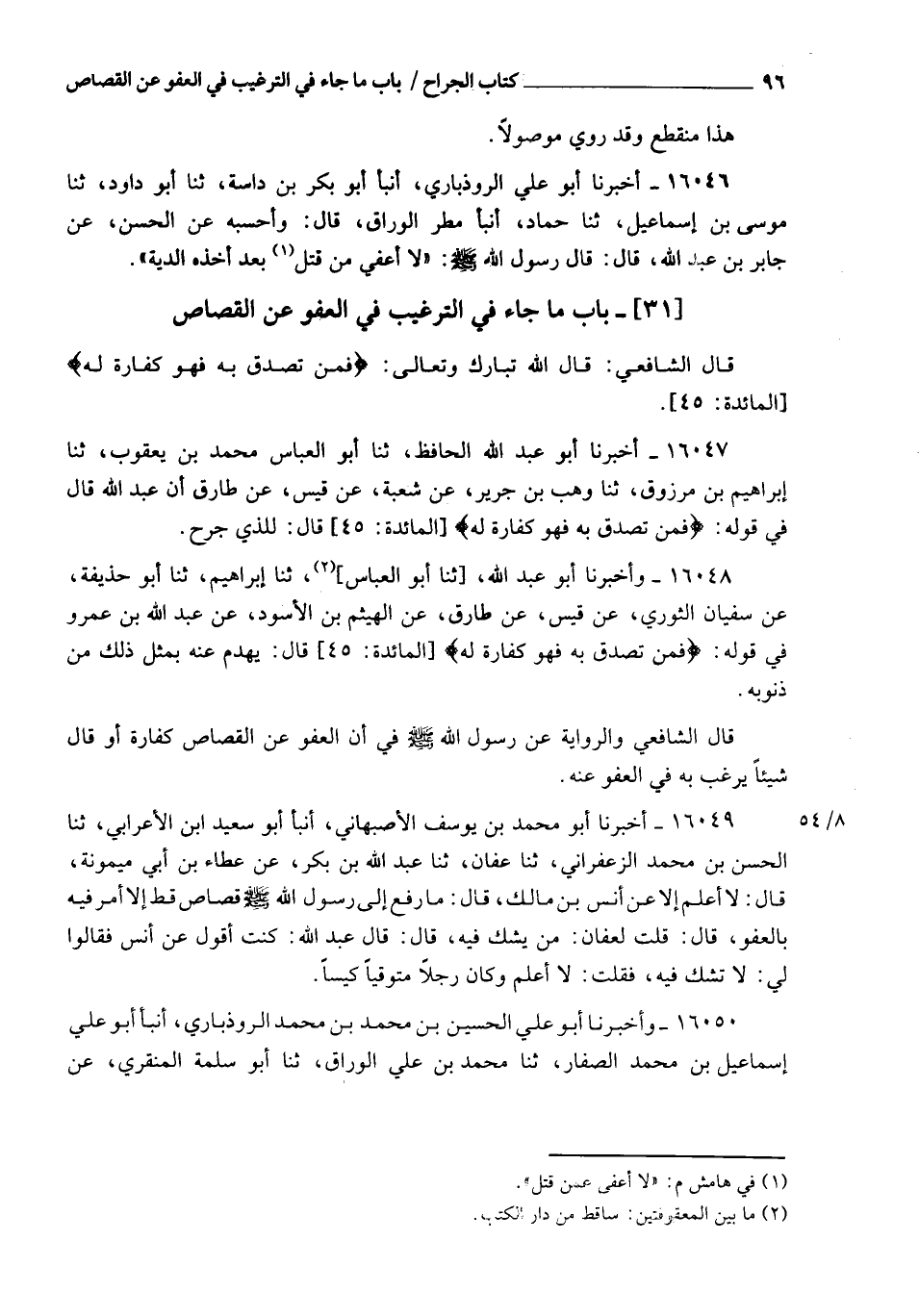 31 - §بَابُ مَا جَاءَ فِي التَّرْغِيبِ فِي الْعَفْوِ عَنِ الْقِصَاصِ قَالَ الشَّافِعِيُّ: قَالَ اللهُ تَبَارَكَ وَتَعَالَى: {فَمَنْ تَصَدَّقَ بِهِ فَهُوَ كَفَّارَةٌ لَهُ}