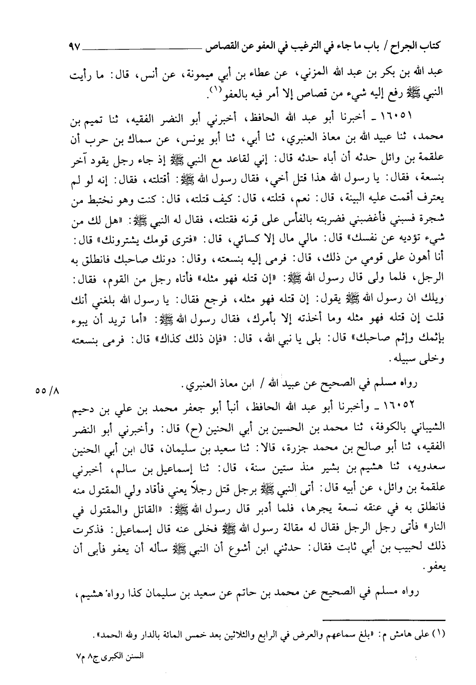 16052 - وَأَخْبَرَنَا أَبُو عَبْدِ اللهِ الْحَافِظُ، أنبأ أَبُو جَعْفَرٍ مُحَمَّدُ بْنُ عَلِيِّ بْنِ دُحَيْمٍ الشَّيْبَانِيُّ، بِالْكُوفَةِ، ثنا مُحَمَّدُ بْنُ الْحُسَيْنِ بْنِ أَبِي الْحُنَيْنِ، ح، قَالَ: وَأَخْبَرَنِي أَبُو النَّضْرِ الْفَقِيهُ، ثنا أَبُو عَلِيٍّ صَالِحُ بْنُ مُحَمَّدٍ جَزْرَةُ، قَالَا: ثنا سَعِيدُ بْنُ سُلَيْمَانَ، قَالَ ابْنُ أَبِي الْحُنَيْنِ: سَعْدَوَيْهِ: ثنا هُشَيْمُ بْنُ بَشِيرٍ، مُنْذُ سِتِّينَ سَنَةً، قَالَ: ثنا إِسْمَاعِيلُ بْنُ سَالِمٍ، أَخْبَرَنِي عَلْقَمَةُ بْنُ وَائِلٍ، عَنْ أَبِيهِ، قَالَ: أُتِيَ النَّبِيَّ صَلَّى اللهُ عَلَيْهِ وَسَلَّمَ بِرَجُلٍ قَتَلَ رَجُلًا، يَعْنِي فَأَقَادَ وَلِيَّ الْمَقْتُولِ مِنْهُ، فَانْطَلَقَ بِهِ فِي عُنُقِهِ نِسْعَةٌ يَجُرُّهَا، فَلَمَّا أَدْبَرَ قَالَ رَسُولُ اللهِ صَلَّى اللهُ عَلَيْهِ وَسَلَّمَ: §" الْقَاتِلُ وَالْمَقْتُولُ فِي النَّارِ " فَأَتَى رَجُلٌ الرَّجُلَ فَقَالَ لَهُ مَقَالَةَ رَسُولِ اللهِ صَلَّى اللهُ عَلَيْهِ وَسَلَّمَ فَخَلَّى عَنْهُ قَالَ إِسْمَاعِيلُ: فَذَكَرْتُ ذَلِكَ لِحَبِيبِ بْنِ أَبِي ثَابِتٍ فَقَالَ: حَدَّثَنِي ابْنُ أَشْوَعَ أَنَّ النَّبِيَّ صَلَّى اللهُ عَلَيْهِ وَسَلَّمَ سَأَلَهُ أَنْ يَعْفُوَ فَأَبَى أَنْ يَعْفُوَ رَوَاهُ مُسْلِمٌ فِي الصَّحِيحِ، عَنْ مُحَمَّدِ بْنِ حَاتِمٍ، عَنْ سَعِيدِ بْنِ سُلَيْمَانَ كَذَا رَوَاهُ هُشَيْمٌ، -[98]- وَرَوَاهُ أَبُو عَوَانَةَ عَنْ إِسْمَاعِيلَ، وَقَالَ فِيهِ: فَذَكَرْتُ ذَلِكَ لِابْنِ أَشْوَعَ فَقَالَ ابْنُ أَشْوَعَ: ذَكَرْتُ ذَلِكَ لِحَبِيبٍ فَقَالَ حَبِيبٌ: إِنَّ النَّبِيَّ صَلَّى اللهُ عَلَيْهِ وَسَلَّمَ كَانَ أَمَرَهُ بِالْعَفْوِ، وَرُوِيَ عَنْ سَعِيدِ بْنِ جُبَيْرٍ عَنِ النَّبِيِّ صَلَّى اللهُ عَلَيْهِ وَسَلَّمَ فِي هَذَا الْحَدِيثِ مُرْسَلًا، قَالَ: يَا رَسُولَ اللهِ قَتَلَ أَخِي فَهُوَ فِي النَّارِ، فَإِنْ قَتَلْتُهُ فَأَنَا مِثْلُهُ؟ قَالَ: قَتَلَ أَخَاكَ فَهُوَ فِي النَّارِ، وَأَمَرْتُكَ فَعَصَيْتَنِي فَأَنْتَ فِي النَّارِ إِنْ عَصَيْتَنِي وَقَدْ قِيلَ: إِنَّمَا قَالَ ذَلِكَ؛ لِأَنَّ الْقَاتِلَ قَالَ: وَاللهِ مَا أَرَدْتُ قَتْلَهُ، وَذَلِكَ فِي حَدِيثِ أَبِي هُرَيْرَةَ: فَإِنْ كَانَ صَادِقًا فَقَتَلْتَهُ وَأَنْتَ تَعْلَمُ صِدْقَهُ فَأَنْتَ مِثْلُهُ وَالَّذِي قَالَهُ حَبِيبٌ أَوِ ابْنُ أَشْوَعَ بَيِّنٌ