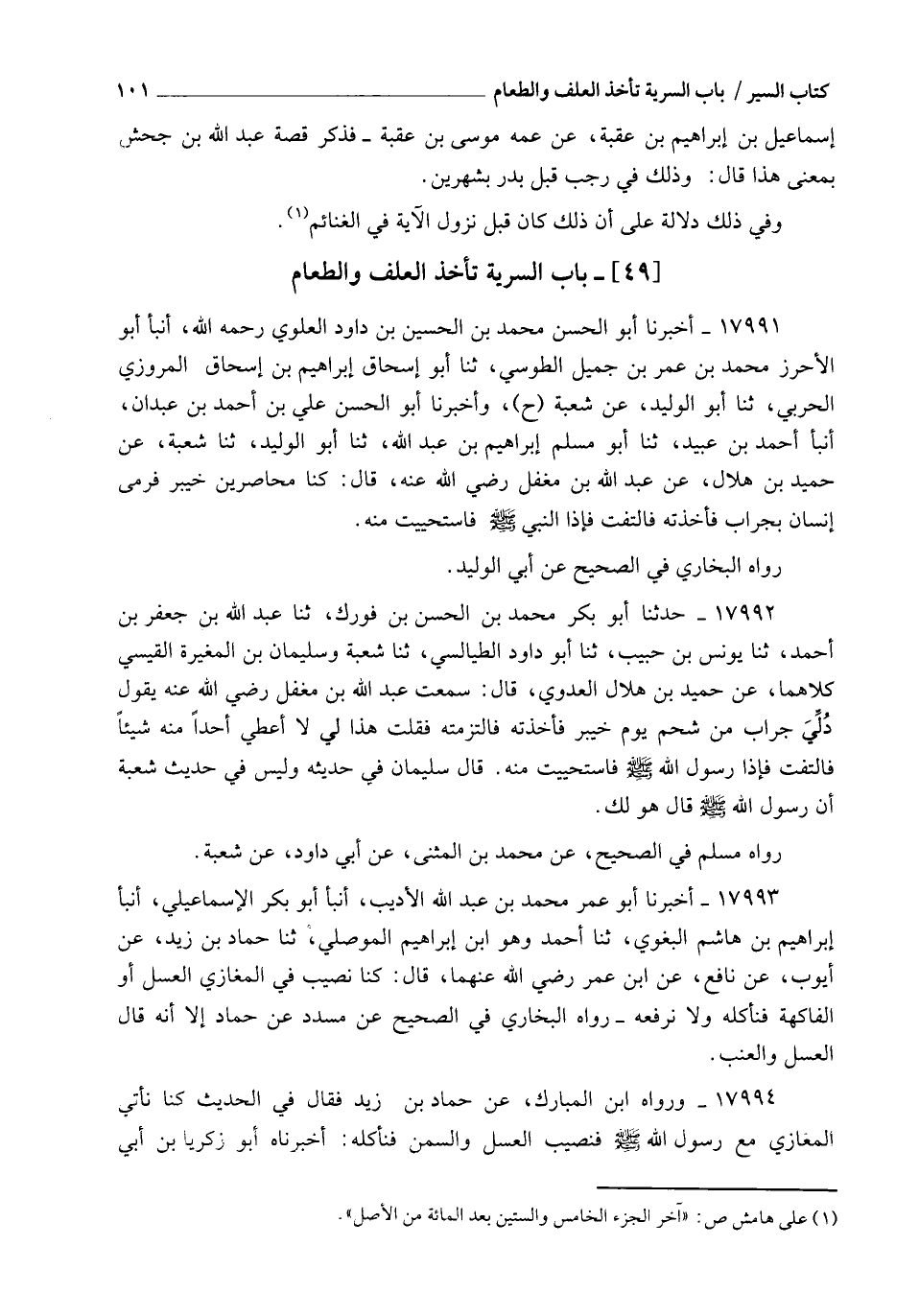 17993 - أَخْبَرَنَا أَبُو عَمْرٍو مُحَمَّدُ بْنُ عَبْدِ اللهِ الْأَدِيبُ، أنبأ أَبُو بَكْرٍ الْإِسْمَاعِيلِيُّ، أنبأ إِبْرَاهِيمُ بْنُ هَاشِمٍ الْبَغَوِيُّ، ثنا أَحْمَدُ وَهُوَ ابْنُ إِبْرَاهِيمَ الْمَوْصِلِيُّ، ثنا حَمَّادُ بْنُ زَيْدٍ، عَنْ أَيُّوبَ، عَنْ نَافِعٍ، عَنِ ابْنِ عُمَرَ رَضِيَ اللهُ عَنْهُمَا، قَالَ: §" كُنَّا نُصِيبُ فِي الْمَغَازِي الْعَسَلَ أَوِ الْفَاكِهَةَ فَنَأْكُلُهُ وَلَا نَرْفَعُهُ ". رَوَاهُ الْبُخَارِيُّ فِي الصَّحِيحِ عَنْ مُسَدَّدٍ، عَنْ حَمَّادٍ إِلَّا أَنَّهُ قَالَ: " الْعَسَلَ وَالْعِنَبَ "