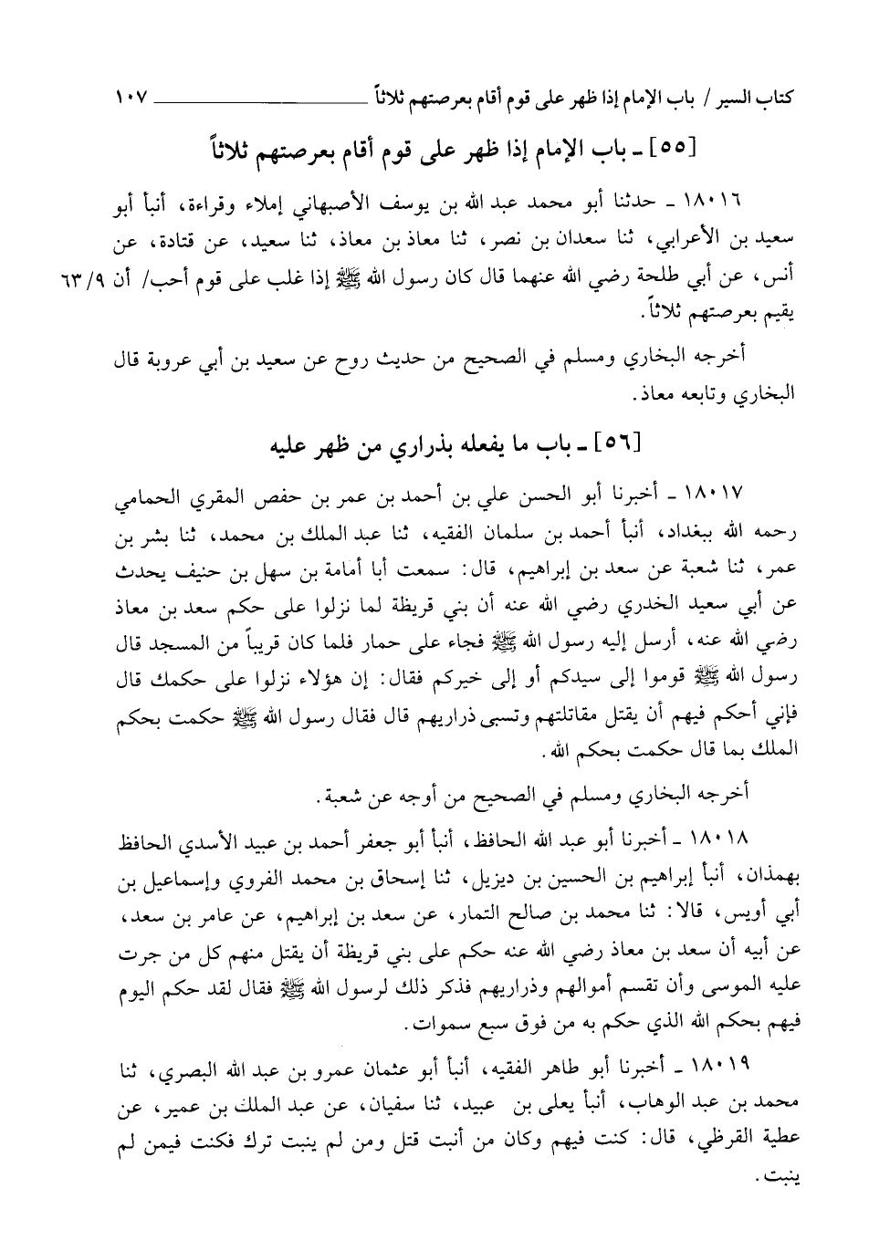 18017 - أَخْبَرَنَا أَبُو الْحَسَنِ عَلِيُّ بْنُ أَحْمَدَ بْنِ عُمَرَ بْنِ حَفْصٍ الْمُقْرِي الْحَمَّامِيُّ رَحِمَهُ اللهُ بِبَغْدَادَ، أنبأ أَحْمَدُ بْنُ سَلْمَانَ الْفَقِيهُ، ثنا عَبْدُ الْمَلِكِ بْنُ مُحَمَّدٍ، ثنا بِشْرُ بْنُ عُمَرَ، ثنا شُعْبَةُ، عَنْ سَعْدِ بْنِ إِبْرَاهِيمَ، قَالَ: سَمِعْتُ أَبَا أُمَامَةَ بْنَ سَهْلِ بْنِ حُنَيْفٍ، يُحَدِّثُ عَنْ أَبِي سَعِيدٍ الْخُدْرِيِّ رَضِيَ اللهُ عَنْهُ، أَنَّ بَنِي قُرَيْظَةَ لَمَّا نَزَلُوا عَلَى حُكْمِ سَعْدِ بْنِ مُعَاذٍ رَضِيَ اللهُ عَنْهُ أَرْسَلَ إِلَيْهِ رَسُولُ اللهِ صَلَّى اللهُ عَلَيْهِ وَسَلَّمَ، فَجَاءَ عَلَى حِمَارٍ، فَلَمَّا كَانَ قَرِيبًا مِنَ الْمَسْجِدِ قَالَ رَسُولُ اللهِ صَلَّى اللهُ عَلَيْهِ وَسَلَّمَ: " §قُومُوا إِلَى سَيِّدِكُمْ، أَوْ إِلَى خَيْرِكُمْ "، فَقَالَ: " إِنَّ هَؤُلَاءِ نَزَلُوا عَلَى حُكْمِكَ ". قَالَ: فَإِنِّي أَحْكُمُ فِيهِمْ أَنْ يُقْتَلَ مُقَاتِلَتُهُمْ وَتُسْبَى ذَرَارِيُّهُمْ. قَالَ: فَقَالَ رَسُولُ اللهِ صَلَّى اللهُ عَلَيْهِ وَسَلَّمَ: " حَكَمْتَ بِحُكْمِ الْمَلِكِ، وَرُبَّمَا قَالَ، حَكَمْتَ بِحُكْمِ اللهِ ". أَخْرَجَهُ الْبُخَارِيُّ وَمُسْلِمٌ فِي الصَّحِيحِ مِنْ أَوْجُهٍ عَنْ شُعْبَةَ