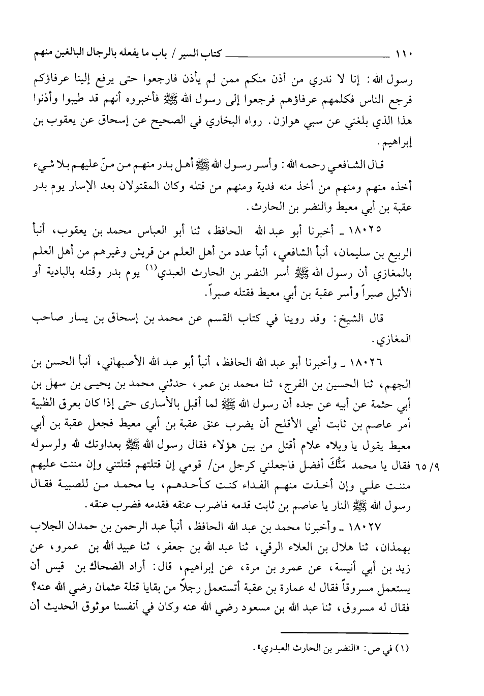 18025 - أَخْبَرَنَا أَبُو عَبْدِ اللهِ الْحَافِظُ، ثنا أَبُو الْعَبَّاسِ مُحَمَّدُ بْنُ يَعْقُوبَ، أنبأ الرَّبِيعُ بْنُ سُلَيْمَانَ، أنبأ الشَّافِعِيُّ، أنبأ عَدَدٌ مِنْ أَهْلِ الْعِلْمِ مِنْ قُرَيْشٍ وَغَيْرِهِمْ مِنْ أَهْلِ الْعِلْمِ بِالْمَغَازِي، أَنَّ رَسُولَ اللهِ صَلَّى اللهُ عَلَيْهِ وَسَلَّمَ §أَسَرَ النَّضْرَ بْنَ الْحَارِثِ الْعَبْدِيَّ يَوْمَ بَدْرٍ، وَقَتَلَهُ بِالْبَادِيَةِ أَوِ الْأَثِيلِ صَبْرًا، وَأَسَرَ عُقْبَةَ بْنَ أَبِي مُعَيْطٍ فَقَتَلَهُ صَبْرًا ". قَالَ الشَّيْخُ: " وَقَدْ رُوِّينَا فِي كِتَابِ الْقَسْمِ عَنْ مُحَمَّدِ بْنِ إِسْحَاقَ بْنِ يَسَارٍ صَاحِبِ الْمَغَازِي "