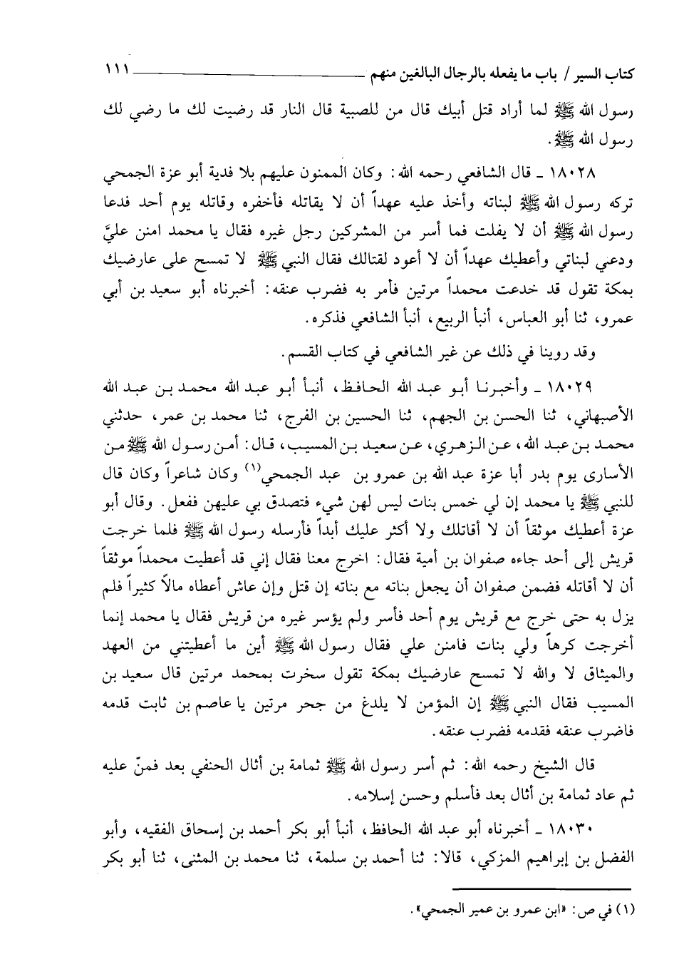 18028 - قَالَ الشَّافِعِيُّ رَحِمَهُ اللهُ: " وَكَانَ §الْمَمْنُونُ عَلَيْهِمْ بِلَا فِدْيَةٍ أَبَا عَزَّةَ الْجُمَحِيَّ، تَرَكَهُ رَسُولُ اللهِ صَلَّى اللهُ عَلَيْهِ وَسَلَّمَ لِبَنَاتِهِ، وَأَخَذَ عَلَيْهِ عَهْدًا أَنْ لَا يُقَاتِلَهُ، فَأَخْفَرَهُ وَقَاتَلَهُ يَوْمَ أُحُدٍ، فَدَعَا رَسُولُ اللهِ صَلَّى اللهُ عَلَيْهِ وَسَلَّمَ أَنْ لَا يُفْلِتَ، فَمَا أُسِرَ مِنَ الْمُشْرِكِينَ رَجُلٌ غَيْرُهُ، فَقَالَ: يَا مُحَمَّدُ امْنُنْ عَلَيَّ وَدَعْنِي لِبَنَاتِي وَأُعْطِيَكَ عَهْدًا أَنْ لَا أَعُودَ لِقِتَالِكَ. فَقَالَ النَّبِيُّ صَلَّى اللهُ عَلَيْهِ وَسَلَّمَ: " لَا تَمْسَحُ عَلَى عَارِضَيْكَ بِمَكَّةَ تَقُولُ: قَدْ خَدَعْتُ مُحَمَّدًا مَرَّتَيْنِ ". فَأَمَرَ بِهِ فَضُرِبَ عُنُقُهُ. أَخْبَرَنَاهُ أَبُو سَعِيدِ بْنُ أَبِي عَمْرٍو، ثنا أَبُو الْعَبَّاسِ، أنبأ الرَّبِيعُ، أَنْبَأَ الشَّافِعِيُّ فَذَكَرَهُ. " وَقَدْ رُوِّينَا فِي ذَلِكَ عَنْ غَيْرِ الشَّافِعِيِّ فِي كِتَابِ الْقَسْمِ "