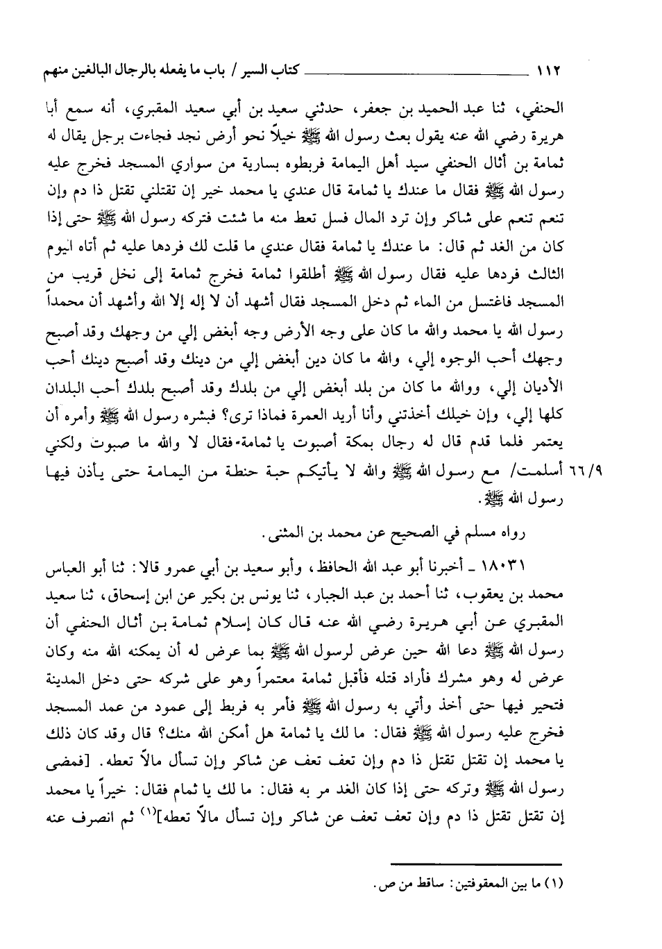 18031 - أَخْبَرَنَا أَبُو عَبْدِ اللهِ الْحَافِظُ، وَأَبُو سَعِيدِ بْنُ أَبِي عَمْرٍو، قَالَا: ثنا أَبُو الْعَبَّاسِ مُحَمَّدُ بْنُ يَعْقُوبَ، ثنا أَحْمَدُ بْنُ عَبْدِ الْجَبَّارِ، ثنا يُونُسُ بْنُ بُكَيْرٍ، عَنِ ابْنِ إِسْحَاقَ، ثنا سَعِيدٌ الْمَقْبُرِيُّ، عَنْ أَبِي هُرَيْرَةَ رَضِيَ اللهُ عَنْهُ، قَالَ: كَانَ إِسْلَامُ ثُمَامَةَ بْنِ أُثَالٍ الْحَنَفِيِّ أَنَّ رَسُولَ اللهِ صَلَّى اللهُ عَلَيْهِ وَسَلَّمَ دَعَا اللهَ حِينَ عَرَضَ لِرَسُولِ اللهِ صَلَّى اللهُ عَلَيْهِ وَسَلَّمَ بِمَا عَرَضَ لَهُ أَنْ يُمَكِّنَهُ اللهُ مِنْهُ، وَكَانَ عَرَضَ لَهُ وَهُوَ مُشْرِكٌ فَأَرَادَ قَتْلَهُ، فَأَقْبَلَ ثُمَامَةُ مُعْتَمِرًا وَهُوَ عَلَى شِرْكِهِ حَتَّى دَخَلَ الْمَدِينَةَ فَتَحَيَّرَ فِيهَا حَتَّى أُخِذَ، وَأُتِيَ بِهِ رَسُولُ اللهِ صَلَّى اللهُ عَلَيْهِ وَسَلَّمَ، فَأَمَرَ بِهِ فَرُبِطَ إِلَى عَمُودٍ مِنْ عُمُدِ الْمَسْجِدِ، فَخَرَجَ عَلَيْهِ رَسُولُ اللهِ صَلَّى اللهُ عَلَيْهِ وَسَلَّمَ، فَقَالَ: §" مَا لَكَ يَا ثُمَامَةُ هَلْ أَمْكَنَ اللهُ مِنْكَ؟ ". قَالَ: وَقَدْ كَانَ ذَلِكَ يَا مُحَمَّدُ إِنْ تَقْتُلْ تَقْتُلْ ذَا دَمٍ، وَإِنْ تَعْفُ تَعْفُ عَنْ شَاكِرٍ، وَإِنْ تَسْأَلْ مَالًا تُعْطَهُ. فَمَضَى رَسُولُ اللهِ صَلَّى اللهُ عَلَيْهِ وَسَلَّمَ وَتَرَكَهُ، حَتَّى إِذَا كَانَ الْغَدُ مَرَّ بِهِ، فَقَالَ: " مَا لَكَ يَا ثُمَامَ؟ ". فَقَالَ: خَيْرًا يَا مُحَمَّدُ إِنْ تَقْتُلْ تَقْتُلْ ذَا دَمٍ، وَإِنْ تَعْفُ تَعْفُ عَنْ شَاكِرٍ، وَإِنْ تَسْأَلْ مَالًا تُعْطَهُ. ثُمَّ انْصَرَفَ عَنْهُ -[113]- رَسُولُ اللهِ صَلَّى اللهُ عَلَيْهِ وَسَلَّمَ، قَالَ أَبُو هُرَيْرَةَ رَضِيَ اللهُ عَنْهُ: فَجَعَلْنَا - الْمَسَاكِينَ - نَقُولُ بَيْنَنَا: مَا نَصْنَعُ بِدَمِ ثُمَامَةَ؟، وَاللهِ لَأَكْلَةٌ مِنْ جَزُورٍ سَمِينَةٍ مِنْ فِدَائِهِ أَحَبُّ إِلَيْنَا مِنْ دَمِ ثُمَامَةَ، فَلَمَّا كَانَ الْغَدُ مَرَّ بِهِ رَسُولُ اللهِ صَلَّى اللهُ عَلَيْهِ وَسَلَّمَ فَقَالَ: " مَا لَكَ يَا ثُمَامَ؟ ". فَقَالَ: خَيْرًا يَا مُحَمَّدُ إِنْ تَقْتُلْ تَقْتُلْ ذَا دَمٍ، وَإِنْ تَعْفُ تَعْفُ عَنْ شَاكِرٍ، وَإِنْ تَسَألْ مَالًا تُعْطَهُ. فَقَالَ رَسُولُ اللهِ صَلَّى اللهُ عَلَيْهِ وَسَلَّمَ: " أَطْلِقُوهُ فَقَدْ عَفَوْتُ عَنْكَ يَا ثُمَامَ ". فَخَرَجَ ثُمَامَةُ حَتَّى أَتَى حَائِطًا مِنْ حِيطَانِ الْمَدِينَةِ، فَاغْتَسَلَ فِيهِ وَتَطَهَّرَ وَطَهَّرَ ثِيَابَهُ، ثُمَّ جَاءَ رَسُولَ اللهِ صَلَّى اللهُ عَلَيْهِ وَسَلَّمَ وَهُوَ جَالِسٌ فِي الْمَسْجِدِ فِي أَصْحَابِهِ، فَقَالَ: يَا مُحَمَّدُ، وَاللهِ لَقَدْ كُنْتَ وَمَا وَجْهٌ أَبْغَضَ إِلِيَّ مِنْ وَجْهِكَ، وَلَا دِينَ أَبْغَضُ إِلِيَّ مِنْ دِينِكَ، وَلَا بَلَدَ أَبْغَضُ إِلِيَّ مِنْ بَلَدِكَ، ثُمَّ لَقَدْ أَصْبَحْتَ وَمَا وَجْهٌ أَحَبَّ إِلِيَّ مِنْ وَجْهِكَ، وَلَا دِينَ أَحَبُّ إِلِيَّ مِنْ دِينِكَ، وَلَا بَلَدَ أَحَبُّ إِلِيَّ مِنْ بَلَدِكَ، وَإِنِّي أَشْهَدُ أَنْ لَا إِلَهَ إِلَّا اللهُ، وَأَنَّ مُحَمَّدًا عَبْدُهُ وَرَسُولُهُ، يَا رَسُولَ اللهِ، إِنِّي كُنْتُ قَدْ خَرَجْتُ مُعْتَمِرًا وَأَنَا عَلَى دِينِ قَوْمِي، فَبَشِّرْنِي صَلَّى الله عَلَيْكَ فِي عُمْرَتِي. فَبَشَّرَهُ وَعَلَّمَهُ، فَخَرَجَ مُعْتَمِرًا، فَلَمَّا قَدِمَ مَكَّةَ وَسَمِعَتْهُ قُرَيْشٌ يَتَكَلَّمُ بِأَمْرِ مُحَمَّدٍ مِنَ الْإِسْلَامِ، قَالُوا: صَبَأَ ثُمَامَةُ، فَأَغْضَبُوهُ، فَقَالَ: إِنِّي وَاللهِ مَا صَبَوْتُ، وَلَكِنِّي أَسْلَمْتُ وَصَدَّقْتُ مُحَمَّدًا، وَآمَنْتُ بِهِ، وَايْمُ الَّذِي نَفْسُ ثُمَامَةَ بِيَدِهِ لَا يَأْتِيكُمْ حَبَّةٌ مِنَ الْيَمَامَةِ، وَكَانَتْ رِيفَ مَكَّةَ، مَا بَقِيتُ حَتَّى يَأْذ