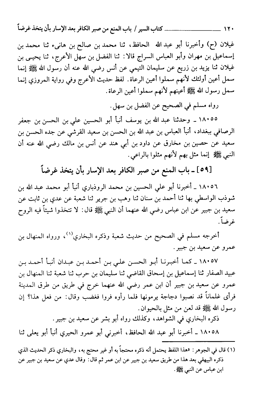 18058 - أَخْبَرَنَا أَبُو عَبْدِ اللهِ الْحَافِظُ، أَخْبَرَنِي أَبُو عَمْرٍو الْحِيرِيُّ، أنبأ أَبُو يَعْلَى، ثنا -[121]- زُهَيْرُ بْنُ حَرْبٍ، ثنا هُشَيْمُ بْنُ بَشِيرٍ، أنبأ أَبُو بِشْرٍ، عَنْ سَعِيدِ بْنِ جُبَيْرٍ، قَالَ: مَرَّ ابْنُ عُمَرَ رَضِيَ اللهُ عَنْهُمَا بِفِتْيَانٍ مِنْ قُرَيْشٍ وَقَدْ نَصَبُوا طَيْرًا وَهُمْ يَرْمُونَهُ، وَقَدْ جَعَلُوا لِصَاحِبِ الطَّيْرِ كُلَّ خَاطِئَةٍ مِنْ نَبْلِهِمْ، فَلَمَّا رَأَوَا ابْنَ عُمَرَ تَفَرَّقُوا، فَقَالَ ابْنُ عُمَرَ رَضِيَ اللهُ عَنْهُمَا: مَنْ فَعَلَ هَذَا؟ لَعَنَ اللهُ مَنْ فَعَلَ هَذَا، إِنَّ رَسُولَ اللهِ صَلَّى اللهُ عَلَيْهِ وَسَلَّمَ §" لَعَنَ مَنِ اتَّخَذَ شَيْئًا فِيهِ الرُّوحُ غَرَضًا ". رَوَاهُ مُسْلِمٌ فِي الصَّحِيحِ عَنْ زُهَيْرِ بْنِ حَرْبٍ، وَأَخْرَجَهُ الْبُخَارِيُّ وَمُسْلِمٌ مِنْ حَدِيثِ أَبِي عَوَانَةَ، عَنْ أَبِي بِشْرٍ