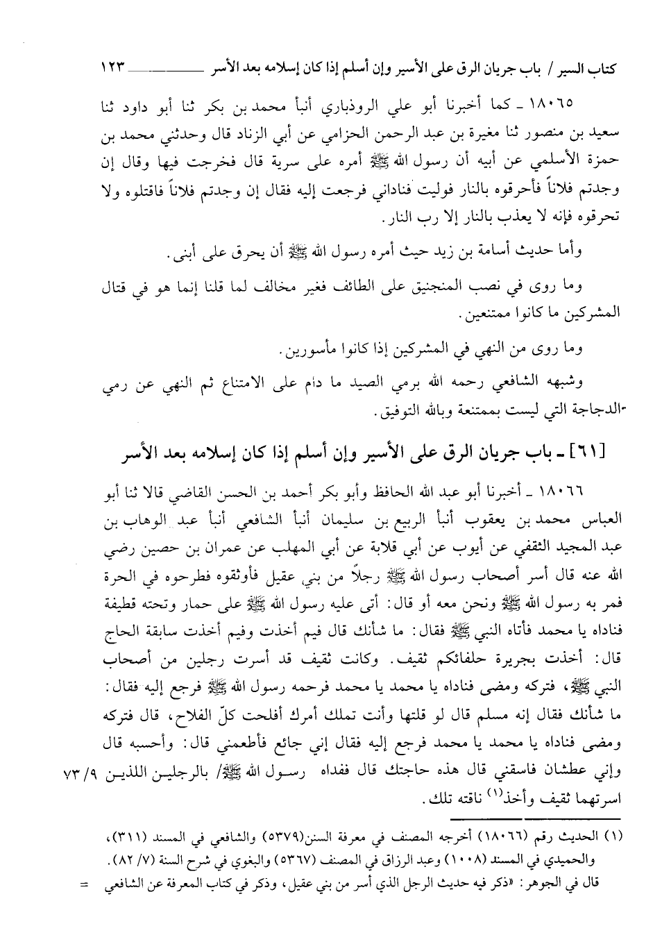 18065 - كَمَا أَخْبَرَنَا أَبُو عَلِيٍّ الرُّوذْبَارِيُّ، أنبأ مُحَمَّدُ بْنُ بَكْرٍ، ثنا أَبُو دَاوُدَ، ثنا سَعِيدُ بْنُ مَنْصُورٍ، ثنا مُغِيرَةُ بْنُ عَبْدِ الرَّحْمَنِ الْحِزَامِيُّ، عَنْ أَبِي الزِّنَادِ، قَالَ: وَحَدَّثَنِي مُحَمَّدُ بْنُ حَمْزَةَ الْأَسْلَمِيُّ، عَنْ أَبِيهِ، أَنَّ رَسُولَ اللهِ صَلَّى اللهُ عَلَيْهِ وَسَلَّمَ أَمَّرَهُ عَلَى سَرِيَّةٍ، قَالَ: فَخَرَجْتُ فِيهَا، وَقَالَ: §" إِنْ وَجَدْتُمْ فُلَانًا فَأَحْرِقُوهُ بِالنَّارِ ". فَوَلَّيْتُ فَنَادَانِي فَرَجَعْتُ إِلَيْهِ، فَقَالَ: " إِنْ وَجَدْتُمْ فُلَانًا فَاقْتُلُوهُ وَلَا تَحْرِقُوهُ؛ فَإِنَّهُ لَا يُعَذِّبُ بِالنَّارِ إِلَّا رَبُّ النَّارِ ". " وَأَمَّا حَدِيثُ أُسَامَةَ بْنِ زَيْدٍ حَيْثُ أَمَرَهُ رَسُولُ اللهِ صَلَّى اللهُ عَلَيْهِ وَسَلَّمَ أَنْ يَحْرِقَ عَلَى أُبْنَى، وَمَا رُوِيَ فِي نَصْبِ الْمَنْجَنِيقِ عَلَى الطَّائِفِ فَغَيْرُ مُخَالِفٍ لِمَا قُلْنَا، إِنَّمَا هُوَ فِي قِتَالِ الْمُشْرِكِينَ مَا كَانُوا مُمْتَنِعِينَ، وَمَا رُوِيَ مِنَ النَّهْيِ فِي الْمُشْرِكِينَ إِذَا كَانُوا مَأْسُورِينَ، وَشَبَّهَهُ الشَّافِعِيُّ رَحِمَهُ اللهُ بِرَمْيِ الصَّيْدِ مَا دَامَ عَلَى الِامْتِنَاعِ، ثُمَّ النَّهْيِ عَنْ رَمْيِ الدَّجَاجَةِ الَّتِي لَيْسَتْ بِمُمْتَنِعَةٍ، وَبِاللهِ التَّوْفِيقُ "