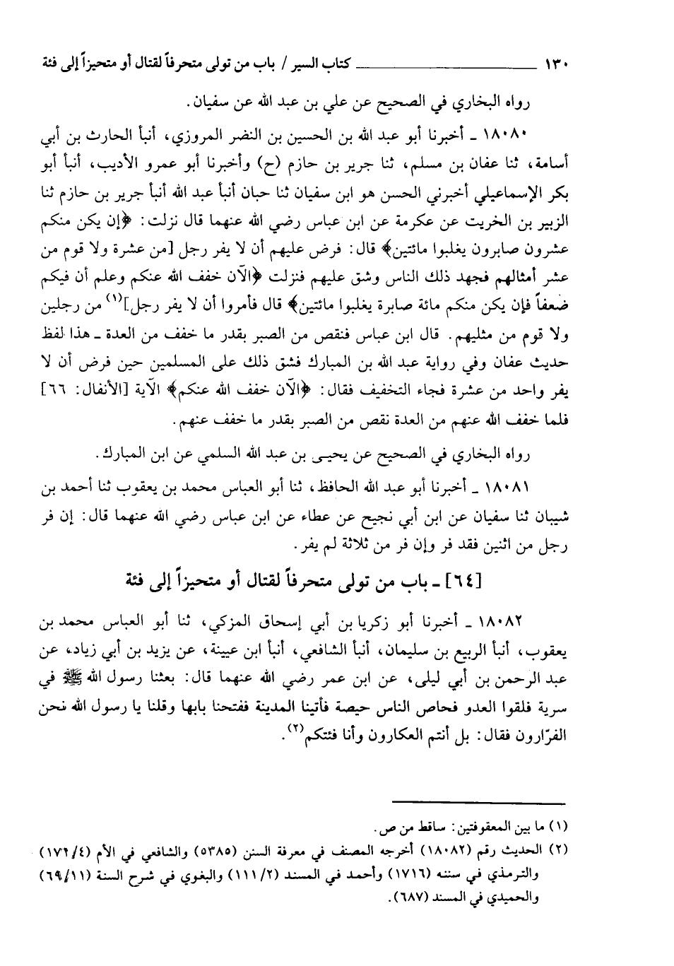 18080 - أَخْبَرَنَا أَبُو عَبْدِ اللهِ الْحَافِظُ أنبأ عَبْدِ اللهِ بْنُ الْحُسَيْنِ بْنِ النَّضْرِ الْمَرْوَزِيُّ، أنبأ الْحَارِثُ بْنُ أَبِي أُسَامَةَ، ثنا عَفَّانُ بْنُ مُسْلِمٍ، ثنا جَرِيرُ بْنُ حَازِمٍ، ح وَأَخْبَرَنَا أَبُو عَمْرٍو الْأَدِيبُ، أنبأ أَبُو بَكْرٍ الْإِسْمَاعِيلِيُّ، أَخْبَرَنِي الْحَسَنُ هُوَ ابْنُ سُفْيَانَ، ثنا حَبَّانُ، أنبأ عَبْدُ اللهِ، أنبأ جَرِيرُ بْنُ حَازِمٍ، ثنا الزُّبَيْرُ بْنُ الْخِرِّيتِ، عَنْ عِكْرِمَةَ، عَنِ ابْنِ عَبَّاسٍ رَضِيَ اللهُ عَنْهُمَا، قَالَ: " نَزَلَتْ {§إِنْ يَكُنْ مِنْكُمْ عِشْرُونَ صَابِرُونَ يَغْلِبُوا مِائَتَيْنِ} قَالَ: فُرِضَ عَلَيْهِمْ أَنْ لَا يَفِرَّ رَجُلٌ مِنْ عَشَرَةٍ، وَلَا قَوْمٌ مِنْ عَشْرِ أَمْثَالِهِمْ، فَجَهَدَ ذَلِكَ النَّاسَ وَشَقَّ عَلَيْهِمْ، فَنَزَلَتْ: {الْآنَ خَفَّفَ اللهُ عَنْكُمْ وَعَلِمَ أَنَّ فِيكُمْ ضَعْفًا فَإِنْ يَكُنْ مِنْكُمْ مِائَةٌ صَابِرَةٌ يَغْلِبُوا مِائَتَيْنِ} قَالَ: فَأُمِرُوا أَنْ لَا يَفِرَّ رَجُلٌ مِنْ رَجُلَيْنِ، وَلَا قَوْمٌ مِنْ مِثْلَيْهِمْ. قَالَ ابْنُ عَبَّاسٍ: فَنَقَصَ مِنَ الصَّبْرِ بِقَدْرِ مَا خَفَّفَ مِنَ الْعِدَّةِ ". " هَذَا لَفْظُ حَدِيثِ عَفَّانَ، وَفِي رِوَايَةِ عَبْدِ اللهِ بْنِ الْمُبَارَكِ فَشَقَّ ذَلِكَ عَلَى الْمُسْلِمِينَ حِينَ فُرِضَ أَنْ لَا يَفِرَّ وَاحِدٌ مِنْ عَشَرَةٍ فَجَاءَ التَّخْفِيفُ، فَقَالَ: {الْآنَ خَفَّفَ اللهُ عَنْكُمْ} [الأنفال: 66]، الآية، فَلَمَّا خَفَّفَ اللهُ عَنْهُمْ مِنَ الْعِدَّةِ نَقَصَ مِنَ الصَّبْرِ بِقَدْرِ مَا خَفَّفَ عَنْهُمْ " رَوَاهُ الْبُخَارِيُّ فِي الصَّحِيحِ عَنْ يَحْيَى بْنِ عَبْدِ اللهِ السُّلَمِيِّ، عَنِ ابْنِ الْمُبَارَكِ