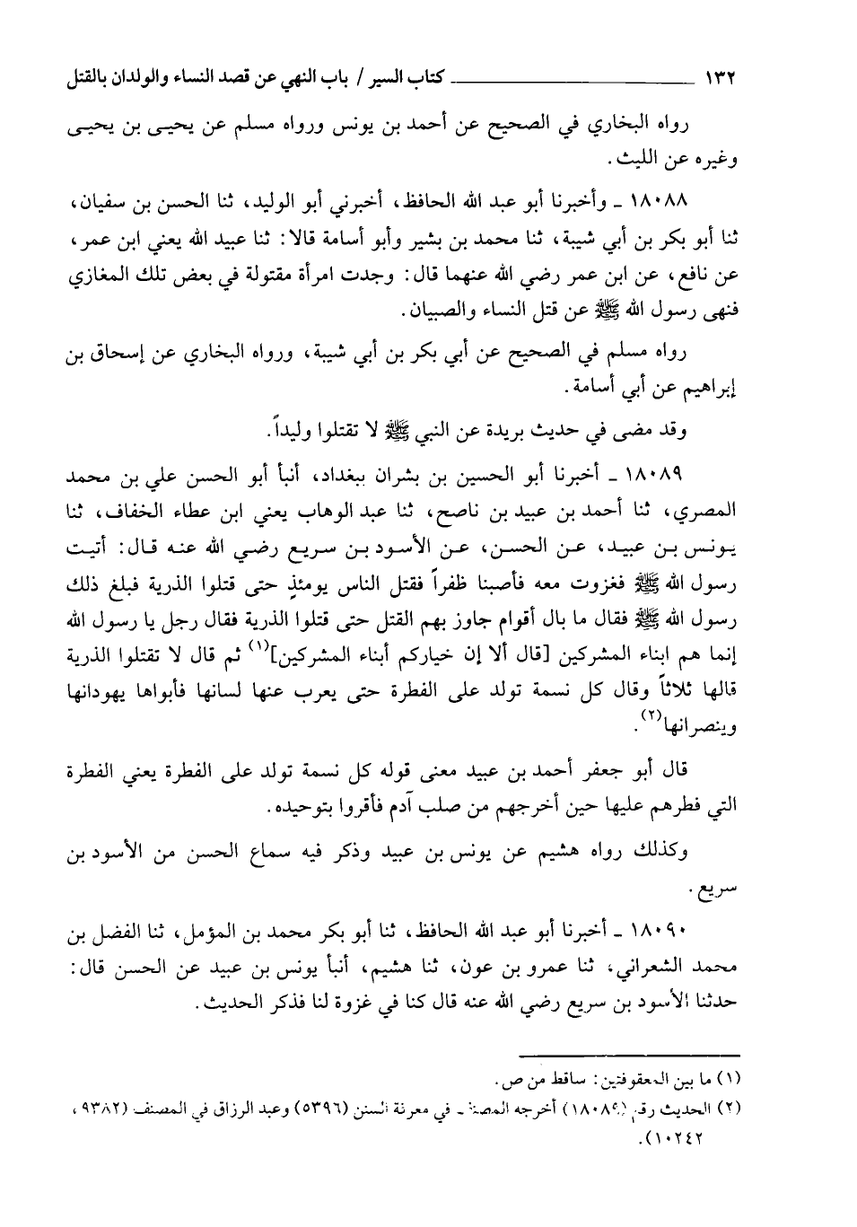 18088 - وَأَخْبَرَنَا أَبُو عَبْدِ اللهِ الْحَافِظُ، أَخْبَرَنِي أَبُو الْوَلِيدِ، ثنا الْحَسَنُ بْنُ سُفْيَانَ، ثنا أَبُو بَكْرِ بْنُ أَبِي شَيْبَةَ، ثنا مُحَمَّدُ بْنُ بَشِيرٍ، وَأَبُو أُسَامَةَ، قَالَا: ثنا عُبَيْدُ اللهِ يَعْنِي ابْنَ عُمَرَ، عَنْ نَافِعٍ، عَنِ ابْنِ عُمَرَ رَضِيَ اللهُ عَنْهُمَا، قَالَ: " وُجِدَتِ امْرَأَةٌ مَقْتُولَةً فِي بَعْضِ تِلْكَ الْمَغَازِي، §فَنَهَى رَسُولُ اللهِ صَلَّى اللهُ عَلَيْهِ وَسَلَّمَ عَنْ قَتْلِ النِّسَاءِ وَالصِّبْيَانِ ". رَوَاهُ مُسْلِمٌ فِي الصَّحِيحِ عَنْ أَبِي بَكْرِ بْنِ أَبِي شَيْبَةَ، وَرَوَاهُ الْبُخَارِيُّ عَنْ إِسْحَاقَ بْنِ إِبْرَاهِيمَ، عَنْ أَبِي أُسَامَةَ
