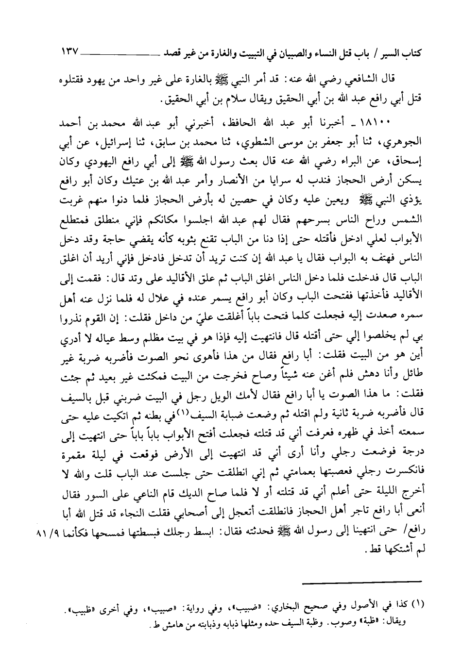 18100 - أَخْبَرَنَا أَبُو عَبْدِ اللهِ الْحَافِظُ، أَخْبَرَنِي أَبُو عَبْدِ اللهِ مُحَمَّدُ بْنُ أَحْمَدَ الْجَوْهَرِيُّ، ثنا أَبُو جَعْفَرٍ أَحْمَدُ بْنُ مُوسَى الشَّطَوِيُّ، ثنا مُحَمَّدُ بْنُ سَابِقٍ، ثنا إِسْرَائِيلُ، عَنْ أَبِي إِسْحَاقَ، عَنِ الْبَرَاءِ رَضِيَ اللهُ عَنْهُ، قَالَ: §" بَعَثَ رَسُولُ اللهِ صَلَّى اللهُ عَلَيْهِ وَسَلَّمَ إِلَى أَبِي رَافِعٍ الْيَهُودِيِّ وَكَانَ يَسْكُنُ أَرْضَ الْحِجَازِ، فَنَدَبَ لَهُ سَرَايَا مِنَ الْأَنْصَارِ، وَأَمَرَ عَبْدَ اللهِ بْنَ عَتِيكٍ، وَكَانَ أَبُو رَافِعٍ يُؤْذِي النَّبِيَّ صَلَّى اللهُ عَلَيْهِ وَسَلَّمَ وَيُعِينُ عَلَيْهِ، وَكَانَ فِي حَصِينٍ لَهُ بِأَرْضِ الْحِجَازِ، فَلَمَّا دَنَوْا مِنْهْ غَرَبَتِ الشَّمْسُ وَرَاحَ النَّاسُ بِسَرْحِهِمْ، فَقَالَ لَهُمْ عَبْدُ اللهِ: اجْلِسُوا مَكَانَكُمْ فَإِنِّي مُنْطَلِقٌ فَمُتَطَلِّعٌ الْأَبْوَابَ لَعَلِّي أَدْخُلُ فَأَقْتُلُهُ. حَتَّى إِذَا دَنَا مِنَ الْبَابِ تَقَنَّعَ بِثَوْبِهِ كَأَنَّهُ يَقْضِي حَاجَةً، وَقَدْ دَخَلَ النَّاسُ فَهَتَفَ بِهِ الْبَوَّابُ، فَقَالَ: يَا عَبْدَ اللهِ إِنْ كُنْتَ تُرِيدُ أَنْ تَدْخُلَ فَادْخُلْ، فَإِنِّي أُرِيدُ أَنْ أُغْلِقَ الْبَابَ، قَالَ: فَدَخَلْتُ، فَلَمَّا دَخَلَ النَّاسُ أَغْلَقَ الْبَابَ ثُمَّ عَلَّقَ الْأَقَالِيدَ عَلَى وَتَدٍ. قَالَ: فَقُمْتُ إِلَى الْأَقَالِيدِ فَأَخَذْتُهَا فَفَتَحْتُ الْبَابَ، وَكَانَ أَبُو رَافِعٍ يُسْمَرُ عِنْدَهُ فِي عَلَالِيَّ لَهُ، فَلَمَّا نَزَلَ عَنْهُ أَهْلُ سَمَرِهِ صَعِدْتُ إِلَيْهِ، فَجَعَلْتُ كُلَّمَا فَتَحْتُ بَابًا أَغْلَقْتُ عَلَيَّ مِنْ دَاخِلٍ، فَقُلْتُ: إِنَّ الْقَوْمَ نَذِرُوا بِي لَمْ يَخْلُصُوا إِلِيَّ حَتَّى أَقْتُلَهُ. قَالَ: فَانْتَهَيْتُ إِلَيْهِ، فَإِذَا هُوَ فِي بَيْتٍ مُظْلِمٍ وَسْطَ عِيَالِهِ لَا أَدْرِي أَيْنَ هُوَ مِنَ الْبَيْتِ، فَقُلْتُ: أَبَا رَافِعٍ، فَقَالَ: مَنْ هَذَا؟ فَأَهْوِي نَحْوَ الصَّوْتِ فَأَضْرِبُهُ ضَرْبَةً غَيْرَ طَائِلٍ وَأَنَا دَهِشٌ، فَلَمْ أُغْنِ عَنْهُ شَيْئًا وَصَاحَ، فَخَرَجْتُ مِنَ الْبَيْتِ فَمَكَثْتُ غَيْرَ بَعِيدٍ، ثُمَّ جِئْتُ فَقُلْتُ: مَا هَذَا الصَّوْتُ يَا أَبَا رَافِعٍ، فَقَالَ: لِأُمِّكَ الْوَيْلُ رَجُلٌ فِي الْبَيْتِ ضَرَبَنِي قَبْلُ بِالسَّيْفِ، قَالَ: فَأَضْرِبُهُ ضَرْبَةً ثَانِيَةً وَلَمْ أَقْتُلْهُ، ثُمَّ وَضَعْتُ ضَبَابَةَ السَّيْفِ فِي بَطْنِهِ ثُمَّ اتَّكَيْتُ عَلَيْهِ حَتَّى سَمِعْتُهُ أَخَذَ فِي ظَهْرِهِ، فَعَرَفْتُ أَنِّي قَدْ قَتَلْتُهُ، فَجَعَلْتُ أَفْتَحُ الْأَبْوَابَ بَابًا بَابًا حَتَّى انْتَهَيْتُ إِلَى دَرَجَةٍ، فَوَضَعْتُ رِجْلِي وَأَنَا أَرَى أَنِّي قَدِ انْتَهَيْتُ إِلَى الْأَرْضِ فَوَقَعْتُ فِي لَيْلَةٍ مُقْمِرَةٍ، فَانْكَسَرَتْ رِجْلِي فَعَصَبْتُهَا بِعِمَامَتِي، ثُمَّ إِنِّي انْطَلَقْتُ حَتَّى جَلَسْتُ عِنْدَ الْبَابِ، قُلْتُ: وَاللهِ لَا أَخْرُجُ اللَّيْلَةَ حَتَّى أَعْلَمَ أَنِّي قَدْ قَتَلْتُهُ أَوْ لَا، فَلَمَّا صَاحَ الدِّيكُ قَامَ النَّاعِي عَلَى السُّورِ، فَقَالَ: أَنْعَى أَبَا رَافِعٍ تَاجِرَ أَهْلِ الْحِجَازِ، فَانْطَلَقْتُ أَتَعَجَّلُ إِلَى أَصْحَابِي، فَقُلْتُ: النَّجَاءَ، قَدْ قَتَلَ اللهُ أَبَا رَافِعٍ حَتَّى انْتَهَيْنَا إِلَى رَسُولِ اللهِ صَلَّى اللهُ عَلَيْهِ وَسَلَّمَ، فَحَدَّثْتُهُ فَقَالَ: " ابْسُطْ رِجْلَكَ "، فَبَسَطْتُهَا فَمَسَحَهَا فَكَأَنَّمَا لَمْ أَشْتَكِهَا قَطُّ. -[138]-