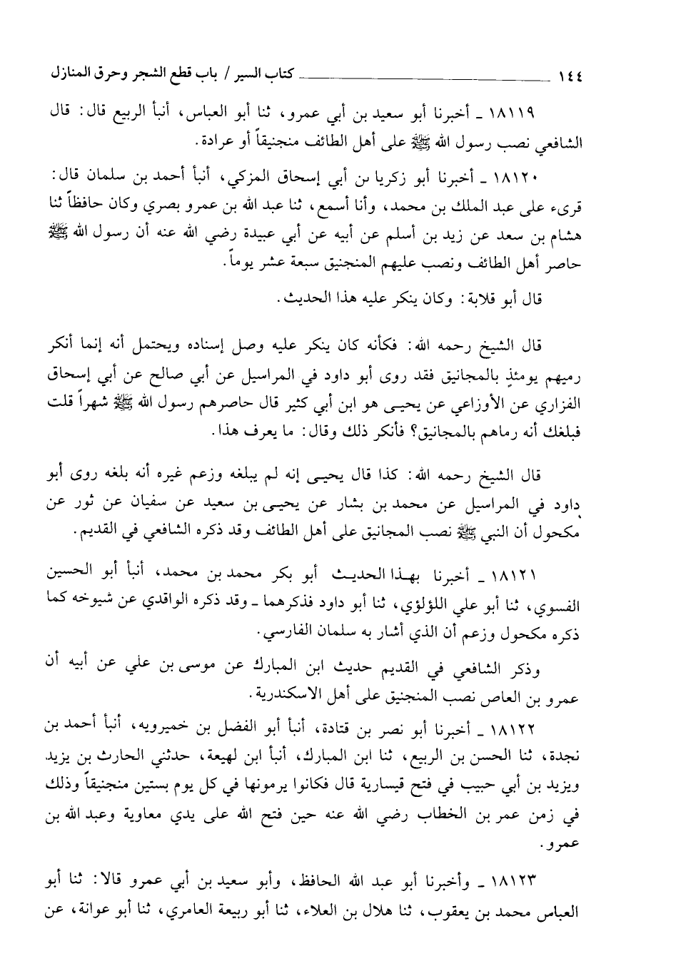 18120 - أَخْبَرَنَا أَبُو زَكَرِيَّا بْنُ أَبِي إِسْحَاقَ الْمُزَكِّي، أنبأ أَحْمَدُ بْنُ سَلْمَانَ، قَالَ: قُرِئَ عَلَى عَبْدِ الْمَلِكِ بْنِ مُحَمَّدٍ، وَأَنَا أَسْمَعُ، ثنا عَبْدُ اللهِ بْنُ عَمْرٍو بَصْرِيٌّ وَكَانَ حَافِظًا، ثنا هِشَامُ بْنُ سَعْدٍ، عَنْ زَيْدِ بْنِ أَسْلَمَ، عَنْ أَبِيهِ، عَنْ أَبِي عُبَيْدَةَ رَضِيَ اللهُ عَنْهُ، أَنَّ رَسُولَ اللهِ صَلَّى اللهُ عَلَيْهِ وَسَلَّمَ §حَاصَرَ أَهْلَ الطَّائِفِ، وَنَصَبَ عَلَيْهِمُ الْمَنْجَنِيقَ سَبْعَةَ عَشَرَ يَوْمًا " قَالَ أَبُو قِلَابَةَ: " وَكَانَ يُنْكَرُ عَلَيْهِ هَذَا الْحَدِيثُ " قَالَ الشَّيْخُ رَحِمَهُ اللهُ: " فَكَأَنَّهُ كَانَ يُنْكَرُ عَلَيْهِ وَصْلُ إِسْنَادِهِ، وَيُحْتَمَلُ أَنَّهُ إِنَّمَا أَنْكَرَ رَمْيَهُمْ يَوْمَئِذٍ بِالْمَجَانِيقِ " فَقَدْ رَوَى أَبُو دَاوُدَ فِي الْمَرَاسِيلِ، عَنْ أَبِي صَالِحٍ، عَنْ أَبِي إِسْحَاقَ الْفَزَارِيِّ، عَنِ الْأَوْزَاعِيِّ، عَنْ يَحْيَى هُوَ ابْنُ أَبِي كَثِيرٍ، قَالَ: حَاصَرَهُمْ رَسُولُ اللهِ صَلَّى اللهُ عَلَيْهِ وَسَلَّمَ شَهْرًا. قُلْتُ: فَبَلَغَكَ أَنَّهُ رَمَاهُمْ بِالْمَجَانِيقِ؟ فَأَنْكَرَ ذَلِكَ، وَقَالَ: مَا يُعْرَفُ هَذَا. قَالَ الشَّيْخُ رَحِمَهُ اللهُ: " كَذَا قَالَ يَحْيَى إِنَّهُ لَمْ يَبْلُغْهُ، وَزَعَمَ غَيْرُهُ أَنَّهُ بَلَغَهُ. رَوَى أَبُو دَاوُدَ فِي الْمَرَاسِيلِ، عَنْ مُحَمَّدِ بْنِ بَشَّارٍ، عَنْ يَحْيَى بْنِ سَعِيدٍ، عَنْ سُفْيَانَ، عَنْ ثَوْرٍ، عَنْ مَكْحُولٍ، أَنَّ النَّبِيَّ صَلَّى اللهُ عَلَيْهِ وَسَلَّمَ نَصَبَ الْمَجَانِيقَ عَلَى أَهْلِ الطَّائِفِ. وَقَدْ ذَكَرَهُ الشَّافِعِيُّ فِي الْقَدِيمِ.