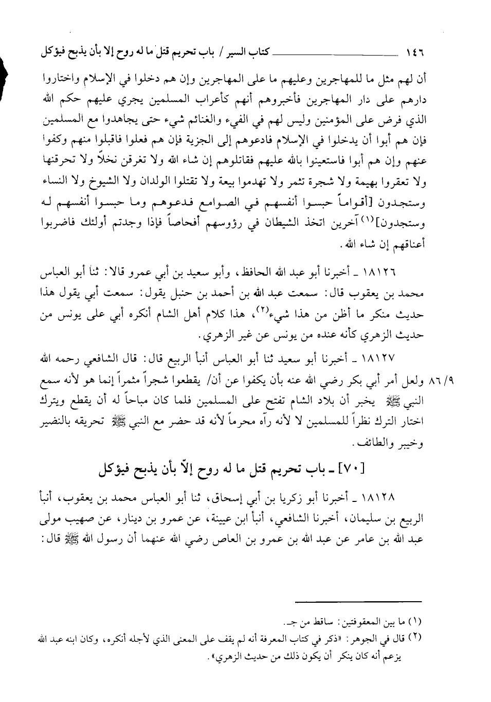18127 - أَخْبَرَنَا أَبُو سَعِيدٍ، ثنا أَبُو الْعَبَّاسِ، أنبأ الرَّبِيعُ، قَالَ: قَالَ الشَّافِعِيُّ رَحِمَهُ اللهُ: وَلَعَلَّ أَمْرَ أَبِي بَكْرٍ رَضِيَ اللهُ عَنْهُ بِأَنْ §يَكُفُّوا عَنْ أَنْ يَقْطَعُوا شَجَرًا مُثْمِرًا؛ إِنَّمَا هُوَ لِأَنَّهُ سَمِعَ النَّبِيَّ صَلَّى اللهُ عَلَيْهِ وَسَلَّمَ يُخْبِرُ أَنَّ بِلَادَ الشَّامِ تُفْتَحُ عَلَى الْمُسْلِمِينَ "، فَلَمَّا كَانَ مُبَاحًا لَهُ أَنْ يَقْطَعَ وَيَتْرُكَ اخْتَارَ التَّرْكَ نَظَرًا لِلْمُسْلِمِينَ، لَا لِأَنَّهُ رَآهُ مُحَرَّمًا؛ لِأَنَّهُ قَدْ حَضَرَ مَعَ النَّبِيِّ صَلَّى اللهُ عَلَيْهِ وَسَلَّمَ تَحْرِيقَهُ بِالنَّضِيرِ، وَخَيْبَرَ، وَالطَّائِفِ "