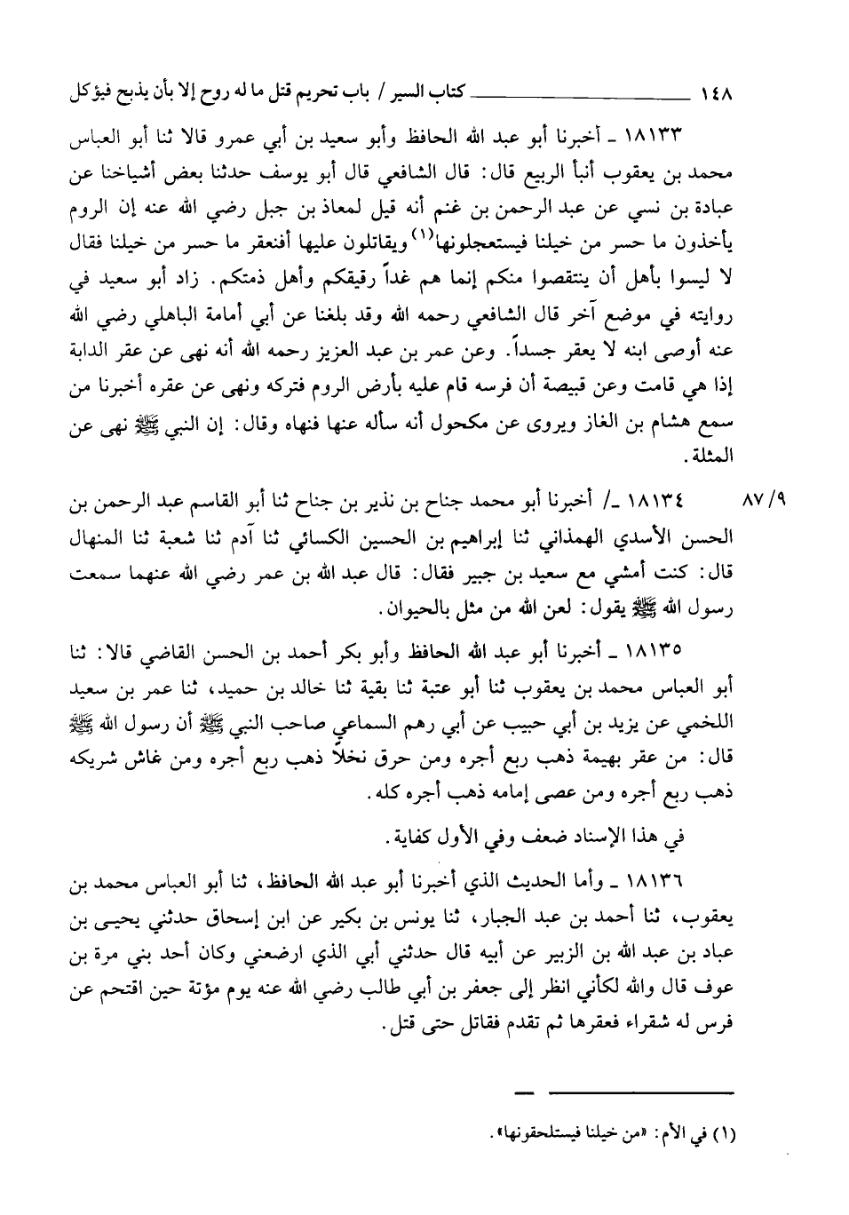 18133 - أَخْبَرَنَا أَبُو عَبْدِ اللهِ الْحَافِظُ، وَأَبُو سَعِيدِ بْنُ أَبِي عَمْرٍو، قَالَا: ثنا أَبُو الْعَبَّاسِ مُحَمَّدُ بْنُ يَعْقُوبَ، أنبأ الرَّبِيعُ، قَالَ: قَالَ الشَّافِعِيُّ: قَالَ أَبُو يُوسُفَ: حَدَّثَنَا بَعْضُ أَشْيَاخِنَا، عَنْ عُبَادَةَ بْنِ نُسَيٍّ، عَنْ عَبْدِ الرَّحْمَنِ بْنِ غَنْمٍ، أَنَّهُ قِيلَ لِمُعَاذِ بْنِ جَبَلٍ رَضِيَ اللهُ عَنْهُ: إِنَّ §الرُّومَ يَأْخُذُونَ مَا حُسِرَ مِنْ خَيْلِنَا فَيَسْتَعْجِلُونَهَا وَيُقَاتِلُونَ عَلَيْهَا أَفْنَعْقِرُ مَا حُسِرَ مِنْ خَيْلِنَا؟ فَقَالَ: لَا، لَيْسُوا بِأَهْلٍ أَنْ يَنْتَقِصُوا مِنْكُمْ، إِنَّمَا هُمْ غَدًا رَقِيقُكُمْ وَأَهْلُ ذِمَّتِكُمْ " " زَادَ أَبُو سَعِيدٍ فِي رِوَايَتِهِ فِي مَوْضِعٍ آخَرَ "، قَالَ الشَّافِعِيُّ رَحِمَهُ اللهُ: " وَقَدْ بَلَغَنَا عَنْ أَبِي أُمَامَةَ الْبَاهِلِيِّ رَضِيَ اللهُ عَنْهُ أَنَّهُ أَوْصَى ابْنَهُ: " لَا يَعْقِرُ جَسَدًا "، وَعَنْ عُمَرَ بْنِ عَبْدِ الْعَزِيزِ رَحِمَهُ اللهُ، أَنَّهُ " نَهَى عَنْ عَقْرِ الدَّابَّةِ إِذَا هِيَ قَامَتْ "، وَعَنْ قَبِيصَةَ " أَنَّ فَرَسَهُ قَامَ عَلَيْهِ بِأَرْضِ الرُّومِ فَتَرَكَهُ وَنَهَى عَنْ عَقْرِهِ "، أَخْبَرَنَا مَنْ سَمِعَ هِشَامَ بْنَ الْغَازِ، وَيَرْوِي عَنْ مَكْحُولٍ أَنَّهُ سَأَلَهُ عَنْهَا فَنَهَاهُ وَقَالَ: إِنَّ النَّبِيَّ صَلَّى اللهُ عَلَيْهِ وَسَلَّمَ " نَهَى عَنِ الْمُثْلَةِ "