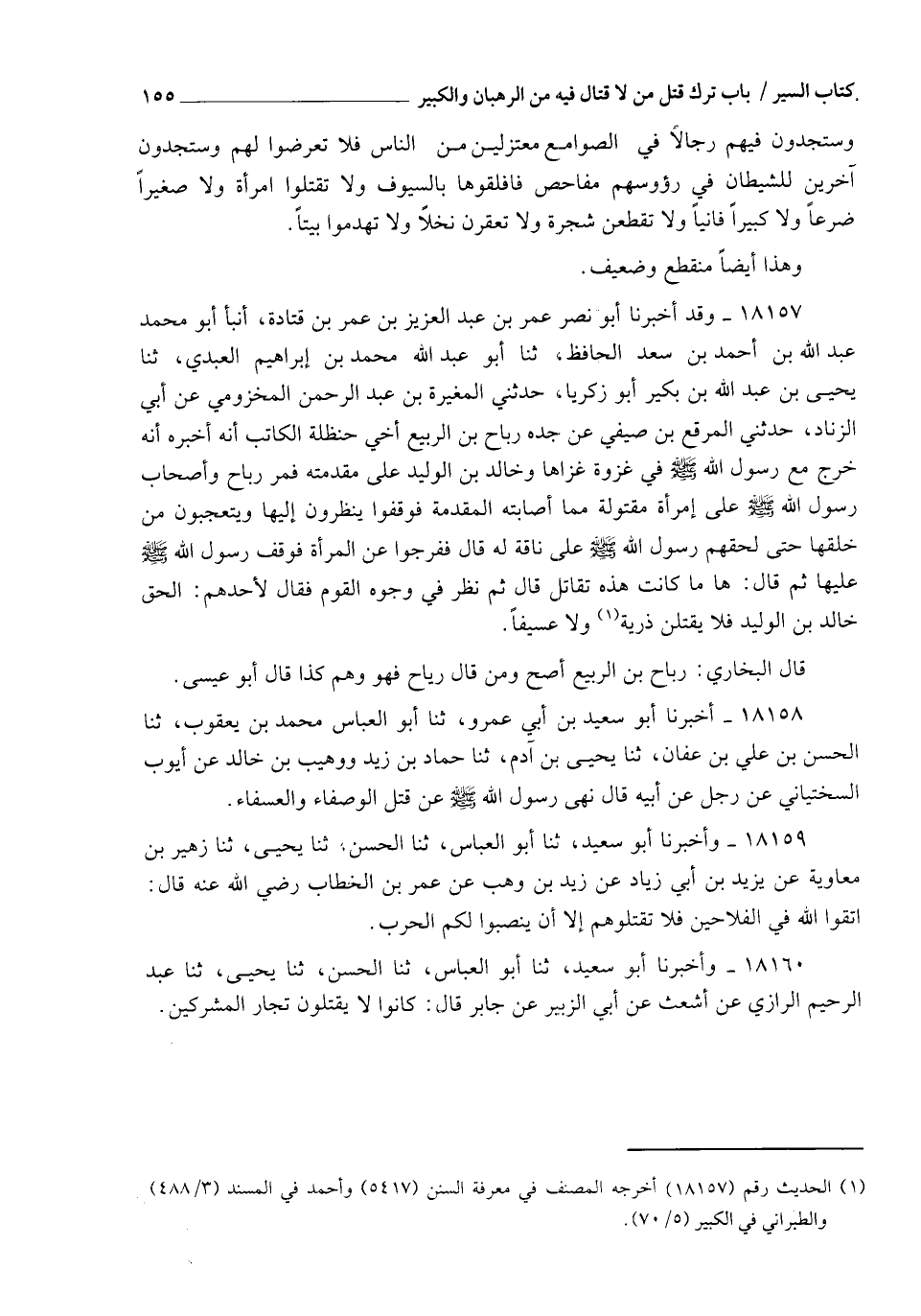 18157 - وَقَدْ أَخْبَرَنَا أَبُو نَصْرٍ عُمَرُ بْنُ عَبْدِ الْعَزِيزِ بْنِ عُمَرَ بْنِ قَتَادَةَ، أنبأ أَبُو مُحَمَّدٍ عَبْدُ اللهِ بْنُ أَحْمَدَ بْنِ سَعْدٍ الْحَافِظُ، ثنا أَبُو عَبْدِ اللهِ مُحَمَّدُ بْنُ إِبْرَاهِيمَ الْعَبْدِيُّ، ثنا يَحْيَى بْنُ عَبْدِ اللهِ بْنِ بُكَيْرٍ أَبُو زَكَرِيَّا، حَدَّثَنِي الْمُغِيرَةُ بْنُ عَبْدِ الرَّحْمَنِ الْمَخْزُومِيُّ، عَنْ أَبِي الزِّنَادِ، حَدَّثَنِي الْمُرَقَّعُ بْنُ صَيْفِيٍّ، عَنْ جَدِّهِ رَبَاحِ بْنِ الرَّبِيعِ أَخِي حَنْظَلَةَ الْكَاتِبِ، أَنَّهُ أَخْبَرَهُ أَنَّهُ خَرَجَ مَعَ رَسُولِ اللهِ صَلَّى اللهُ عَلَيْهِ وَسَلَّمَ فِي غَزْوَةٍ غَزَاهَا، وَخَالِدُ بْنُ الْوَلِيدِ عَلَى مُقَدِّمَتِهِ، فَمَرَّ رَبَاحٌ وَأَصْحَابُ رَسُولِ اللهِ صَلَّى اللهُ عَلَيْهِ وَسَلَّمَ عَلَى امْرَأَةٍ مَقْتُولَةٍ مِمَّا أَصَابَتْهُ الْمُقَدِّمَةُ، فَوَقَفُوا يَنْظُرُونَ إِلَيْهَا وَيَتَعَجَّبُونَ مِنْ خَلْقِهَا حَتَّى لَحِقَهُمْ رَسُولُ اللهِ صَلَّى اللهُ عَلَيْهِ وَسَلَّمَ عَلَى نَاقَةٍ لَهُ، قَالَ: فَفَرَّجُوا عَنِ الْمَرْأَةِ، فَوَقَفَ رَسُولُ اللهِ صَلَّى اللهُ عَلَيْهِ وَسَلَّمَ عَلَيْهَا، ثُمَّ قَالَ: " هَا مَا كَانَتْ هَذِهِ تُقَاتَلُ ". قَالَ: ثُمَّ نَظَرَ فِي وُجُوهِ الْقَوْمِ فَقَالَ لِأَحَدِهِمْ: " الْحَقْ خَالِدَ بْنَ الْوَلِيدِ §فَلَا يَقْتُلَنَّ ذُرِّيَّةً وَلَا عَسِيفًا ". قَالَ الْبُخَارِيُّ: رَبَاحُ بْنُ الرَّبِيعِ أَصَحُّ، وَمَنْ قَالَ رِيَاحٌ فَهُوَ وَهِمٌ. كَذَا قَالَ أَبُو عِيسَى