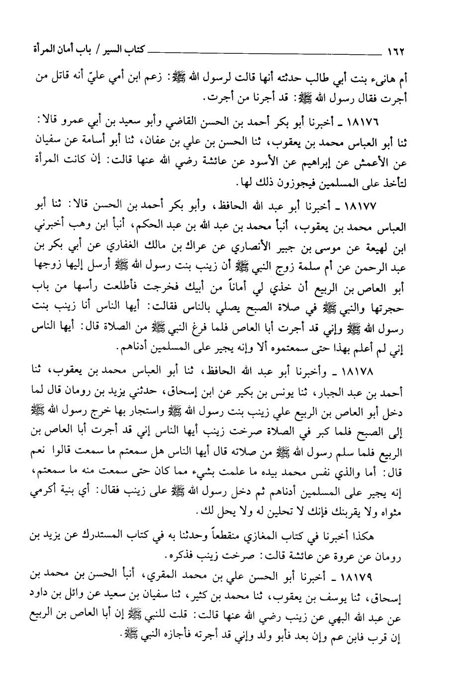 18178 - وَأَخْبَرَنَا أَبُو عَبْدِ اللهِ الْحَافِظُ، ثنا أَبُو الْعَبَّاسِ مُحَمَّدُ بْنُ يَعْقُوبَ، ثنا أَحْمَدُ بْنُ عَبْدِ الْجَبَّارِ، ثنا يُونُسُ بْنُ بُكَيْرٍ، عَنِ ابْنِ إِسْحَاقَ، حَدَّثَنِي يَزِيدُ بْنُ رُومَانَ، قَالَ: لَمَّا دَخَلَ أَبُو الْعَاصِ بْنُ الرَّبِيعِ عَلَى زَيْنَبَ بِنْتِ رَسُولِ اللهِ صَلَّى اللهُ عَلَيْهِ وَسَلَّمَ وَاسْتَجَارَ بِهَا، خَرَجَ رَسُولُ اللهِ صَلَّى اللهُ عَلَيْهِ وَسَلَّمَ إِلَى الصُّبْحِ، فَلَمَّا كَبَّرَ فِي الصَّلَاةِ صَرَخَتْ زَيْنَبُ: أَيُّهَا النَّاسُ، إِنِّي قَدْ §أَجَرْتُ أَبَا الْعَاصِ بْنَ الرَّبِيعِ. فَلَمَّا سَلَّمَ رَسُولَ اللهِ صَلَّى اللهُ عَلَيْهِ وَسَلَّمَ مِنْ صَلَاتِهِ، قَالَ: " أَيُّهَا النَّاسُ، هَلْ سَمِعْتُمْ مَا سَمِعْتُ؟ ". قَالُوا: نَعَمْ. قَالَ: " أَمَا وَالَّذِي نَفْسُ مُحَمَّدٍ بِيَدِهِ مَا عَلِمْتُ بِشَيْءٍ مِمَّا كَانَ حَتَّى سَمِعْتُ مِنْهُ مَا سَمِعْتُمْ، إِنَّهُ يُجِيرُ عَلَى الْمُسْلِمِينَ أَدْنَاهُمْ ". ثُمَّ دَخَلَ رَسُولُ اللهِ صَلَّى اللهُ عَلَيْهِ وَسَلَّمَ عَلَى زَيْنَبَ، فَقَالَ: " أَيْ بُنَيَّةُ أَكْرِمِي مَثْوَاهُ، وَلَا يَقْرَبَنَّكِ فَإِنَّكِ لَا تَحِلِّينَ لَهُ وَلَا يَحِلُّ لَكِ ". " هَكَذَا أُخْبِرْنَا فِي كِتَابِ الْمَغَازِي مُنْقَطِعًا، وَحُدِّثْنَا بِهِ فِي كِتَابِ الْمُسْتَدْرَكِ عَنْ يَزِيدَ بْنِ رُومَانَ، عَنْ عُرْوَةَ، عَنْ عَائِشَةَ قَالَتْ: صَرَخَتْ زَيْنَبُ فَذَكَرَهُ