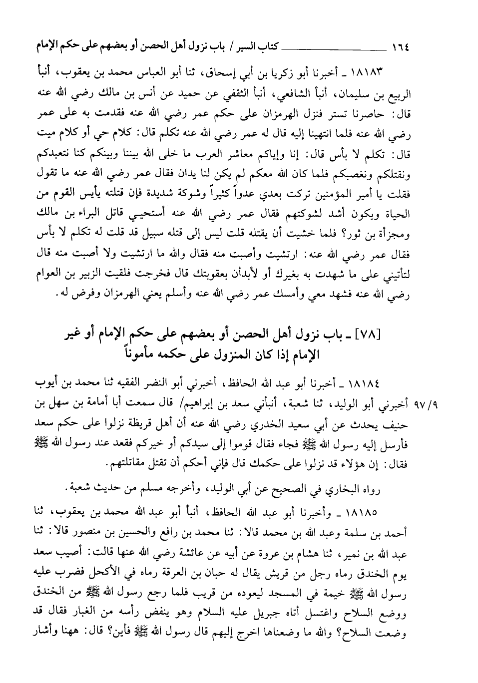 18185 - وَأَخْبَرَنَا أَبُو عَبْدِ اللهِ الْحَافِظُ، أنبأ أَبُو عَبْدِ اللهِ مُحَمَّدُ بْنُ يَعْقُوبَ، ثنا أَحْمَدُ بْنُ سَلَمَةَ، وَعَبْدُ اللهِ بْنُ مُحَمَّدٍ، قَالَا: ثنا مُحَمَّدُ بْنُ رَافِعٍ، وَالْحُسَيْنُ بْنُ مَنْصُورٍ، قَالَا: ثنا عَبْدُ اللهِ بْنُ نُمَيْرٍ، ثنا هِشَامُ بْنُ عُرْوَةَ، عَنْ أَبِيهِ، عَنْ عَائِشَةَ رَضِيَ اللهُ عَنْهَا، قَالَتْ: §أُصِيبَ سَعْدٌ يَوْمَ الْخَنْدَقِ، رَمَاهُ رَجُلٌ مِنْ قُرَيْشٍ يُقَالُ لَهُ حَبَّانُ بْنُ الْعَرِقَةِ، رَمَاهُ فِي الْأَكْحَلِ فَضَرَبَ عَلَيْهِ رَسُولُ اللهِ صَلَّى اللهُ عَلَيْهِ وَسَلَّمَ خَيْمَةً فِي الْمَسْجِدِ لِيَعُودَهُ مِنْ قَرِيبٍ، فَلَمَّا رَجَعَ رَسُولُ اللهِ صَلَّى اللهُ عَلَيْهِ وَسَلَّمَ مِنَ الْخَنْدَقِ وَوَضَعَ السِّلَاحَ وَاغْتَسَلَ، أَتَاهُ جِبْرِيلُ عَلَيْهِ السَّلَامُ وَهُوَ يَنْفُضُ رَأْسَهُ مِنَ الْغُبَارِ، فَقَالَ: قَدْ وَضَعْتَ السِّلَاحَ؟ وَاللهِ مَا وَضَعْنَاهَا اخْرُجْ إِلَيْهِمْ. قَالَ رَسُولُ اللهِ صَلَّى اللهُ عَلَيْهِ وَسَلَّمَ: " فَأَيْنَ؟ ". قَالَ: هَهُنَا، وَأَشَارَ -[165]- إِلَى بَنِي قُرَيْظَةَ، فَخَرَجَ رَسُولُ اللهِ صَلَّى اللهُ عَلَيْهِ وَسَلَّمَ إِلَيْهِمْ، فَنَزَلُوا عَلَى حُكْمِ رَسُولِ اللهِ صَلَّى اللهُ عَلَيْهِ وَسَلَّمَ، فَرَدَّ الْحُكْمَ فِيهِمْ إِلَى سَعْدٍ، قَالَ: فَإِنِّي أَحْكُمُ فِيهِمْ أَنْ تُقْتَلَ الْمُقَاتِلَةُ، وَتُسْبَى الذُّرِّيَّةُ، وَتُقْسَمَ أَمْوَالُهُمْ. قَالَ أَبِي: فَأُخْبِرْتُ أَنَّ رَسُولَ اللهِ صَلَّى اللهُ عَلَيْهِ وَسَلَّمَ قَالَ: " لَقَدْ حَكَمْتَ فِيهِمْ بِحُكْمِ اللهِ ". رَوَاهُ الْبُخَارِيُّ فِي الصَّحِيحِ عَنْ زَكَرِيَّا بْنِ يَحْيَى، وَرَوَاهُ مُسْلِمٌ، عَنْ أَبِي بَكْرِ بْنِ أَبِي شَيْبَةَ وَغَيْرِهِ، كُلُّهُمْ عَنِ ابْنِ نُمَيْرٍ