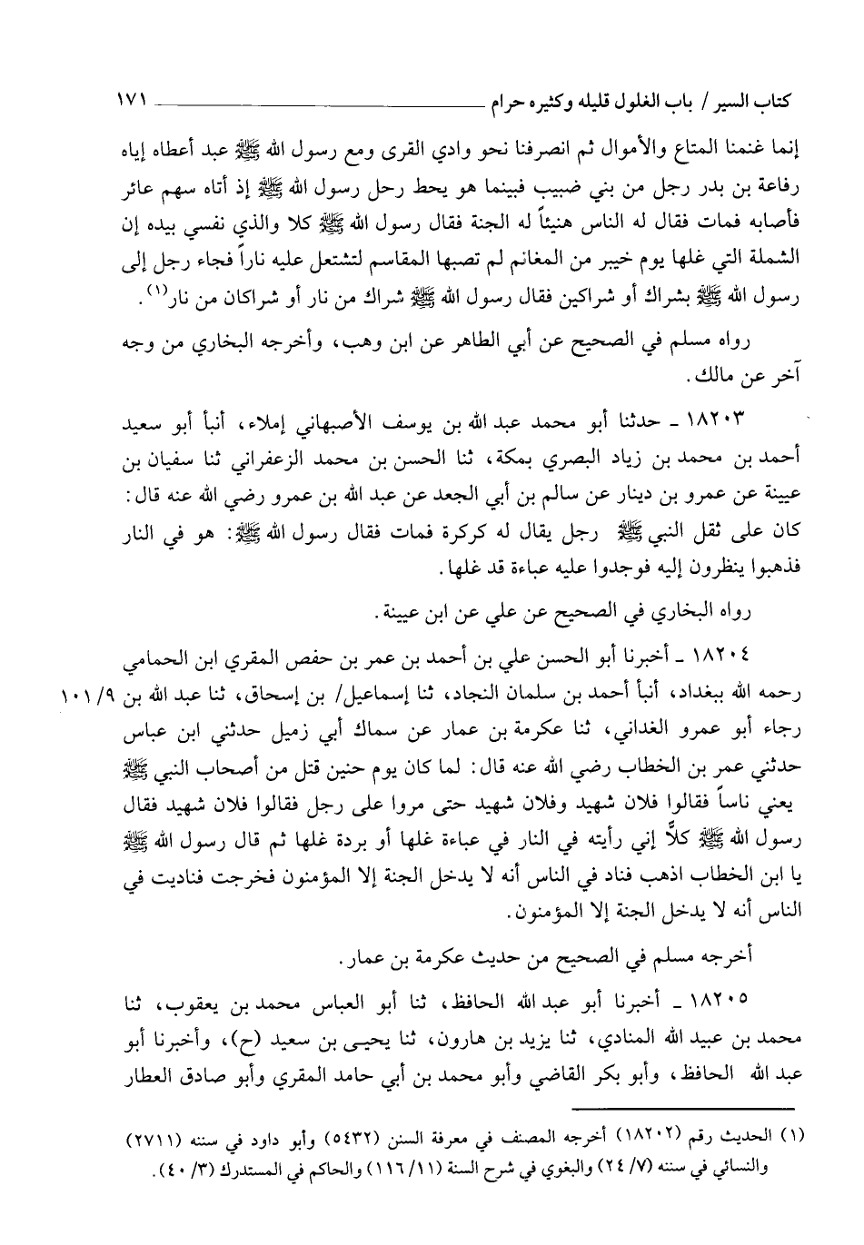 18204 - أَخْبَرَنَا أَبُو الْحَسَنِ عَلِيُّ بْنُ أَحْمَدَ بْنِ عُمَرَ بْنِ حَفْصٍ الْمُقْرِي بْنِ الْحَمَامِيِّ رَحِمَهُ اللهُ بِبَغْدَادَ , أنبأ أَحْمَدُ بْنُ سَلْمَانَ النَّجَّادُ، ثنا إِسْمَاعِيلُ بْنُ إِسْحَاقَ، ثنا عَبْدُ اللهِ بْنُ رَجَاءٍ أَبُو عَمْرٍو الْغُدَانِيُّ، ثنا عِكْرِمَةُ بْنُ عَمَّارٍ، عَنْ سِمَاكٍ أَبِي زُمَيْلٍ، حَدَّثَنِي ابْنُ عَبَّاسٍ، حَدَّثَنِي عُمَرُ بْنُ الْخَطَّابِ رَضِيَ اللهُ عَنْهُ قَالَ: لَمَّا كَانَ يَوْمُ حُنَيْنٍ قُتِلَ مِنْ أَصْحَابِ النَّبِيِّ صَلَّى اللهُ عَلَيْهِ وَسَلَّمَ , يَعْنِي نَاسًا , فَقَالُوا: فُلَانٌ شَهِيدٌ , وَفُلَانٌ شَهِيدٌ , حَتَّى مَرُّوا عَلَى رَجُلٍ فَقَالُوا: فُلَانٌ شَهِيدٌ , فَقَالَ رَسُولُ اللهِ صَلَّى اللهُ عَلَيْهِ وَسَلَّمَ: " كَلَّا إِنِّي §رَأَيْتُهُ فِي النَّارِ فِي عَبَاءَةٍ غَلَّهَا أَوْ بُرْدَةٍ غَلَّهَا ". ثُمَّ قَالَ رَسُولُ اللهِ صَلَّى اللهُ عَلَيْهِ وَسَلَّمَ: " يَا ابْنَ الْخَطَّابِ اذْهَبْ فَنَادِ فِي النَّاسِ أَنَّهُ لَا يَدْخُلُ الْجَنَّةَ إِلَّا الْمُؤْمِنُونَ ". فَخَرَجْتُ فَنَادَيْتُ فِي النَّاسِ أَنَّهُ لَا يَدْخُلُ الْجَنَّةَ إِلَّا الْمُؤْمِنُونَ. أَخْرَجَهُ مُسْلِمٌ فِي الصَّحِيحِ مِنْ حَدِيثِ عِكْرِمَةَ بْنِ عَمَّارٍ