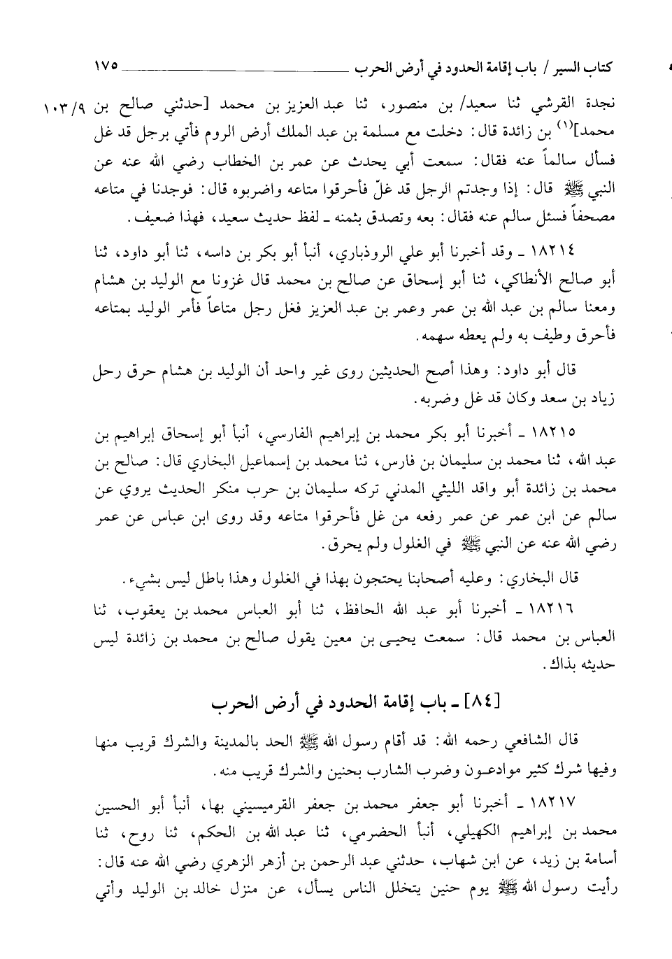 18214 - وَقَدْ أَخْبَرَنَا أَبُو عَلِيٍّ الرُّوذْبَارِيُّ، أنبأ أَبُو بَكْرِ بْنُ دَاسَةَ، ثنا أَبُو دَاوُدَ، ثنا أَبُو صَالِحٍ الْأَنْطَاكِيُّ، ثنا أَبُو إِسْحَاقَ، عَنْ صَالِحِ بْنِ مُحَمَّدٍ، قَالَ: غَزَوْنَا مَعَ الْوَلِيدِ بْنِ هِشَامٍ وَمَعَنَا سَالِمُ بْنُ عَبْدِ اللهِ بْنِ عُمَرَ، وَعُمَرُ بْنُ عَبْدِ الْعَزِيزِ , §فَغَلَّ رَجُلٌ مَتَاعًا فَأَمَرَ الْوَلِيدُ بِمَتَاعِهِ فَأُحْرِقَ وَطِيفَ بِهِ وَلَمْ يُعْطِهِ سَهْمَهُ. قَالَ أَبُو دَاوُدَ: وَهَذَا أَصَحُّ الْحَدِيثَيْنِ، رَوَى غَيْرُ وَاحِدٍ أَنَّ الْوَلِيدَ بْنَ هِشَامٍ حَرَّقَ رَحْلَ زِيَادِ بْنِ سَعْدٍ وَكَانَ قَدْ غَلَّ، وَضَرَبَهُ.