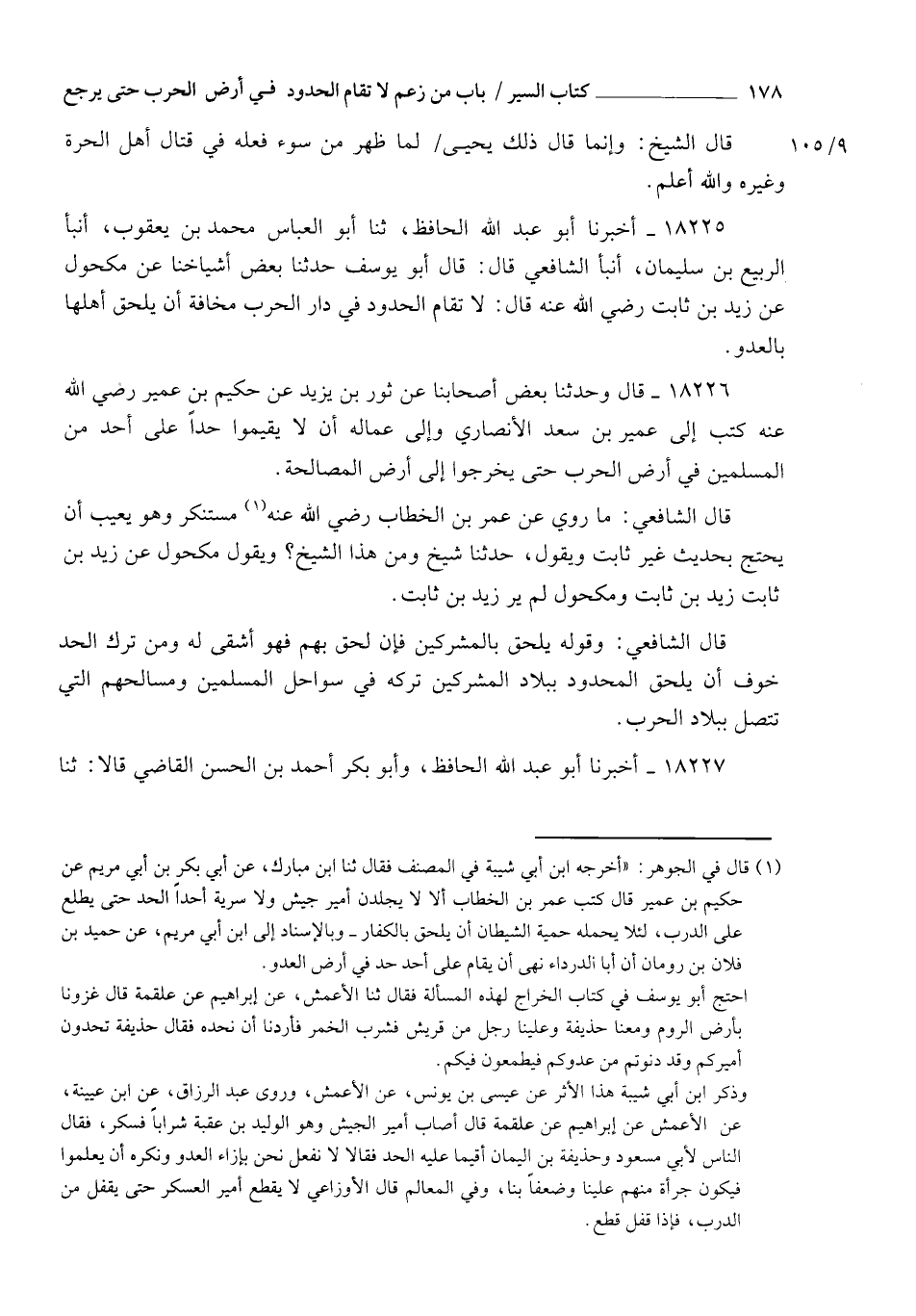 18226 - قَالَ: وَحَدَّثَنَا بَعْضُ أَصْحَابِنَا , عَنْ ثَوْرِ بْنِ يَزِيدَ، عَنْ حَكِيمِ بْنِ عُمَيْرٍ أَنَّ عُمَرَ رَضِيَ اللهُ عَنْهُ , كَتَبَ إِلَى عُمَيْرِ بْنِ سَعْدٍ الْأَنْصَارِيِّ وَإِلَى عُمَّالِهِ: " أَنْ §لَا يُقِيمُوا حَدًّا عَلَى أَحَدٍ مِنَ الْمُسْلِمِينَ فِي أَرْضِ الْحَرْبِ حَتَّى يَخْرُجُوا إِلَى أَرْضِ الْمُصَالَحَةِ ". قَالَ الشَّافِعِيُّ: مَا رُوِيَ عَنْ عُمَرَ بْنِ الْخَطَّابِ رَضِيَ اللهُ عَنْهُ مُسْتَنْكَرٌ , وَهُوَ يَعِيبُ أَنْ يُحْتَجَّ بِحَدِيثٍ غَيْرِ ثَابِتٍ , وَيَقُولُ: حَدَّثَنَا شَيْخٌ , وَمَنْ هَذَا الشَّيْخُ؟ وَيَقُولُ: مَكْحُولٌ عَنْ زَيْدِ بْنِ ثَابِتٍ وَمَكْحُولٌ لَمْ يَرَ زَيْدَ بْنَ ثَابِتٍ قَالَ الشَّافِعِيُّ: وَقَوْلُهُ يَلْحَقُ بِالْمُشْرِكِينَ , فَإِنْ لَحِقَ بِهِمْ فَهُوَ أَشْقَى لَهُ , وَمَنْ تَرَكَ الْحَدَّ خَوْفَ أَنْ يَلْحَقَ الْمَحْدُودُ بِبِلَادِ الْمُشْرِكِينَ تَرَكَهُ فِي سَوَاحِلِ الْمُسْلِمِينَ وَمَسَالِحِهِمُ الَّتِي تَتَّصِلُ بِبِلَادِ الْحَرْبِ