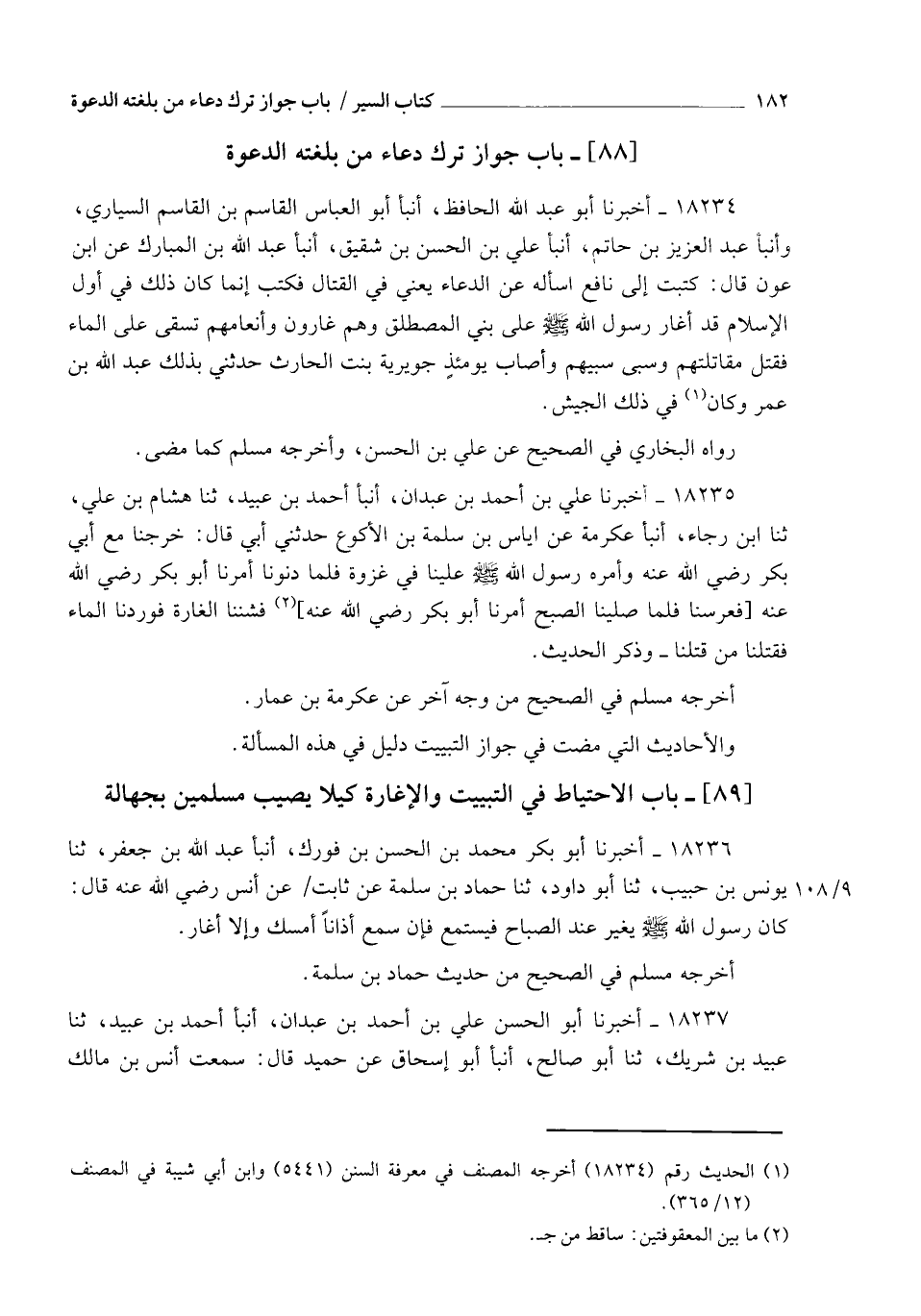 18235 - أَخْبَرَنَا عَلِيُّ بْنُ أَحْمَدَ بْنِ عَبْدَانَ، أنبأ أَحْمَدُ بْنُ عُبَيْدٍ، ثنا هِشَامُ بْنُ عَلِيٍّ، ثنا ابْنُ رَجَاءٍ، أنبأ عِكْرِمَةُ، عَنْ إِيَاسِ بْنِ سَلَمَةَ بْنِ الْأَكْوَعِ، حَدَّثَنِي أَبِي قَالَ: خَرَجْنَا مَعَ أَبِي بَكْرٍ رَضِيَ اللهُ عَنْهُ وَأَمَّرَهُ رَسُولُ اللهِ صَلَّى اللهُ عَلَيْهِ وَسَلَّمَ عَلَيْنَا فِي غَزْوَةٍ , فَلَمَّا دَنَوْنَا أَمَرَنَا أَبُو بَكْرٍ رَضِيَ اللهُ عَنْهُ , فَعَرَّسْنَا فَلَمَّا صَلَّيْنَا الصُّبْحَ §أَمَرَنَا أَبُو بَكْرٍ رَضِيَ اللهُ عَنْهُ فَشَنَنَّا الْغَارَةَ , فَوَرَدْنَا الْمَاءَ فَقَتَلْنَا مَنْ قَتَلْنَا. وَذَكَرَ الْحَدِيثَ. أَخْرَجَهُ مُسْلِمٌ فِي الصَّحِيحِ مِنْ وَجْهٍ آخَرَ عَنْ عِكْرِمَةَ بْنِ عَمَّارٍ , وَالْأَحَادِيثُ الَّتِي مَضَتْ فِي جَوَازِ التَّبْيِيتِ دَلِيلٌ فِي هَذِهِ الْمَسْأَلَةِ