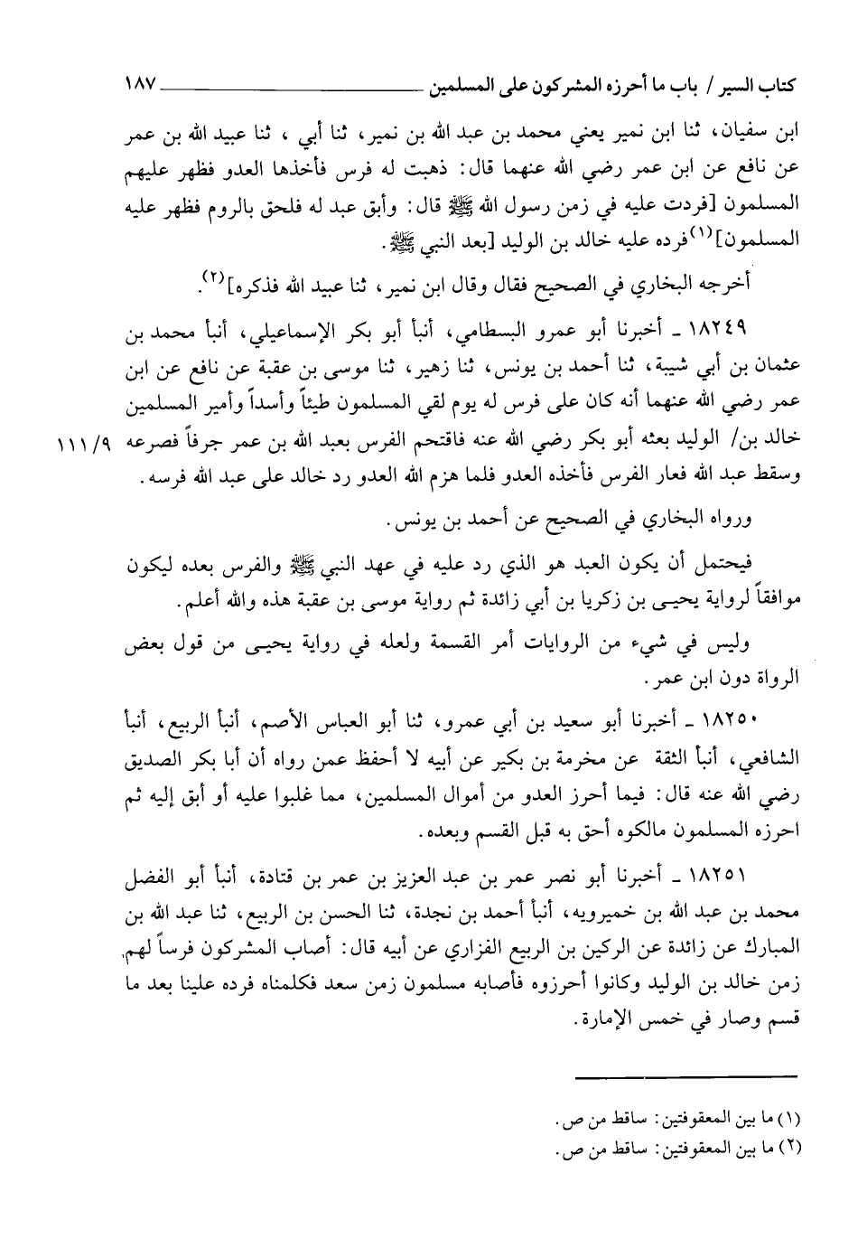 18249 - أَخْبَرَنَا أَبُو عَمْرٍو الْبِسْطَامِيُّ، أنبأ أَبُو بَكْرٍ الْإِسْمَاعِيلِيُّ، أنبأ مُحَمَّدُ بْنُ عُثْمَانَ بْنِ أَبِي شَيْبَةَ، ثنا أَحْمَدُ بْنُ يُونُسَ، ثنا زُهَيْرٌ، ثنا مُوسَى بْنُ عُقْبَةَ، عَنْ نَافِعٍ، عَنِ ابْنِ عُمَرَ رَضِيَ اللهُ عَنْهُمَا أَنَّهُ §كَانَ عَلَى فَرَسٍ لَهُ يَوْمَ لَقِيَ الْمُسْلِمُونَ طَيِّئًا وَأَسَدًا , وَأَمِيرُ الْمُسْلِمِينَ خَالِدُ بْنُ الْوَلِيدِ بَعَثَهُ أَبُو بَكْرٍ رَضِيَ اللهُ عَنْهُ , فَاقْتَحَمَ الْفَرَسُ بِعَبْدِ اللهِ بْنِ عُمَرَ جُرُفًا فَصَرَعَهُ , وَسَقَطَ عَبْدُ اللهِ , فَعَارَ الْفَرَسُ فَأَخَذَهُ الْعَدُوُّ , فَلَمَّا هَزَمَ اللهُ الْعَدُوَّ رَدَّ خَالِدٌ عَلَى عَبْدِ اللهِ فَرَسَهُ ". رَوَاهُ الْبُخَارِيُّ فِي الصَّحِيحِ عَنْ أَحْمَدَ بْنِ يُونُسَ فَيُحْتَمَلَ أَنْ يَكُونَ الْعَبْدُ هُوَ الَّذِي رُدَّ عَلَيْهِ فِي عَهْدِ النَّبِيِّ صَلَّى اللهُ عَلَيْهِ وَسَلَّمَ وَالْفَرَسُ بَعْدَهُ لِيَكُونَ مُوَافِقًا لِرِوَايَةِ يَحْيَى بْنِ زَكَرِيَّا بْنِ أَبِي زَائِدَةَ , ثُمَّ رِوَايَةِ مُوسَى بْنِ عُقْبَةَ هَذِهِ , وَاللهُ أَعْلَمُ وَلَيْسَ فِي شَيْءٍ مِنَ الرِّوَايَاتِ أَمْرُ الْقِسْمَةِ , وَلَعَلَّهُ فِي رِوَايَةِ يَحْيَى مِنْ قَوْلِ بَعْضِ الرُّوَاةِ دُونَ ابْنِ عُمَرَ