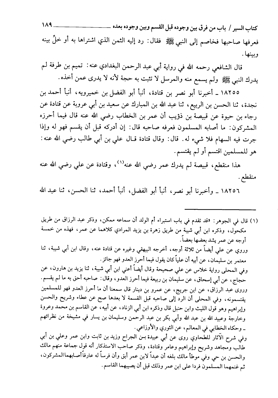 18255 - أَخْبَرَنَا أَبُو نَصْرِ بْنُ قَتَادَةَ، أنبأ أَبُو الْفَضْلِ بْنُ خَمِيرَوَيْهِ، أنبأ أَحْمَدُ بْنُ نَجْدَةَ، ثنا الْحَسَنُ بْنُ الرَّبِيعِ، ثنا عَبْدُ اللهِ بْنُ الْمُبَارَكِ، عَنْ سَعِيدِ بْنِ أَبِي عَرُوبَةَ، عَنْ قَتَادَةَ، عَنْ رَجَاءِ بْنِ حَيْوَةَ، عَنْ قَبِيصَةَ بْنِ ذُؤَيْبٍ أَنَّ عُمَرَ بْنَ الْخَطَّابِ رَضِيَ اللهُ عَنْهُ قَالَ فِيمَا أَحْرَزَهُ الْمُشْرِكُونَ: مَا أَصَابَهُ الْمُسْلِمُونَ فَعَرَفَهُ صَاحِبُهُ، قَالَ: §" إِنْ أَدْرَكَهُ قَبْلَ أَنْ يُقْسَمَ فَهُوَ لَهُ , وَإِذَا جَرَتْ فِيهِ السِّهَامُ فَلَا شَيْءَ لَهُ ". قَالَ: وَقَالَ قَتَادَةُ: قَالَ عَلِيُّ بْنُ أَبِي طَالِبٍ رَضِيَ اللهُ عَنْهُ: " هُوَ لِلْمُسْلِمِينَ , اقْتُسِمَ أَوْ لَمْ يُقْتَسَمْ ". هَذَا مُنْقَطِعٌ قَبِيصَةُ لَمْ يُدْرِكْ عُمَرَ رَضِيَ اللهُ عَنْهُ , وَقَتَادَةُ عَنْ عَلِيٍّ رَضِيَ اللهُ عَنْهُ مُنْقَطِعٌ