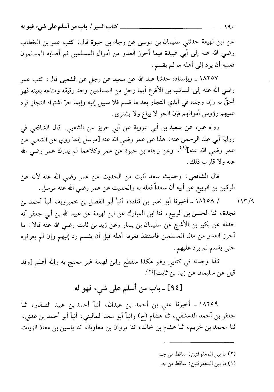 18258 - أَخْبَرَنَا أَبُو نَصْرِ بْنُ قَتَادَةَ، أنبأ أَبُو الْفَضْلِ بْنُ خَمِيرَوَيْهِ، أنبأ أَحْمَدُ بْنُ نَجْدَةَ، ثنا الْحَسَنُ بْنُ الرَّبِيعِ، ثنا ابْنُ الْمُبَارَكِ، عَنِ ابْنِ لَهِيعَةَ، عَنْ عُبَيْدِ اللهِ بْنِ أَبِي جَعْفَرٍ، أَنَّهُ حَدَّثَهُ عَنْ بُكَيْرِ بْنِ الْأَشَجِّ، عَنْ سُلَيْمَانَ بْنِ يَسَارٍ، وَعَنْ زَيْدِ بْنِ ثَابِتٍ رَضِيَ اللهُ عَنْهُ قَالَا: §" مَا أَحْرَزَ الْعَدُوُّ مِنْ مَالِ الْمُسْلِمِينَ فَاسْتُنْقِذَ فَعَرَفَهُ أَهْلُهُ قَبْلَ أَنْ يُقْسَمَ رُدَّ إِلَيْهِمْ , وَإِنْ لَمْ يَعْرِفُوهُ حَتَّى يُقْسَمَ لَمْ يُرَدَّ عَلَيْهِمْ ". كَذَا وَجَدْتُهُ فِي كِتَابِي وَهُوَ هَكَذَا مُنْقَطِعٌ , وَابْنُ لَهِيعَةَ غَيْرُ مُحْتَجٍّ بِهِ , وَاللهُ أَعْلَمُ , وَقَدْ قِيلَ: عَنْ سُلَيْمَانَ عَنْ زَيْدِ بْنِ ثَابِتٍ