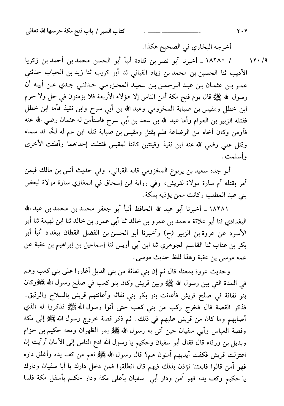 18280 - أَخْبَرَنَا أَبُو نَصْرِ بْنُ قَتَادَةَ، أنبأ أَبُو الْحَسَنِ مُحَمَّدُ بْنُ أَحْمَدَ بْنِ زَكَرِيَّا الْأَدِيبُ , ثنا الْحُسَيْنُ بْنُ مُحَمَّدِ بْنِ زِيَادٍ الْقَبَّانِيُّ، ثنا أَبُو كُرَيْبٍ، ثنا زَيْدُ بْنُ الْحُبَابِ، حَدَّثَنِي عُمَرُ بْنُ عُثْمَانَ بْنِ عَبْدِ الرَّحْمَنِ بْنِ سَعِيدٍ الْمَخْزُومِيُّ، حَدَّثَنِي جَدِّي، عَنْ أَبِيهِ، أَنَّ رَسُولَ اللهِ صَلَّى اللهُ عَلَيْهِ وَسَلَّمَ قَالَ يَوْمَ فَتْحِ مَكَّةَ §" أُمِّنَ النَّاسُ إِلَّا هَؤُلَاءِ الْأَرْبَعَةُ فَلَا يُؤَمَّنُونَ فِي حِلٍّ وَلَا حَرَمٍ , ابْنُ خَطَلٍ , وَمَقِيسُ بْنُ صُبَابَةَ الْمَخْزُومِيُّ , وَعَبْدُ اللهِ بْنُ أَبِي سَرْحٍ , وَابْنُ نُقَيْذٍ ". فَأَمَّا ابْنُ خَطَلٍ فَقَتَلَهُ الزُّبَيْرُ بْنُ الْعَوَّامِ , وَأَمَّا عَبْدُ اللهِ بْنُ سَعْدِ بْنِ أَبِي سَرْحٍ فَاسْتَأْمَنَ لَهُ عُثْمَانُ رَضِيَ اللهُ عَنْهُ فَأُومِنَ , وَكَانَ أَخَاهُ مِنَ الرَّضَاعَةِ فَلَمْ يُقْتَلْ , وَمَقِيسُ بْنُ صُبَابَةَ قَتَلَهُ ابْنُ عَمٍّ لَهُ لَحًّا قَدْ سَمَّاهُ , وَقَتَلَ عَلِيٌّ رَضِيَ اللهُ عَنْهُ ابْنَ نُقَيذٍ وَقَيْنَتَيْنِ كَانَتَا لِمَقِيسٍ فَقُتِلَتْ إِحْدَاهُمَا وَأَفْلَتَتِ الْأُخْرَى وَأَسْلَمَتْ أَبُو جَدِّهِ سَعِيدُ بْنُ يَرْبُوعٍ الْمَخْزُومِيُّ , قَالَهُ الْقَبَّانِيُّ , وَفِي حَدِيثِ أَنَسِ بْنِ مَالِكٍ فِيمَنْ أَمَرَ بِقَتْلِهِ أُمُّ سَارَّةَ مَوْلَاةٌ لِقُرَيْشٍ , وَفِي رِوَايَةِ ابْنِ إِسْحَاقَ فِي الْمَغَازِي سَارَّةُ مَوْلَاةٌ لِبَعْضِ بَنِي عَبْدِ الْمُطَّلِبِ , وَكَانَتْ مِمَّنْ يُؤْذِيهِ بِمَكَّةَ