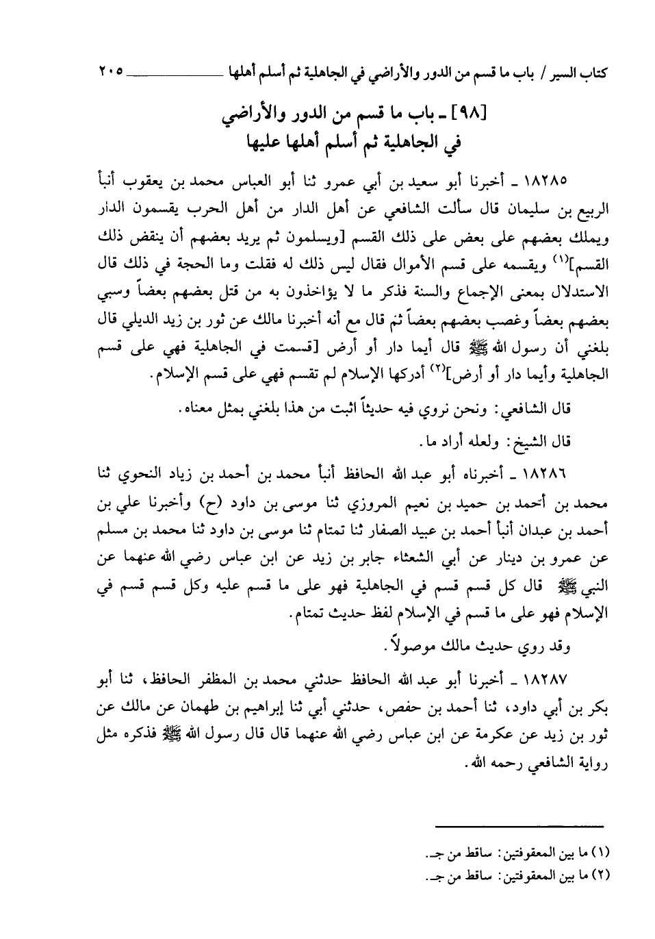 18285 - أَخْبَرَنَا أَبُو سَعِيدِ بْنُ أَبِي عَمْرٍو، ثنا أَبُو الْعَبَّاسِ مُحَمَّدُ بْنُ يَعْقُوبَ , أنبأ الرَّبِيعُ بْنُ سُلَيْمَانَ، قَالَ: سَأَلْتُ الشَّافِعِيَّ عَنْ أَهْلِ الدَّارِ مِنْ أَهْلِ الْحَرْبِ يَقْسِمُونَ الدَّارَ وَيَمْلِكُ بَعْضُهُمْ عَلَى بَعْضٍ عَلَى ذَلِكَ الْقَسْمِ , وَيُسْلِمُونَ ثُمَّ يُرِيدُ بَعْضُهُمْ أَنْ يَنْقُضَ ذَلِكَ الْقَسْمَ وَيَقْسِمَهُ عَلَى قَسْمِ الْأَمْوَالِ فَقَالَ: لَيْسَ ذَلِكَ لَهُ. فَقُلْتُ: وَمَا الْحُجَّةُ فِي ذَلِكَ؟ قَالَ: الِاسْتِدْلَالُ بِمَعْنَى الْإِجْمَاعِ وَالسُّنَّةِ , فَذَكَرَ مَا لَا يُؤَاخَذُونَ بِهِ مِنْ قَتْلِ بَعْضِهِمْ بَعْضًا وَسَبْيِ بَعْضِهِمْ بَعْضًا وَغَصْبِ بَعْضِهِمْ بَعْضًا , ثُمَّ قَالَ: مَعَ أَنَّهُ أَخْبَرَنَا مَالِكٌ عَنْ ثَوْرِ بْنِ زَيْدٍ الدِّيلِيِّ قَالَ: بَلَغَنِي أَنَّ رَسُولَ اللهِ صَلَّى اللهُ عَلَيْهِ وَسَلَّمَ قَالَ: §" أَيُّمَا دَارٍ أَوْ أَرْضٍ قُسِمَتْ فِي الْجَاهِلِيَّةِ فَهِيَ عَلَى قَسْمِ الْجَاهِلِيَّةِ , وَأَيُّمَا دَارٍ أَوْ أَرْضٍ أَدْرَكَهَا الْإِسْلَامُ لَمْ تُقْسَمْ فَهِيَ عَلَى قَسْمِ الْإِسْلَامِ " قَالَ الشَّافِعِيُّ: وَنَحْنُ نَرْوِي فِيهِ حَدِيثًا أَثْبَتَ مِنْ هَذَا , بَلَغَنِي بِمِثْلِ مَعْنَاهُ. قَالَ الشَّيْخُ: وَلَعَلَّهُ أَرَادَ مَا: