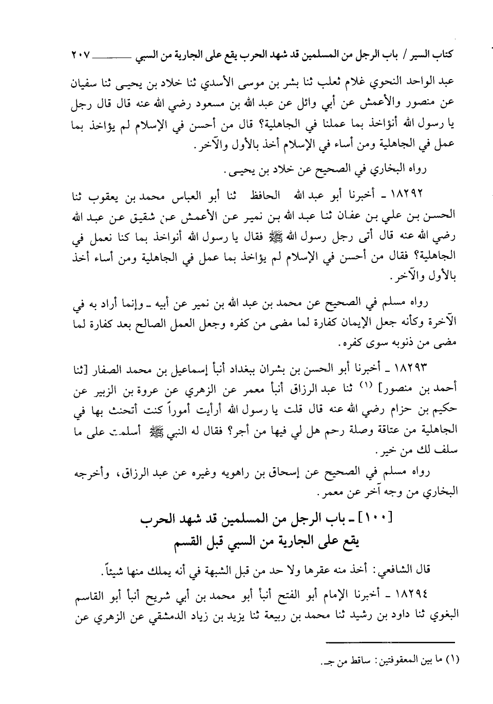 18293 - أَخْبَرَنَا أَبُو الْحُسَيْنِ بْنُ بِشْرَانَ بِبَغْدَادَ , أنبأ إِسْمَاعِيلُ بْنُ مُحَمَّدٍ الصَّفَّارُ، ثنا أَحْمَدُ بْنُ مَنْصُورٍ، ثنا عَبْدُ الرَّزَّاقِ، أنبأ مَعْمَرٌ، عَنِ الزُّهْرِيِّ، عَنْ عُرْوَةَ بْنِ الزُّبَيْرِ، عَنْ حَكِيمِ بْنِ حِزَامٍ رَضِيَ اللهُ عَنْهُ قَالَ: قُلْتُ: يَا رَسُولَ اللهِ أَرَأَيْتَ أُمُورًا كُنْتُ أَتَحَنَّثُ بِهَا فِي الْجَاهِلِيَّةِ مِنْ عَتَاقَةٍ وَصِلَةِ رَحِمٍ هَلْ لِي فِيهَا مِنْ أَجْرٍ؟ فَقَالَ لَهُ النَّبِيُّ صَلَّى اللهُ عَلَيْهِ وَسَلَّمَ: §" أَسْلَمْتَ عَلَى مَا سَلَفَ لَكَ مِنْ خَيْرٍ ". رَوَاهُ مُسْلِمٌ فِي الصَّحِيحِ عَنْ إِسْحَاقَ بْنِ رَاهَوَيْهِ وَغَيْرِهِ، عَنْ عَبْدِ الرَّزَّاقِ , وَأَخْرَجَهُ الْبُخَارِيُّ مِنْ وَجْهٍ آخَرَ عَنْ مَعْمَرٍ