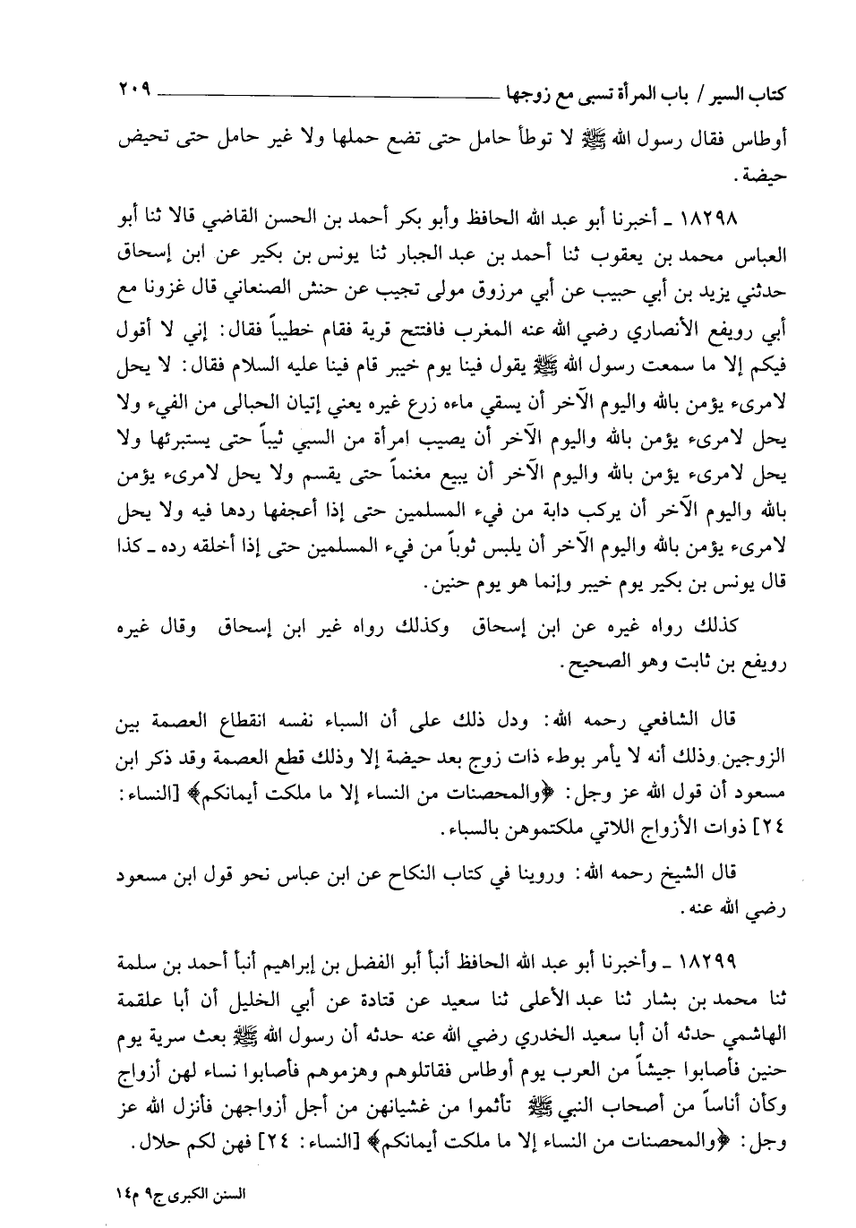 18298 - أَخْبَرَنَا أَبُو عَبْدِ اللهِ الْحَافِظُ، وَأَبُو بَكْرٍ أَحْمَدُ بْنُ الْحَسَنِ الْقَاضِي قَالَا: ثنا أَبُو الْعَبَّاسِ مُحَمَّدُ بْنُ يَعْقُوبَ، ثنا أَحْمَدُ بْنُ عَبْدِ الْجَبَّارِ، ثنا يُونُسُ بْنُ بُكَيْرٍ، عَنِ ابْنِ إِسْحَاقَ، حَدَّثَنِي يَزِيدُ بْنُ أَبِي حَبِيبٍ، عَنْ أَبِي مَرْزُوقٍ مَوْلَى تُجِيبَ , عَنْ حَنَشٍ الصَّنْعَانِيِّ، قَالَ: غَزَوْنَا مَعَ أَبِي رُوَيْفِعٍ الْأَنْصَارِيِّ رَضِيَ اللهُ عَنْهُ الْمَغْرِبَ , فَافْتَتَحَ قَرْيَةً فَقَامَ خَطِيبًا فَقَالَ: إِنِّي لَا أَقُولُ فِيكُمْ إِلَّا مَا سَمِعْتُ رَسُولَ اللهِ صَلَّى اللهُ عَلَيْهِ وَسَلَّمَ يَقُولُ فِينَا يَوْمَ خَيْبَرَ قَامَ فِينَا عَلَيْهِ السَّلَامُ فَقَالَ: §" لَا يَحِلُّ لِامْرِئٍ يُؤْمِنُ بِاللهِ وَالْيَوْمِ الْآخِرِ أَنْ يَسْقِيَ مَاءَهُ زَرْعَ غَيْرِهِ " يَعْنِي إِتْيَانَ الْحَبَالَى مِنَ الْفَيْءِ , " وَلَا يَحِلُّ لِامْرِئٍ يُؤْمِنُ بِاللهِ وَالْيَوْمِ الْآخِرِ أَنْ يُصِيبَ امْرَأَةً مِنَ السَّبْيِ ثَيِّبًا حَتَّى يَسْتَبْرِئَهَا , وَلَا يَحِلُّ لِامْرِئٍ يُؤْمِنُ بِاللهِ وَالْيَوْمِ الْآخِرِ أَنْ يَبِيعَ مَغْنَمًا حَتَّى يُقْسَمَ , وَلَا يَحِلُّ لِامْرِئٍ يُؤْمِنُ بِاللهِ وَالْيَوْمِ الْآخِرِ أَنْ يَرْكَبَ دَابَّةً مِنْ فَيْءِ الْمُسْلِمِينَ حَتَّى إِذَا أَعْجَفَهَا رَدَّهَا فِيهِ , وَلَا يَحِلُّ لِامْرِئٍ يُؤْمِنُ بِاللهِ وَالْيَوْمِ الْآخِرِ أَنْ يَلْبَسَ ثَوْبًا مِنْ فَيْءِ الْمُسْلِمِينَ حَتَّى إِذَا أَخْلَقَهُ رَدَّهُ ". كَذَا قَالَ يُونُسُ بْنُ بُكَيْرٍ يَوْمَ خَيْبَرَ , وَإِنَّمَا هُوَ يَوْمَ حُنَيْنٍ , كَذَلِكَ رَوَاهُ غَيْرُهُ عَنِ ابْنِ إِسْحَاقَ , وَكَذَلِكَ رَوَاهُ غَيْرُ ابْنِ إِسْحَاقَ , وَقَالَ غَيْرُهُ: رُوَيْفِعُ بْنُ ثَابِتٍ وَهُوَ الصَّحِيحُ قَالَ الشَّافِعِيُّ رَحِمَهُ اللهُ: وَدَلَّ ذَلِكَ عَلَى أَنَّ السِّبَاءَ نَفْسَهُ انْقِطَاعُ الْعِصْمَةِ بَيْنَ الزَّوْجَيْنِ , وَذَلِكَ أَنَّهُ لَا يَأْمُرُ بِوَطْءِ ذَاتِ زَوْجٍ بَعْدَ حَيْضَةٍ إِلَّا وَذَلِكَ قَطَعَ الْعِصْمَةَ , وَقَدْ ذَكَرَ ابْنُ مَسْعُودٍ أَنَّ قَوْلَ اللهِ عَزَّ وَجَلَّ: {وَالْمُحْصَنَاتُ مِنَ النِّسَاءِ إِلَّا مَا مَلَكَتْ أَيْمَانُكُمْ} [النساء: 24] ذَوَاتُ الْأَزْوَاجِ اللَّاتِي مَلَكْتُمُوهُنَّ بِالسِّبَاءِ قَالَ الشَّيْخُ رَحِمَهُ اللهُ: وَرُوِّينَا فِي كِتَابِ النِّكَاحِ عَنِ ابْنِ عَبَّاسٍ نَحْوَ قَوْلِ ابْنِ مَسْعُودٍ رَضِيَ اللهُ عَنْهُ