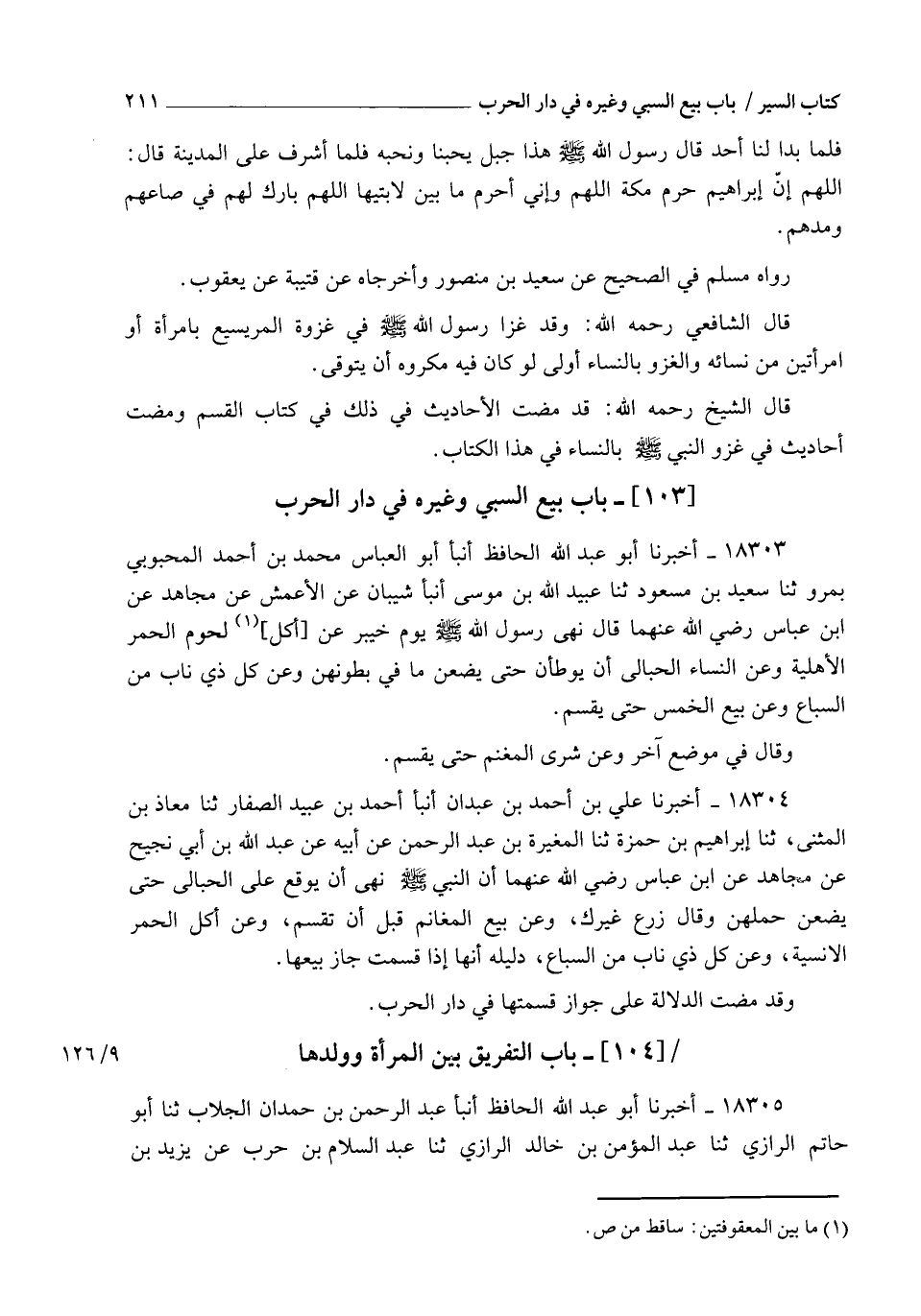 18303 - أَخْبَرَنَا أَبُو عَبْدِ اللهِ الْحَافِظُ، أنبأ أَبُو الْعَبَّاسِ مُحَمَّدُ بْنُ أَحْمَدَ الْمَحْبُوبِيُّ بِمَرْوَ , ثنا سَعِيدُ بْنُ مَسْعُودٍ، ثنا عُبَيْدُ اللهِ بْنُ مُوسَى، أنبأ شَيْبَانُ، عَنِ الْأَعْمَشِ، عَنْ مُجَاهِدٍ، عَنِ ابْنِ عَبَّاسٍ رَضِيَ اللهُ عَنْهُمَا قَالَ: §" نَهَى رَسُولُ اللهِ صَلَّى اللهُ عَلَيْهِ وَسَلَّمَ يَوْمَ خَيْبَرَ عَنْ أَكْلِ لُحُومِ الْحُمُرِ الْأَهْلِيَّةِ , وَعَنِ النِّسَاءِ الْحَبَالَى أَنْ يُوطَأْنَ حَتَّى يَضَعْنَ مَا فِي بُطُونِهِنَّ , وَعَنْ كُلِّ ذِي نَابٍ مِنَ السِّبَاعِ , وَعَنْ بَيْعِ الْخُمُسِ حَتَّى يُقْسَمَ ". وَقَالَ فِي مَوْضِعٍ آخَرَ: وَعَنْ شِرَى الْمَغْنَمِ حَتَّى يُقْسَمَ "