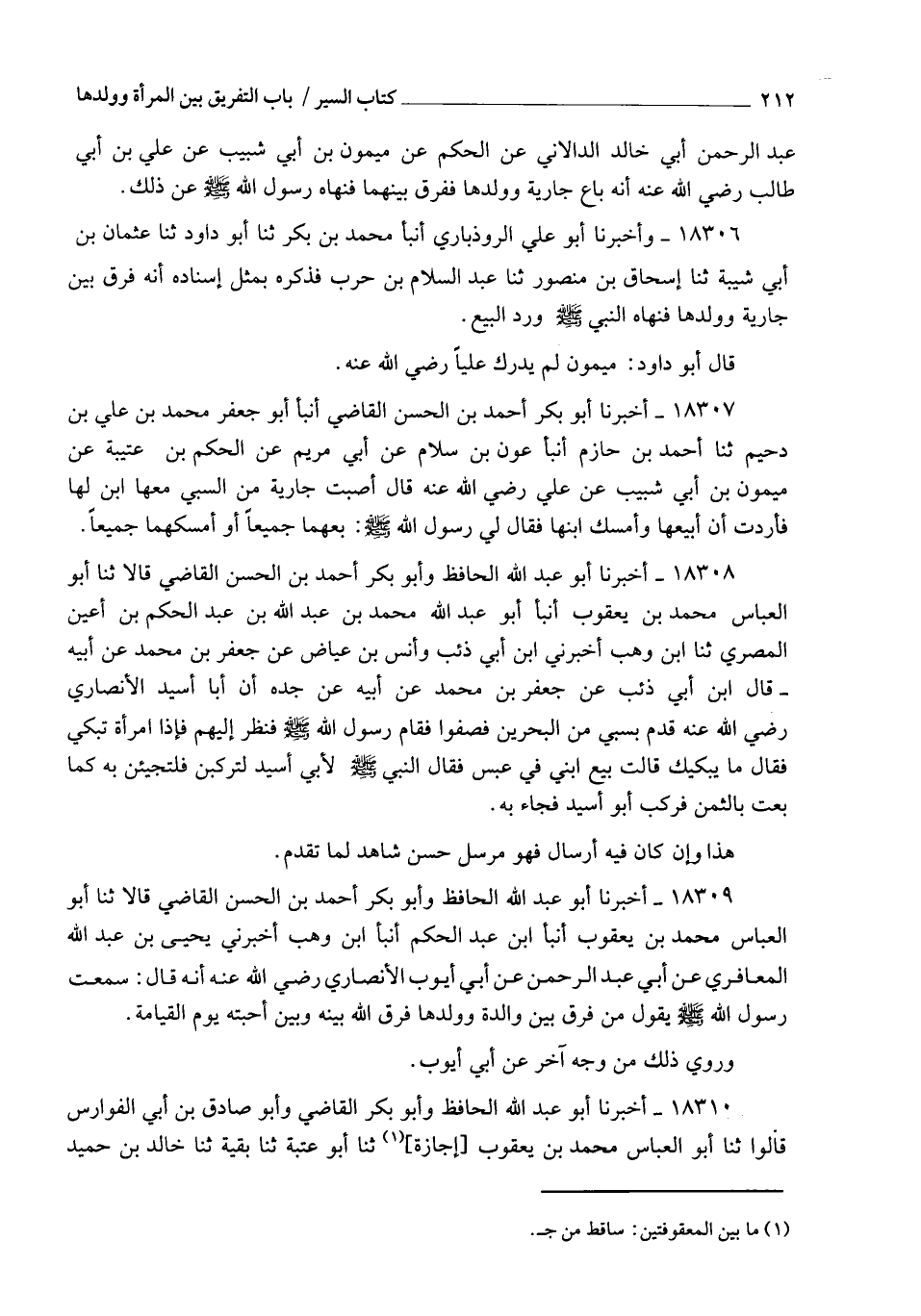 18308 - أَخْبَرَنَا أَبُو عَبْدِ اللهِ الْحَافِظُ، وَأَبُو بَكْرٍ أَحْمَدُ بْنُ الْحَسَنِ الْقَاضِي قَالَا: ثنا أَبُو الْعَبَّاسِ مُحَمَّدُ بْنُ يَعْقُوبَ , أنبأ أَبُو عَبْدِ اللهِ مُحَمَّدُ بْنُ عَبْدِ اللهِ بْنِ عَبْدِ الْحَكَمِ بْنِ أَعْيَنَ الْمِصْرِيُّ، ثنا ابْنُ وَهْبٍ، أَخْبَرَنِي ابْنُ أَبِي ذِئْبٍ، وَأَنَسُ بْنُ عِيَاضٍ، عَنْ جَعْفَرِ بْنِ مُحَمَّدٍ، عَنْ أَبِيهِ , قَالَ ابْنُ أَبِي ذِئْبٍ: عَنْ جَعْفَرِ بْنِ مُحَمَّدٍ، عَنْ أَبِيهِ، عَنْ جَدِّهِ، أَنَّ أَبَا أُسَيْدٍ الْأَنْصَارِيَّ رَضِيَ اللهُ عَنْهُ قَدِمَ بِسَبْيٍ مِنَ الْبَحْرَيْنِ فَصُفُّوا , فَقَامَ رَسُولُ اللهِ صَلَّى اللهُ عَلَيْهِ وَسَلَّمَ فَنَظَرَ إِلَيْهِمْ , فَإِذَا امْرَأَةٌ تَبْكِي , فَقَالَ: " مَا يُبْكِيكِ؟ " قَالَتْ: بِيعَ ابْنِي فِي عَبْسٍ , فَقَالَ النَّبِيُّ صَلَّى اللهُ عَلَيْهِ وَسَلَّمَ لِأَبِي أُسَيْدٍ: §" لَتَرْكَبَنَّ فَلَتَجِيئَنَّ بِهِ كَمَا بِعْتَ بِالثَّمَنِ ". فَرَكِبَ أَبُو أُسَيْدٍ فَجَاءَ بِهِ. هَذَا وَإِنْ كَانَ فِيهِ إِرْسَالٌ فَهُوَ مُرْسَلٌ حَسَنٌ شَاهِدٌ لِمَا تَقَدَّمَ