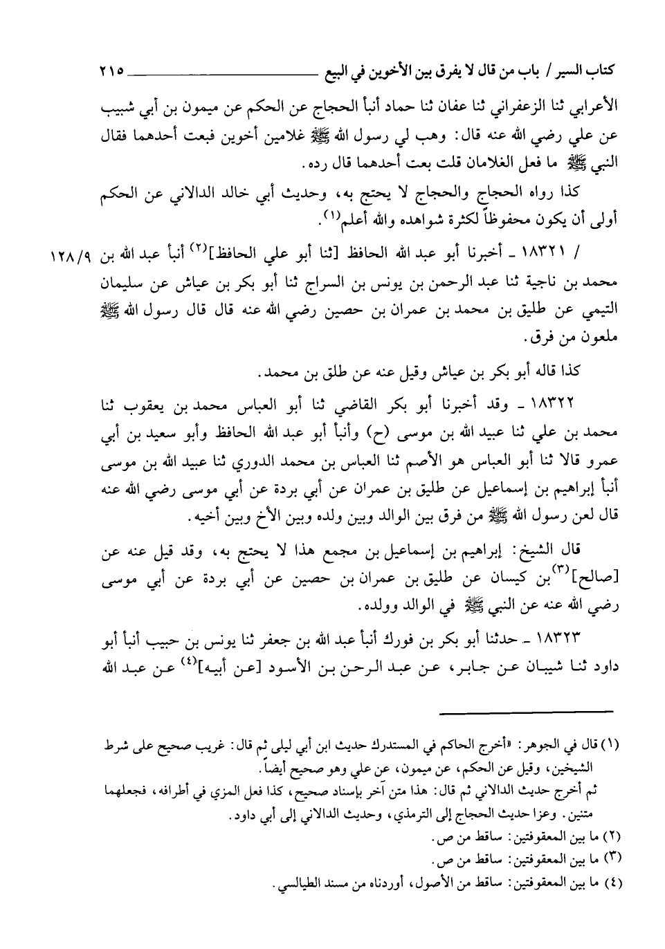 18322 - وَقَدْ أَخْبَرَنَا أَبُو بَكْرٍ الْقَاضِي، ثنا أَبُو الْعَبَّاسِ مُحَمَّدُ بْنُ يَعْقُوبَ، ثنا مُحَمَّدُ بْنُ عَلِيٍّ، ثنا عُبَيْدُ اللهِ بْنُ مُوسَى، ح وَأنبأ أَبُو عَبْدِ اللهِ الْحَافِظُ، وَأَبُو سَعِيدِ بْنُ أَبِي عَمْرٍو قَالَا: ثنا أَبُو الْعَبَّاسِ هُوَ الْأَصَمُّ، ثنا الْعَبَّاسُ بْنُ مُحَمَّدٍ الدُّورِيُّ، ثنا عُبَيْدُ اللهِ بْنُ مُوسَى، أنبأ إِبْرَاهِيمُ بْنُ إِسْمَاعِيلَ، عَنْ طَلِيقِ بْنِ عِمْرَانَ، عَنْ أَبِي بُرْدَةَ، عَنْ أَبِي مُوسَى رَضِيَ اللهُ عَنْهُ قَالَ: §لَعَنَ رَسُولُ اللهِ صَلَّى اللهُ عَلَيْهِ وَسَلَّمَ مَنْ فَرَّقَ بَيْنَ الْوَالِدِ وَبَيْنَ وَلَدِهِ , وَبَيْنَ الْأَخِ وَبَيْنَ أَخِيهِ. قَالَ الشَّيْخُ: إِبْرَاهِيمُ بْنُ إِسْمَاعِيلَ بْنِ مُجَمِّعٍ هَذَا لَا يُحْتَجُّ بِهِ وَقَدْ قِيلَ عَنْهُ، عَنْ صَالِحِ بْنِ كَيْسَانَ , عَنْ طَلِيقِ بْنِ عِمْرَانَ بْنِ حُصَيْنٍ , عَنْ أَبِي بُرْدَةَ , عَنْ أَبِي مُوسَى رَضِيَ اللهُ عَنْهُ , عَنِ النَّبِيِّ صَلَّى اللهُ عَلَيْهِ وَسَلَّمَ فِي الْوَالِدِ وَوَلَدِهِ