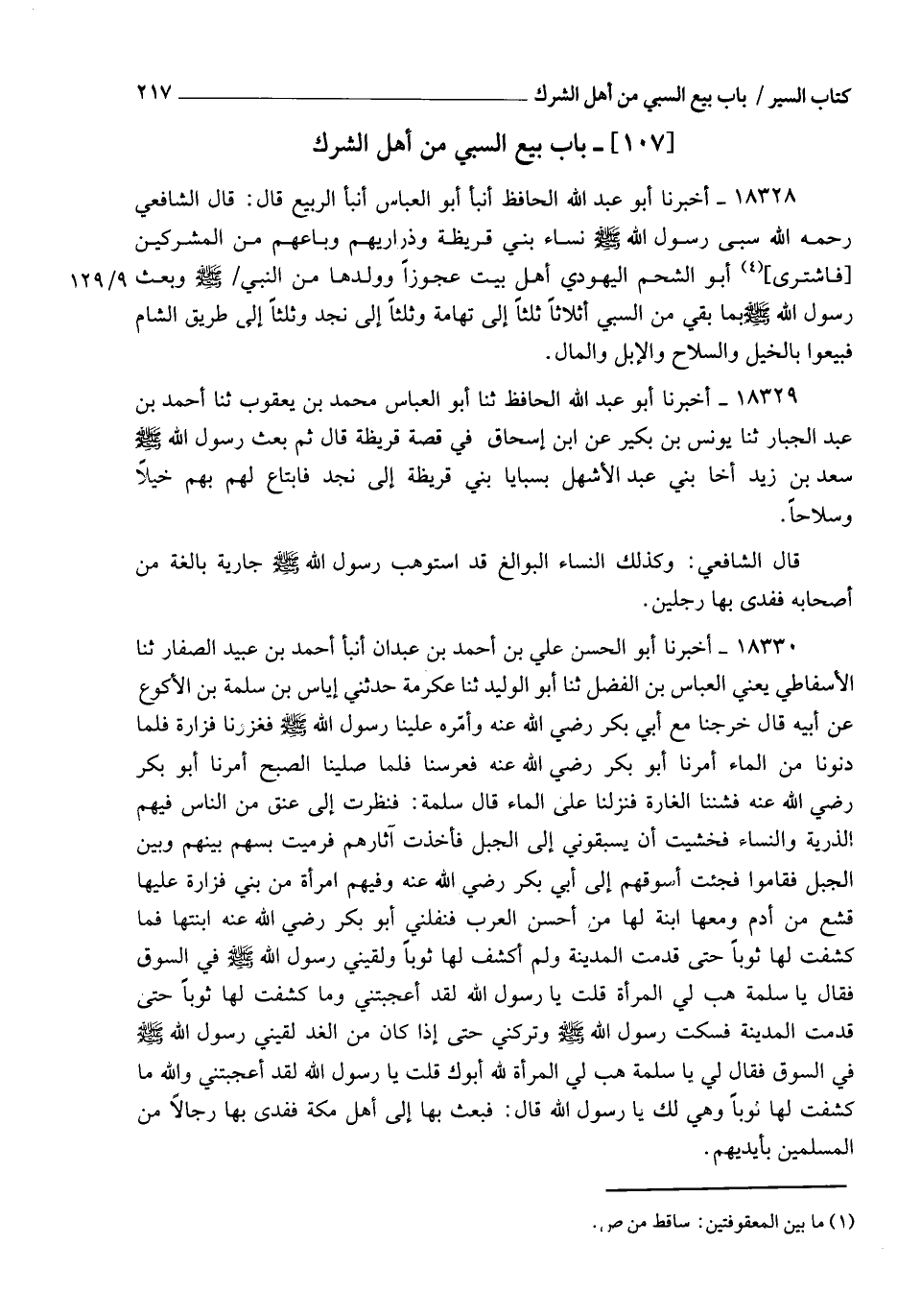 18328 - أَخْبَرَنَا أَبُو عَبْدِ اللهِ الْحَافِظُ، أنبأ أَبُو الْعَبَّاسِ، أنبأ الرَّبِيعُ، قَالَ: قَالَ الشَّافِعِيُّ رَحِمَهُ اللهُ: §سَبَى رَسُولُ اللهِ صَلَّى اللهُ عَلَيْهِ وَسَلَّمَ نِسَاءَ بَنِي قُرَيْظَةَ وَذَرَارِيَّهُمْ وَبَاعَهُمْ مِنَ الْمُشْرِكِينَ، فَاشْتَرَى أَبُو الشَّحْمِ الْيَهُودِيُّ أَهْلَ بَيْتٍ , عَجُوزًا وَوَلَدَهَا مِنَ النَّبِيِّ صَلَّى اللهُ عَلَيْهِ وَسَلَّمَ , وَبَعَثَ رَسُولُ اللهِ صَلَّى اللهُ عَلَيْهِ وَسَلَّمَ بِمَا بَقِيَ مِنَ السَّبْيِ أَثْلَاثًا , ثُلُثًا إِلَى تِهَامَةَ , وَثُلُثًا إِلَى نَجْدٍ , وَثُلُثًا إِلَى طَرِيقِ الشَّامِ , فَبِيعُوا بِالْخَيْلِ وَالسِّلَاحِ وَالْإِبِلِ وَالْمَالِ