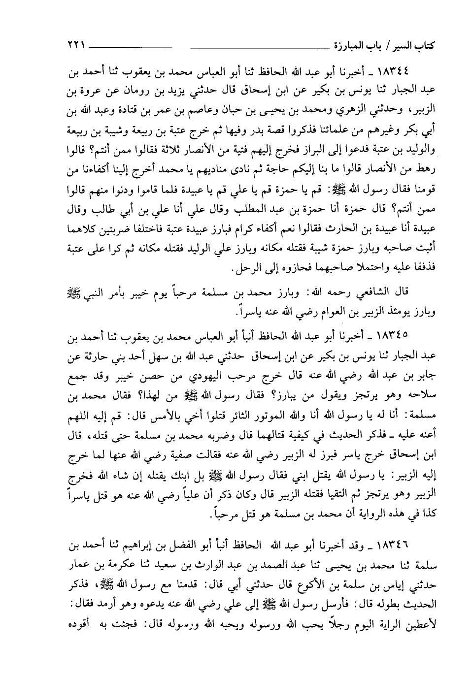 18344 - أَخْبَرَنَا أَبُو عَبْدِ اللهِ الْحَافِظُ، ثنا أَبُو الْعَبَّاسِ مُحَمَّدُ بْنُ يَعْقُوبَ , ثنا أَحْمَدُ بْنُ عَبْدِ الْجَبَّارِ، ثنا يُونُسُ بْنُ بُكَيْرٍ، عَنِ ابْنِ إِسْحَاقَ، قَالَ: حَدَّثَنِي يَزِيدُ بْنُ رُومَانَ، عَنْ عُرْوَةَ بْنِ الزُّبَيْرِ، وَحَدَّثَنِي الزُّهْرِيُّ، وَمُحَمَّدُ بْنُ يَحْيَى بْنِ حَبَّانَ، وَعَاصِمُ بْنُ عُمَرَ بْنِ قَتَادَةَ، وَعَبْدُ اللهِ بْنُ أَبِي بَكْرٍ، وَغَيْرُهُمْ مِنْ عُلَمَائِنَا , فَذَكَرُوا قِصَّةَ بَدْرٍ وَفِيهَا: ثُمَّ §خَرَجَ عُتْبَةُ بْنُ رَبِيعَةَ وَشَيْبَةُ بْنُ رَبِيعَةَ وَالْوَلِيدُ بْنُ عُتْبَةَ فَدَعَوْا إِلَى الْبِرَازِ , فَخَرَجَ إِلَيْهِمْ فِتْيَةٌ مِنَ الْأَنْصَارِ ثَلَاثَةٌ , فَقَالُوا: مِمَّنْ أَنْتُمْ؟ قَالُوا: رَهْطٌ مِنَ الْأَنْصَارِ. قَالُوا: مَا بِنَا إِلَيْكُمْ حَاجَةٌ. ثُمَّ نَادَى مُنَادِيهِمْ: يَا مُحَمَّدُ أَخْرِجْ إِلَيْنَا أَكْفَاءَنَا مِنْ قَوْمِنَا. فَقَالَ رَسُولُ اللهِ صَلَّى اللهُ عَلَيْهِ وَسَلَّمَ: " قُمْ يَا حَمْزَةُ , قُمْ يَا عَلِيُّ , قُمْ يَا عُبَيْدَةُ ". فَلَمَّا قَامُوا وَدَنَوْا مِنْهُمْ قَالُوا: مِمَّنْ أَنْتُمْ؟ قَالَ حَمْزَةُ: أَنَا حَمْزَةُ بْنُ عَبْدِ الْمُطَّلِبِ , وَقَالَ عَلِيٌّ: أَنَا عَلِيُّ بْنُ أَبِي طَالِبٍ , وَقَالَ عُبَيْدَةُ: أَنَا عُبَيْدَةُ بْنُ الْحَارِثِ. فَقَالُوا: نَعَمْ أَكْفَاءٌ كِرَامٌ , فَبَارَزَ عُبَيْدَةُ عُتْبَةَ فَاخْتَلَفَا ضَرْبَتَيْنِ كِلَاهُمَا أَثْبَتَ صَاحِبَهُ , وَبَارَزَ حَمْزَةُ شَيْبَةَ فَقَتَلَهُ مَكَانَهُ , وَبَارَزَ عَلِيٌّ الْوَلِيدَ فَقَتَلَهُ مَكَانَهُ , ثُمَّ كَرَّا عَلَى عُتْبَةَ فَذَفَفَا عَلَيْهِ وَاحْتَمَلَا صَاحِبَهُمَا فَحَازُوهُ إِلَى الرَّحْلِ قَالَ الشَّافِعِيُّ رَحِمَهُ اللهُ: وَبَارَزَ مُحَمَّدُ بْنُ مَسْلَمَةَ مَرْحَبًا يَوْمَ خَيْبَرَ بِأَمْرِ النَّبِيِّ صَلَّى اللهُ عَلَيْهِ وَسَلَّمَ , وَبَارَزَ يَوْمَئِذٍ الزُّبَيْرُ بْنُ الْعَوَّامِ رَضِيَ اللهُ عَنْهُ يَاسِرًا