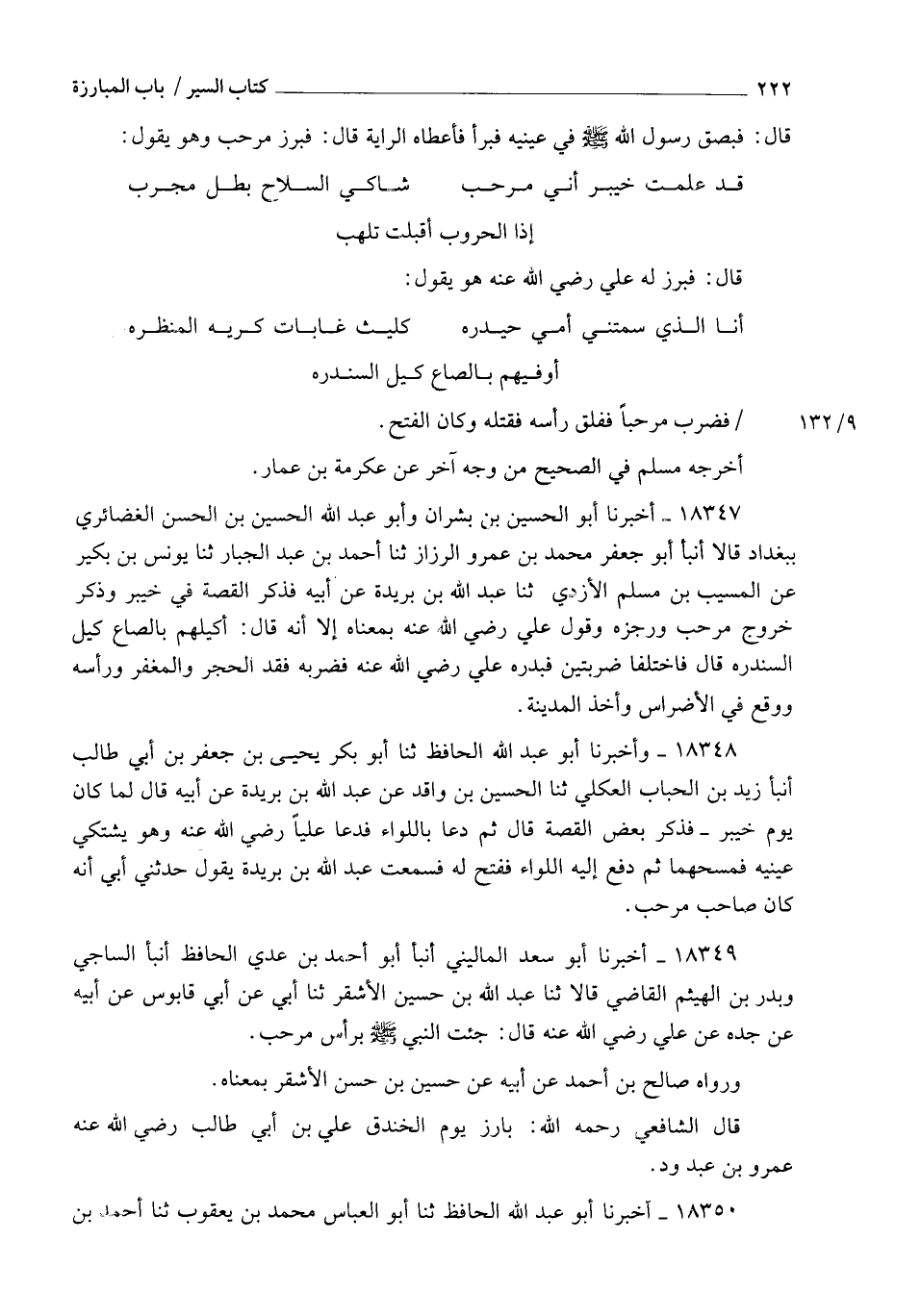 18349 - أَخْبَرَنَا أَبُو سَعْدٍ الْمَالِينِيُّ، أنبأ أَبُو أَحْمَدَ بْنُ عَدِيٍّ الْحَافِظُ، أنبأ السَّاجِيُّ، وَبَدْرُ بْنُ الْهَيْثَمِ الْقَاضِي، قَالَا: ثنا عَبْدُ اللهِ بْنُ حُسَيْنٍ الْأَشْقَرُ، ثنا أَبِي، عَنْ أَبِي قَابُوسَ، عَنْ أَبِيهِ، عَنْ جَدِّهِ، عَنْ عَلِيٍّ رَضِيَ اللهُ عَنْهُ قَالَ: §جِئْتُ النَّبِيَّ صَلَّى اللهُ عَلَيْهِ وَسَلَّمَ بِرَأْسِ مَرْحَبٍ وَرَوَاهُ صَالِحُ بْنُ أَحْمَدَ , عَنْ أَبِيهِ , عَنْ حُسَيْنِ بْنِ حَسَنٍ الْأَشْقَرِ بِمَعْنَاهُ قَالَ الشَّافِعِيُّ رَحِمَهُ اللهُ: بَارَزَ يَوْمَ الْخَنْدَقِ عَلِيُّ بْنُ أَبِي طَالِبٍ رَضِيَ اللهُ عَنْهُ عَمْرَو بْنَ عَبْدِ وُدٍّ
