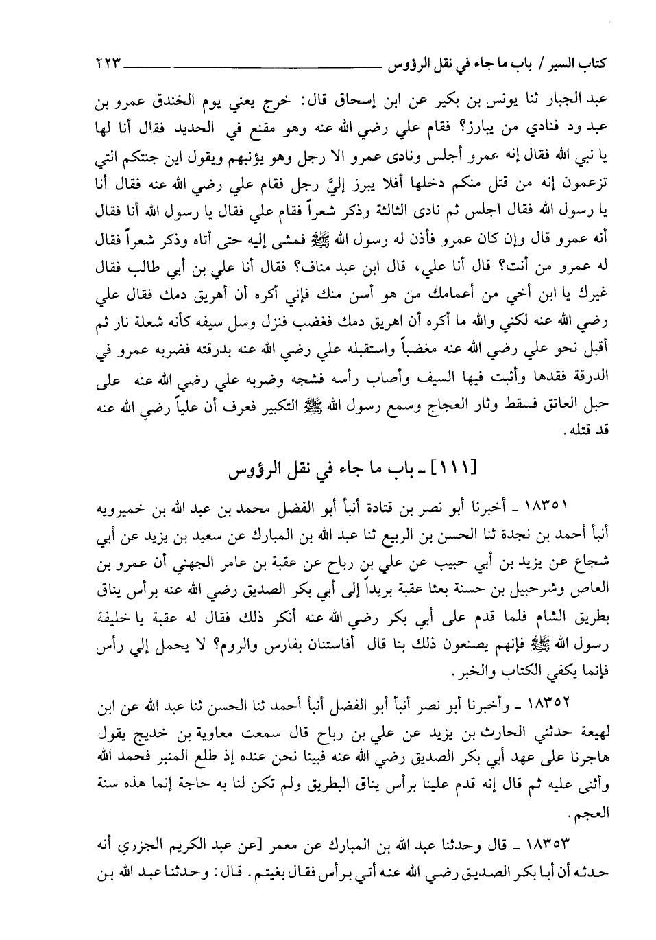 18354 - قَالَ الشَّيْخُ: وَالَّذِي رَوَى أَبُو دَاوُدَ فِي الْمَرَاسِيلِ، عَنْ عَبْدِ اللهِ بْنِ الْجَرَّاحِ، عَنْ حَمَّادِ بْنِ أُسَامَةَ، عَنْ بَشِيرِ بْنِ عُقْبَةَ، عَنْ أَبِي نَضْرَةَ، قَالَ: لَقِيَ النَّبِيُّ صَلَّى اللهُ عَلَيْهِ وَسَلَّمَ الْعَدُوَّ فَقَالَ: " مَنْ جَاءَ بِرَأْسٍ فَلَهُ عَلَى اللهِ مَا تَمَنَّى ". فَجَاءَهُ رَجُلَانِ بِرَأْسٍ فَاخْتَصَمَا فِيهِ , فَقَضَى بِهِ لِأَحَدِهِمَا. أَخْبَرَنَاهُ أَبُو بَكْرِ بْنُ مُحَمَّدٍ , أَنْبَأَ أَبُو الْحُسَيْنِ الْفَسَوِيُّ , ثنا أَبُو عَلِيٍّ اللُّؤْلُؤِيُّ , ثنا أَبُو دَاوُدَ فَذَكَرَهُ. فَهَذَا حَدِيثٌ مُنْقَطِعٌ , وَفِيهِ إِنْ ثَبَتَ تَحْرِيضٌ عَلَى قَتْلِ الْعَدُوِّ , وَلَيْسَ فِيهِ نَقْلُ الرَّأْسِ مِنْ بِلَادِ الشِّرْكِ إِلَى بِلَادِ الْإِسْلَامِ