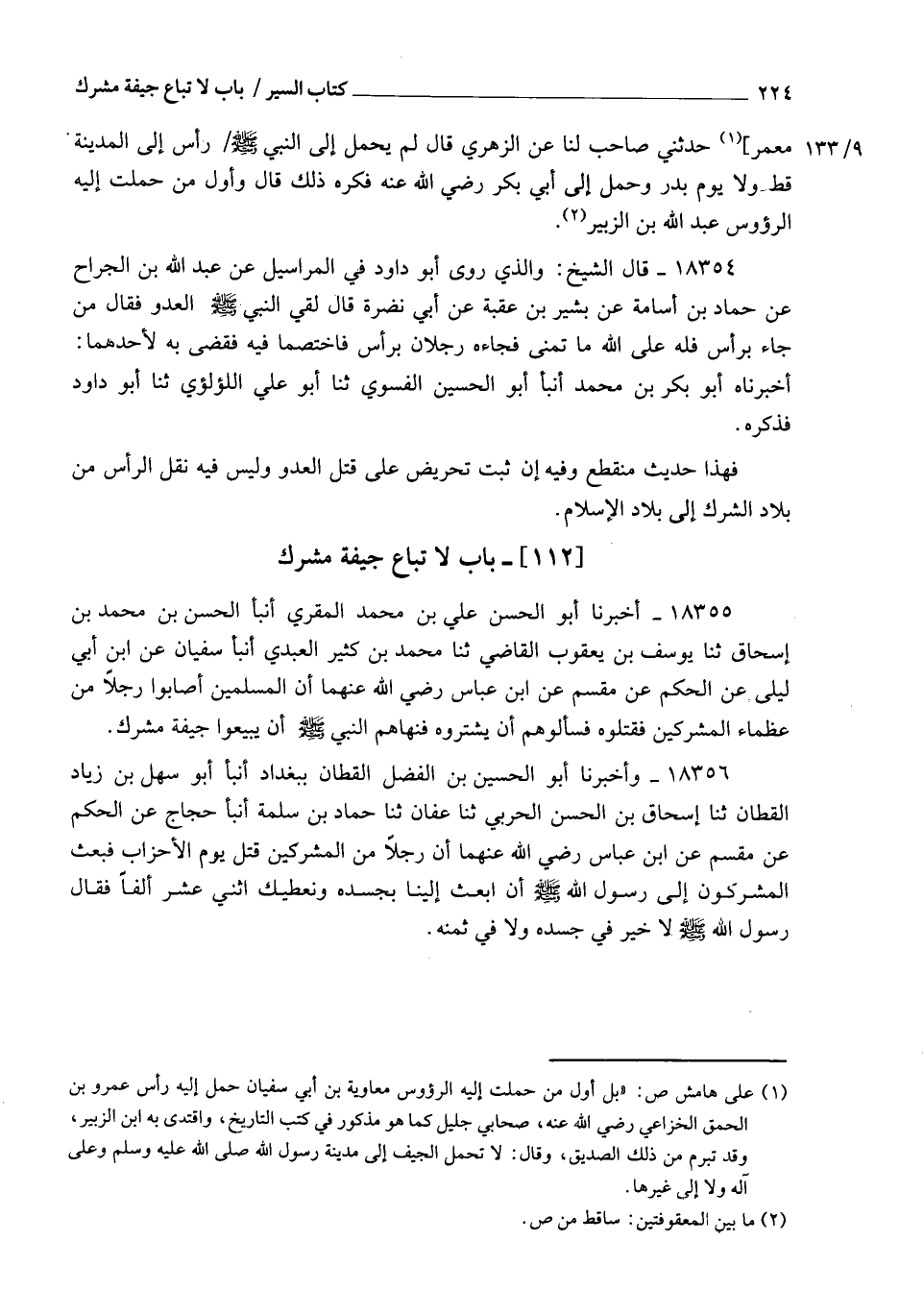 18355 - أَخْبَرَنَا أَبُو الْحَسَنِ عَلِيُّ بْنُ مُحَمَّدٍ الْمُقْرِئُ , أنبأ الْحَسَنُ بْنُ مُحَمَّدِ بْنِ إِسْحَاقَ، ثنا يُوسُفُ بْنُ يَعْقُوبَ الْقَاضِي، ثنا مُحَمَّدُ بْنُ كَثِيرٍ الْعَبْدِيُّ، أنبأ سُفْيَانُ، عَنِ ابْنِ أَبِي لَيْلَى، عَنِ الْحَكَمِ، عَنْ مِقْسَمٍ، عَنِ ابْنِ عَبَّاسٍ رَضِيَ اللهُ عَنْهُمَا , أَنَّ الْمُسْلِمِينَ §أَصَابُوا رَجُلًا مِنْ عُظَمَاءِ الْمُشْرِكِينَ فَقَتَلُوهُ , فَسَأَلُوهُمْ أَنْ يَشْتَرُوهُ , فَنَهَاهُمُ النَّبِيُّ صَلَّى اللهُ عَلَيْهِ وَسَلَّمَ أَنْ يَبِيعُوا جِيفَةَ مُشْرِكٍ