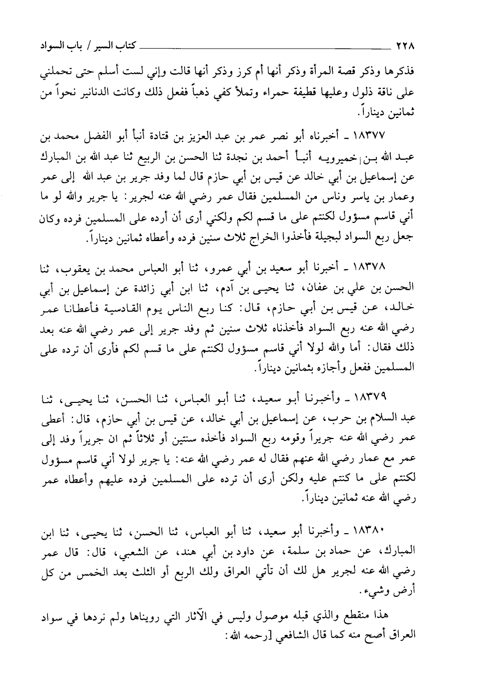 18377 - أَخْبَرَنَاهُ أَبُو نَصْرٍ عُمَرُ بْنُ عَبْدِ الْعَزِيزِ بْنِ قَتَادَةَ , أنبأ أَبُو الْفَضْلِ مُحَمَّدُ بْنُ عَبْدِ اللهِ بْنِ خَمِيرَوَيْهِ , أنبأ أَحْمَدُ بْنُ نَجْدَةَ، ثنا الْحَسَنُ بْنُ الرَّبِيعِ، ثنا عَبْدُ اللهِ بْنُ الْمُبَارَكِ، عَنْ إِسْمَاعِيلَ بْنِ أَبِي خَالِدٍ، عَنْ قَيْسِ بْنِ أَبِي حَازِمٍ، قَالَ: لَمَّا وَفَدَ جَرِيرُ بْنُ عَبْدِ اللهِ إِلَى عُمَرَ وَعَمَّارِ بْنِ يَاسِرٍ وَنَاسٍ مِنَ الْمُسْلِمِينَ فَقَالَ عُمَرُ رَضِيَ اللهُ عَنْهُ لِجَرِيرٍ: يَا جَرِيرُ وَاللهِ §لَوْمَا أَنِّي قَاسِمٌ مَسئُولٌ لَكُنْتُمْ عَلَى مَا قُسِمَ لَكُمْ , وَلَكِنِّي أَرَى أَنْ أَرُدَّهُ عَلَى الْمُسْلِمِينَ. فَرَدَّهُ وَكَانَ جَعَلَ رُبْعَ السَّوَادِ لِبَجِيلَةَ فَأَخَذُوا الْخَرَاجَ ثَلَاثَ سِنِينَ , فَرَدَّهُ وَأَعْطَاهُ ثَمَانِينَ دِينَارًا