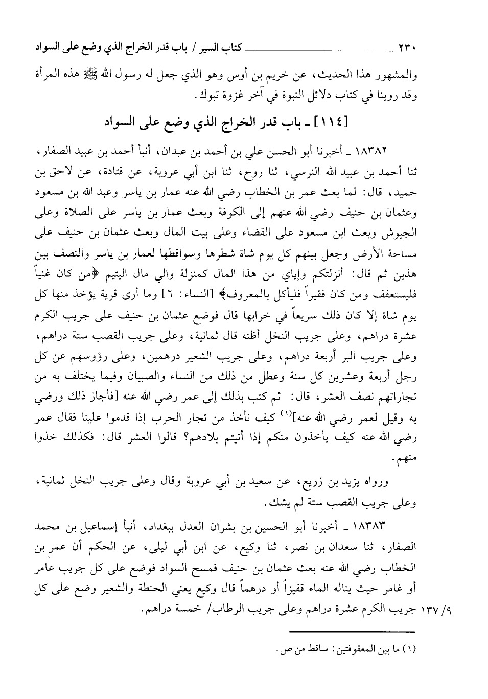 18383 - أَخْبَرَنَا أَبُو الْحُسَيْنِ بْنُ بِشْرَانَ الْعَدْلُ بِبَغْدَادَ , أنبأ إِسْمَاعِيلُ بْنُ مُحَمَّدٍ الصَّفَّارُ، ثنا سَعْدَانُ بْنُ نَصْرٍ، ثنا وَكِيعٌ، عَنِ ابْنِ أَبِي لَيْلَى، عَنِ الْحَكَمِ، أَنَّ عُمَرَ بْنَ الْخَطَّابِ رَضِيَ اللهُ عَنْهُ §بَعَثَ عُثْمَانَ بْنَ حُنَيْفٍ فَمَسَحَ السَّوَادَ فَوَضَعَ عَلَى كُلِّ جَرِيبٍ عَامِرٍ أَوْ غَامِرٍ حَيْثُ يَنَالُهُ الْمَاءُ قَفِيزًا أَوْ دِرْهَمًا , قَالَ وَكِيعٌ: يَعْنِي الْحِنْطَةَ وَالشَّعِيرَ وَضَعَ عَلَى كُلِّ جَرِيبِ الْكَرْمِ عَشَرَةَ دَرَاهِمَ وَعَلَى جَرِيبِ الرِّطَابِ خَمْسَةَ دَرَاهِمَ