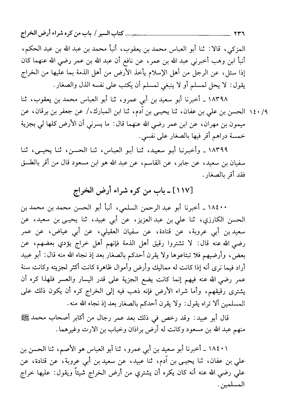 18401 - أَخْبَرَنَا أَبُو سَعِيدِ بْنُ أَبِي عَمْرٍو، ثنا أَبُو الْعَبَّاسِ هُوَ الْأَصَمُّ , ثنا الْحَسَنُ بْنُ عَلِيِّ بْنِ عَفَّانَ، ثنا يَحْيَى بْنُ آدَمَ، ثنا عُبَيْدٌ، عَنْ سَعِيدِ بْنِ أَبِي عَرُوبَةَ، عَنْ قَتَادَةَ، عَنْ عَلِيٍّ رَضِيَ اللهُ عَنْهُ أَنَّهُ كَانَ §يَكْرَهُ أَنْ يَشْتَرِيَ مِنْ أَرْضِ الْخَرَاجِ شَيْئًا , وَيَقُولُ: عَلَيْهَا خَرَاجُ الْمُسْلِمِينَ"