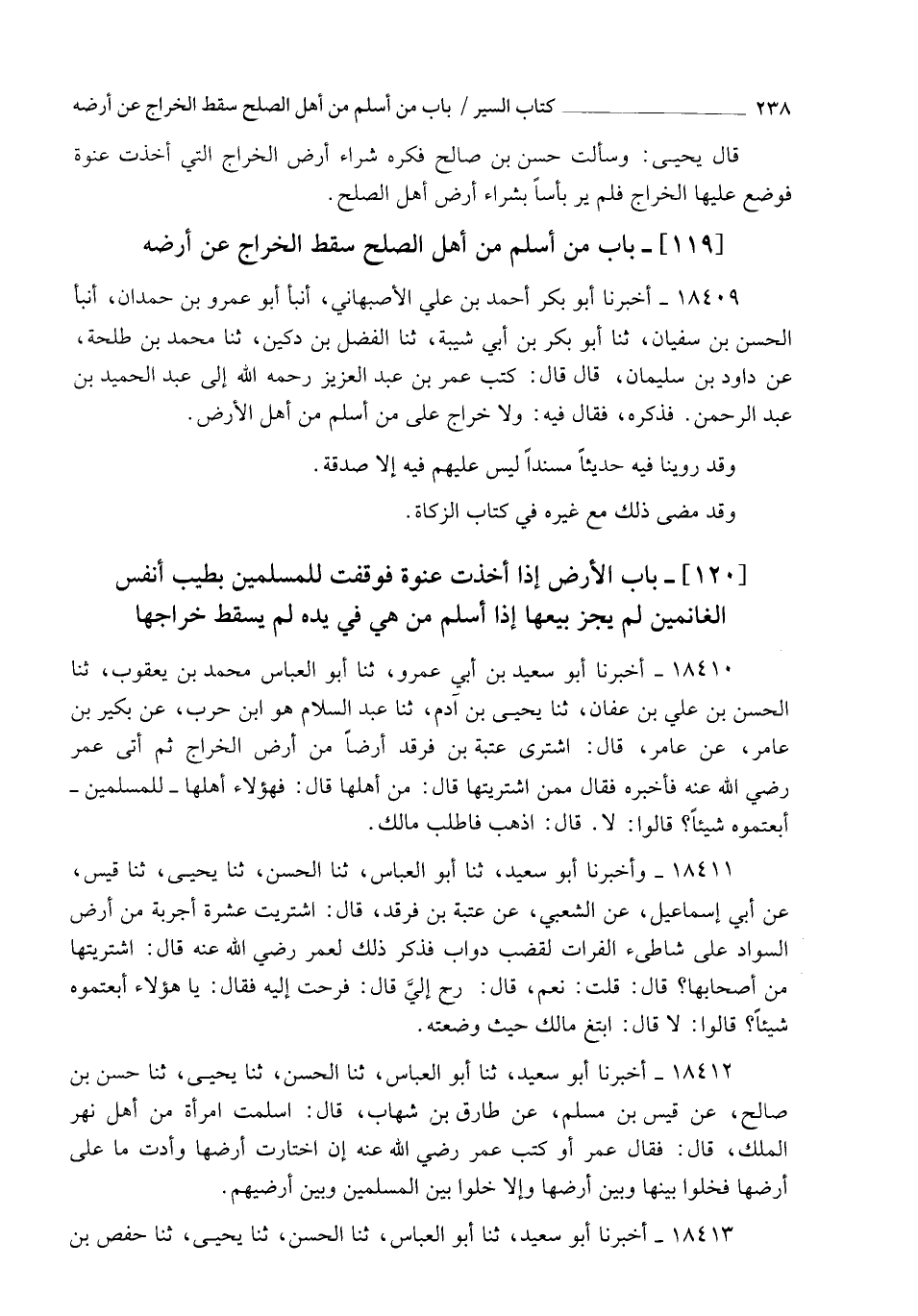 18410 - أَخْبَرَنَا أَبُو سَعِيدِ بْنُ أَبِي عَمْرٍو، ثنا أَبُو الْعَبَّاسِ مُحَمَّدُ بْنُ يَعْقُوبَ , ثنا الْحَسَنُ بْنُ عَلِيِّ بْنِ عَفَّانَ، ثنا يَحْيَى بْنُ آدَمَ، ثنا عَبْدُ السَّلَامِ هُوَ ابْنُ حَرْبٍ , عَنْ بُكَيْرِ بْنِ عَامِرٍ، عَنْ عَامِرٍ، قَالَ: §اشْتَرَى عُتْبَةُ بْنُ فَرْقَدٍ أَرْضًا مِنْ أَرْضِ الْخَرَاجِ ثُمَّ أَتَى عُمَرَ رَضِيَ اللهُ عَنْهُ فَأَخْبَرَهُ فَقَالَ: مِمَّنِ اشْتَرَيْتَهَا؟ قَالَ: مِنْ أَهْلِهَا. قَالَ: فَهَؤُلَاءِ أَهْلُهَا - لِلْمُسْلِمِينَ - أَبِعْتُمُوهُ شَيْئًا؟ قَالُوا: لَا. قَالَ: اذْهَبْ فَاطْلُبْ مَالَكَ