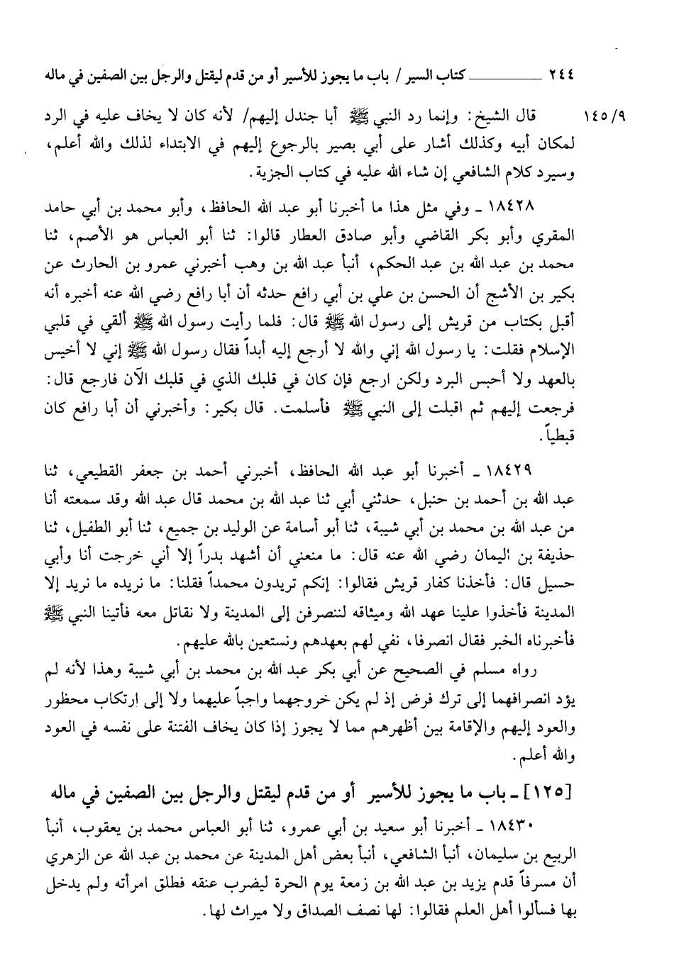 18429 - أَخْبَرَنَا أَبُو عَبْدِ اللهِ الْحَافِظُ، أَخْبَرَنِي أَحْمَدُ بْنُ جَعْفَرٍ الْقَطِيعِيُّ، ثنا عَبْدُ اللهِ بْنُ أَحْمَدَ بْنِ حَنْبَلٍ، حَدَّثَنِي أَبِي، ثنا عَبْدُ اللهِ بْنُ مُحَمَّدٍ , قَالَ عَبْدُ اللهِ: وَقَدْ سَمِعْتُهُ أَنَا مِنْ عَبْدِ اللهِ بْنِ مُحَمَّدِ بْنِ أَبِي شَيْبَةَ، ثنا أَبُو أُسَامَةَ، عَنِ الْوَلِيدِ بْنِ جُمَيْعٍ، ثنا أَبُو الطُّفَيْلِ، ثنا حُذَيْفَةُ بْنُ الْيَمَانِ رَضِيَ اللهُ عَنْهُ قَالَ: مَا مَنَعَنِي أَنْ أَشْهَدَ بَدْرًا إِلَّا أَنِّي خَرَجْتُ أَنَا وَأَبِي حُسَيْلٍ. قَالَ: فَأَخَذَنَا كُفَّارُ قُرَيْشٍ فَقَالُوا: إِنَّكُمْ تُرِيدُونَ مُحَمَّدًا , فَقُلْنَا: مَا نُرِيدُهُ مَا نُرِيدُ إِلَّا الْمَدِينَةَ فَأَخَذُوا عَلَيْنَا عَهْدَ اللهِ وَمِيثَاقَهُ لَنَنْصَرِفَنَّ إِلَى الْمَدِينَةِ وَلَا نُقَاتِلُ مَعَهُ , فَأَتَيْنَا النَّبِيَّ صَلَّى اللهُ عَلَيْهِ وَسَلَّمَ فَأَخْبَرْنَاهُ الْخَبَرَ فَقَالَ: " انْصَرِفَا، §نَفِي لَهُمْ بِعَهْدِهِمْ، وَنَسْتَعِينُ بِاللهِ عَلَيْهِمْ " رَوَاهُ مُسْلِمٌ فِي الصَّحِيحِ عَنْ أَبِي بَكْرٍ عَبْدِ اللهِ بْنِ مُحَمَّدِ بْنِ أَبِي شَيْبَةَ , وَهَذَا لِأَنَّهُ لَمْ يُؤَدِّ انْصِرَافُهُمَا إِلَى تَرْكِ فَرْضٍ إِذْ لَمْ يَكُنْ خُرُوجُهُمَا وَاجِبًا عَلَيْهِمَا , وَلَا إِلَى ارْتِكَابِ مَحْظُورٍ , وَالْعَوْدُ إِلَيْهِمْ وَالْإِقَامَةُ بَيْنَ أَظْهُرِهِمْ مِمَّا لَا يَجُوزُ إِذَا كَانَ يَخَافُ الْفِتْنَةَ عَلَى نَفْسِهِ فِي الْعَوْدِ , وَاللهُ أَعْلَمُ