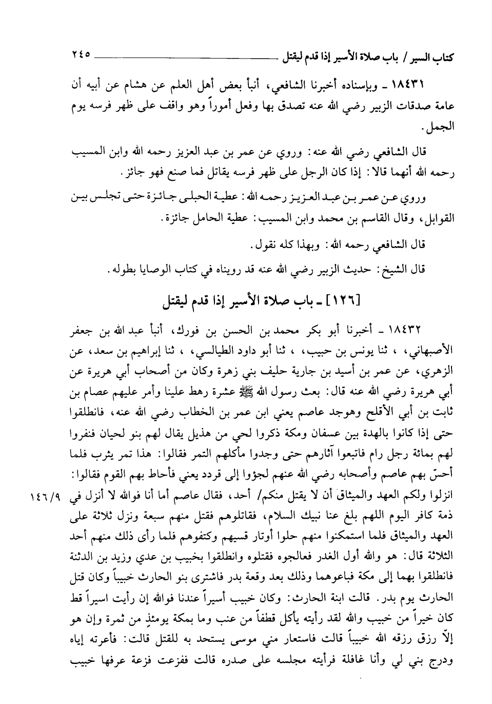 18431 - وَبِإِسْنَادِهِ أَخْبَرَنَا الشَّافِعِيُّ، أنبأ بَعْضُ أَهْلِ الْعِلْمِ عَنْ هِشَامٍ، عَنْ أَبِيهِ، أَنَّ §عَامَّةَ صَدَقَاتِ الزُّبَيْرِ رَضِيَ اللهُ عَنْهُ تَصَدَّقَ بِهَا وَفَعَلَ أُمُورًا وَهُوَ وَاقِفٌ عَلَى ظَهْرِ فَرَسِهِ يَوْمَ الْجَمَلِ. قَالَ الشَّافِعِيُّ رَضِيَ اللهُ عَنْهُ: وَرُوِيَ عَنْ عُمَرَ بْنِ عَبْدِ الْعَزِيزِ رَحِمَهُ اللهُ وَابْنِ الْمُسَيِّبِ رَحِمَهُ اللهُ أَنَّهُمَا قَالَا: إِذَا كَانَ الرَّجُلُ عَلَى ظَهْرِ فَرَسِهِ يُقَاتِلُ فَمَا صَنَعَ فَهُوَ جَائِزٌ. وَرُوِي عَنْ عُمَرَ بْنِ عَبْدِ الْعَزِيزِ رَحِمَهُ اللهُ: عَطِيَّةُ الْحُبْلَى جَائِزَةٌ حَتَّى تَجْلِسَ بَيْنَ الْقَوَابِلِ. وَقَالَ الْقَاسِمُ بْنُ مُحَمَّدٍ وَابْنُ الْمُسَيِّبِ: عَطِيَّةُ الْحَامِلِ جَائِزَةٌ. قَالَ الشَّافِعِيُّ رَحِمَهُ اللهُ: وَبِهَذَا كُلِّهِ نَقُولُ. قَالَ الشَّيْخُ: حَدِيثُ الزُّبَيْرِ رَضِيَ اللهُ عَنْهُ قَدْ رَوَيْنَاهُ فِي كِتَابِ الْوَصَايَا بِطُولِهِ