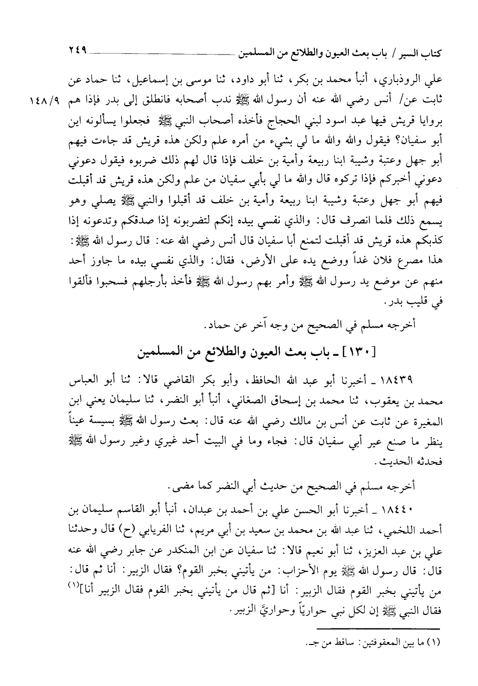 18439 - أَخْبَرَنَا أَبُو عَبْدِ اللهِ الْحَافِظُ، وَأَبُو بَكْرٍ الْقَاضِي قَالَا: ثنا أَبُو الْعَبَّاسِ مُحَمَّدُ بْنُ يَعْقُوبَ , ثنا مُحَمَّدُ بْنُ إِسْحَاقَ الصَّغَانِيُّ، أنبأ أَبُو النَّضْرِ، ثنا سُلَيْمَانُ يَعْنِي ابْنَ الْمُغِيرَةِ، عَنْ ثَابِتٍ، عَنْ أَنَسِ بْنِ مَالِكٍ رَضِيَ اللهُ عَنْهُ قَالَ: §بَعَثَ رَسُولُ اللهِ صَلَّى اللهُ عَلَيْهِ وَسَلَّمَ بُسَيْسَةَ عَيْنًا يَنْظُرُ مَا صَنَعَ عِيرُ أَبِي سُفْيَانَ. قَالَ: فَجَاءَ وَمَا فِي الْبَيْتِ أَحَدٌ غَيْرِي وَغَيْرُ رَسُولِ اللهِ صَلَّى اللهُ عَلَيْهِ وَسَلَّمَ، فَحَدَّثَهُ الْحَدِيثَ. أَخْرَجَهُ مُسْلِمٌ فِي الصَّحِيحِ مِنْ حَدِيثِ أَبِي النَّضْرِ كَمَا مَضَى